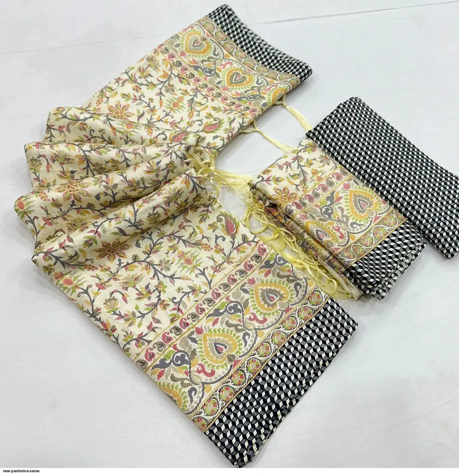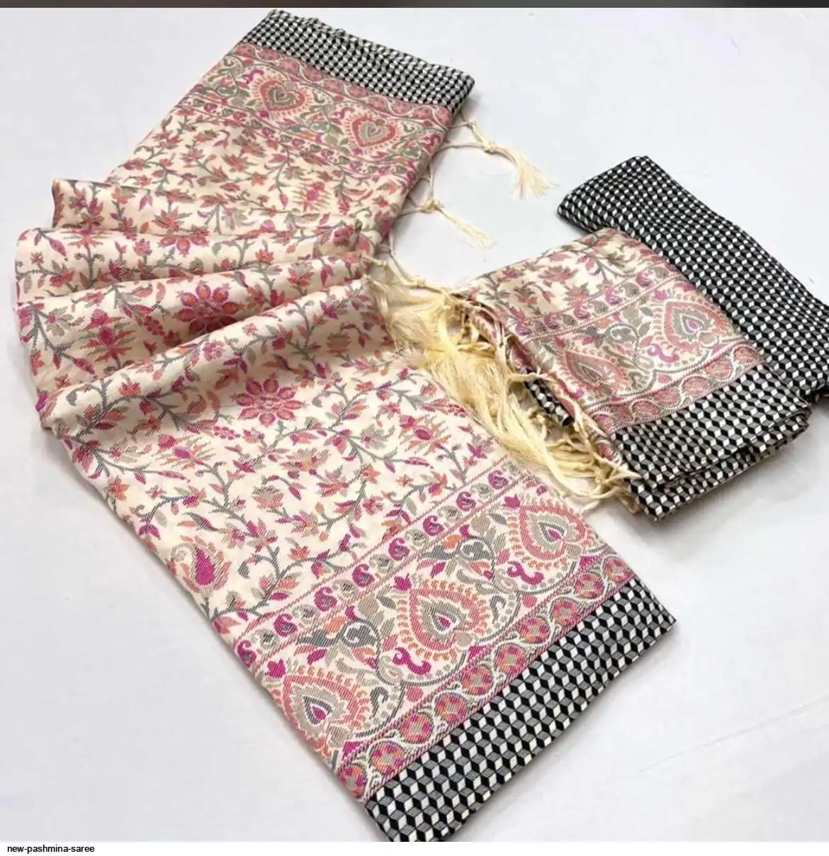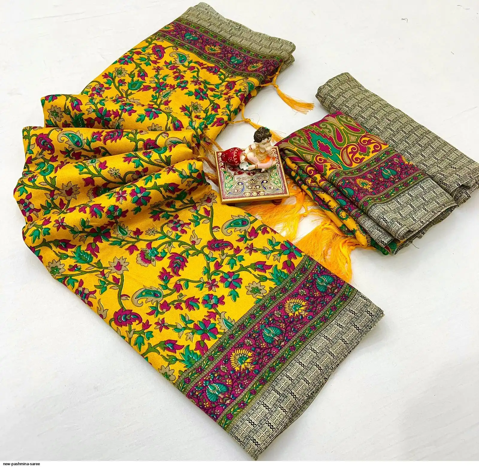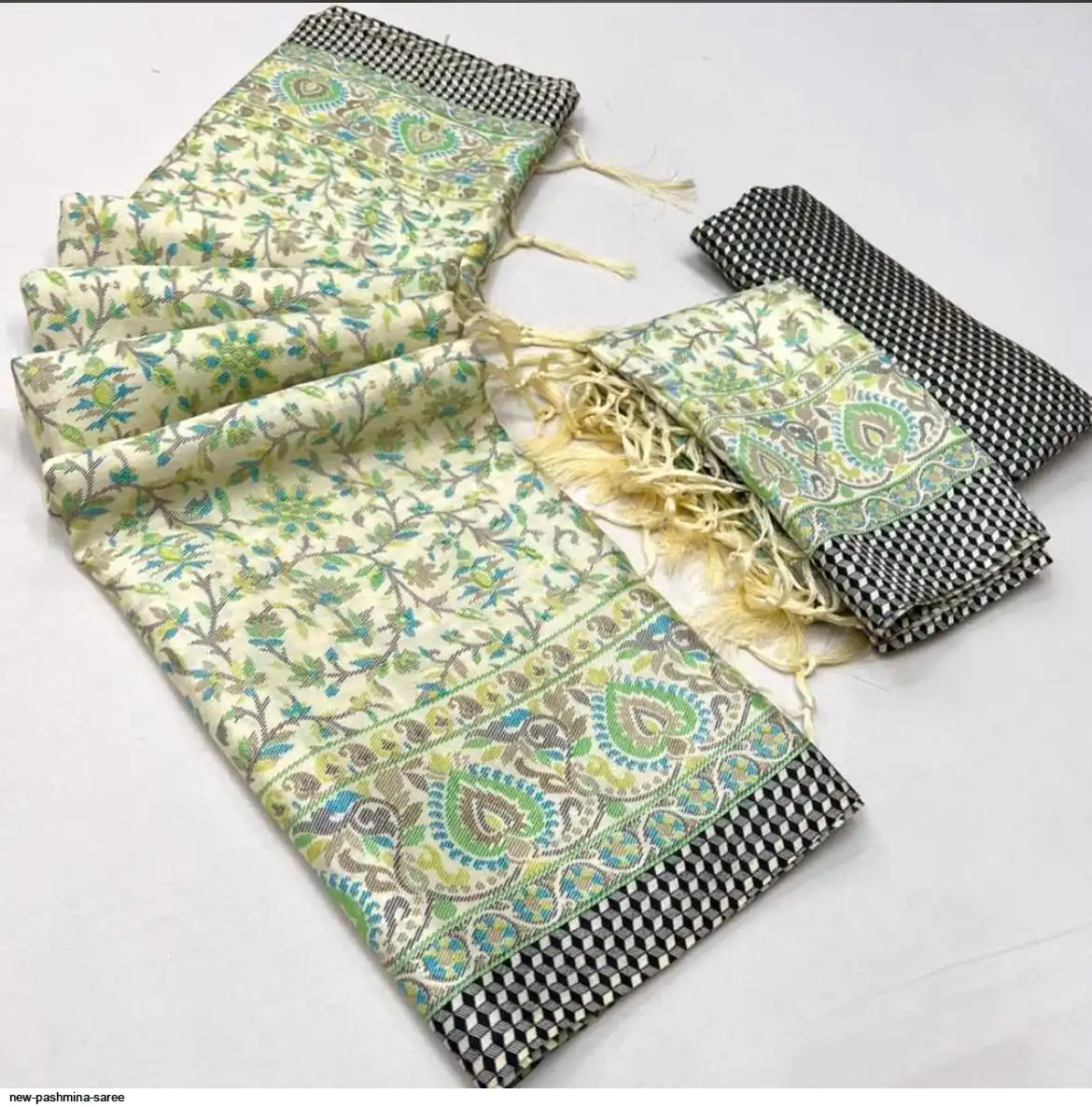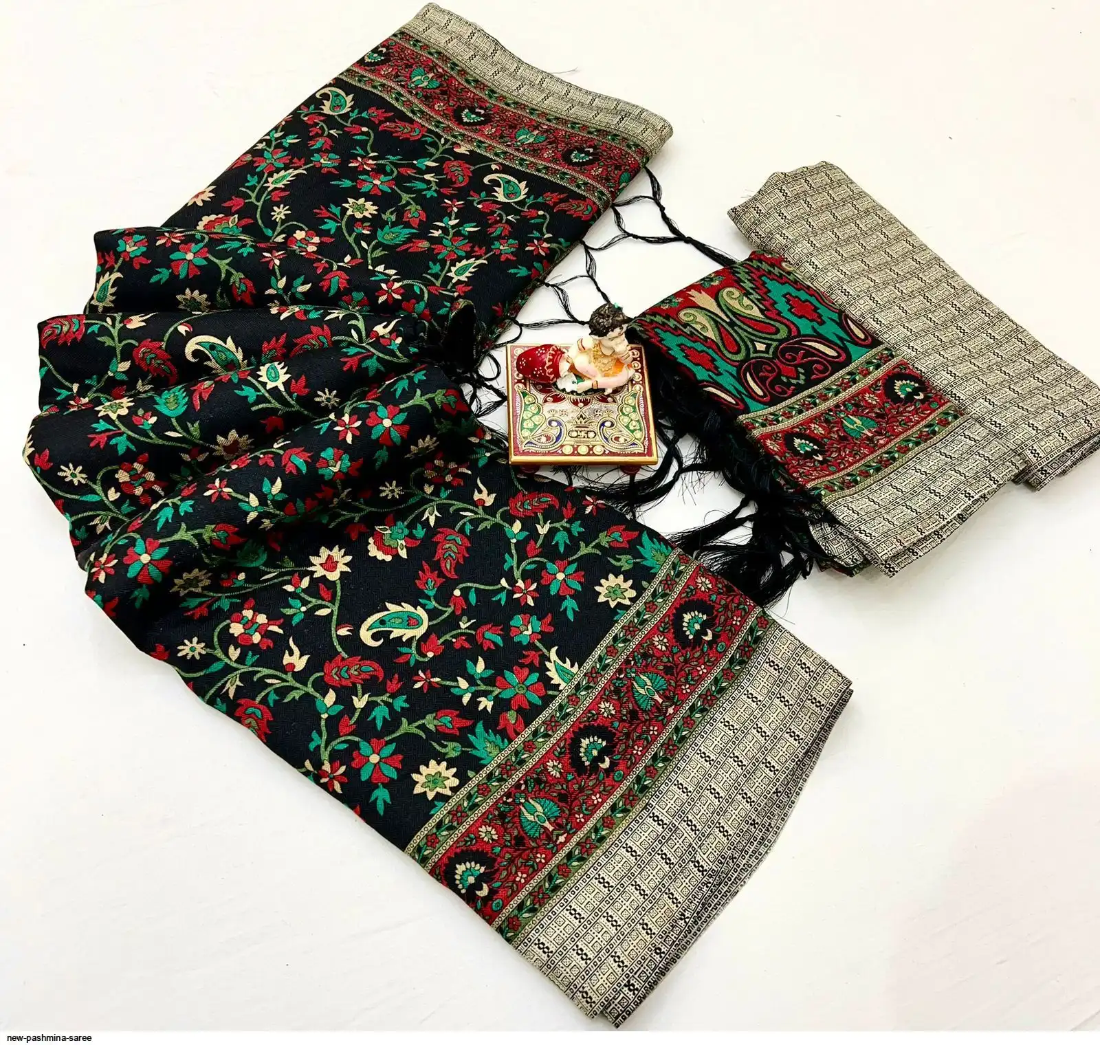 Pashmina Fabric Sarees With Running Blouse And Pashmina Shawl