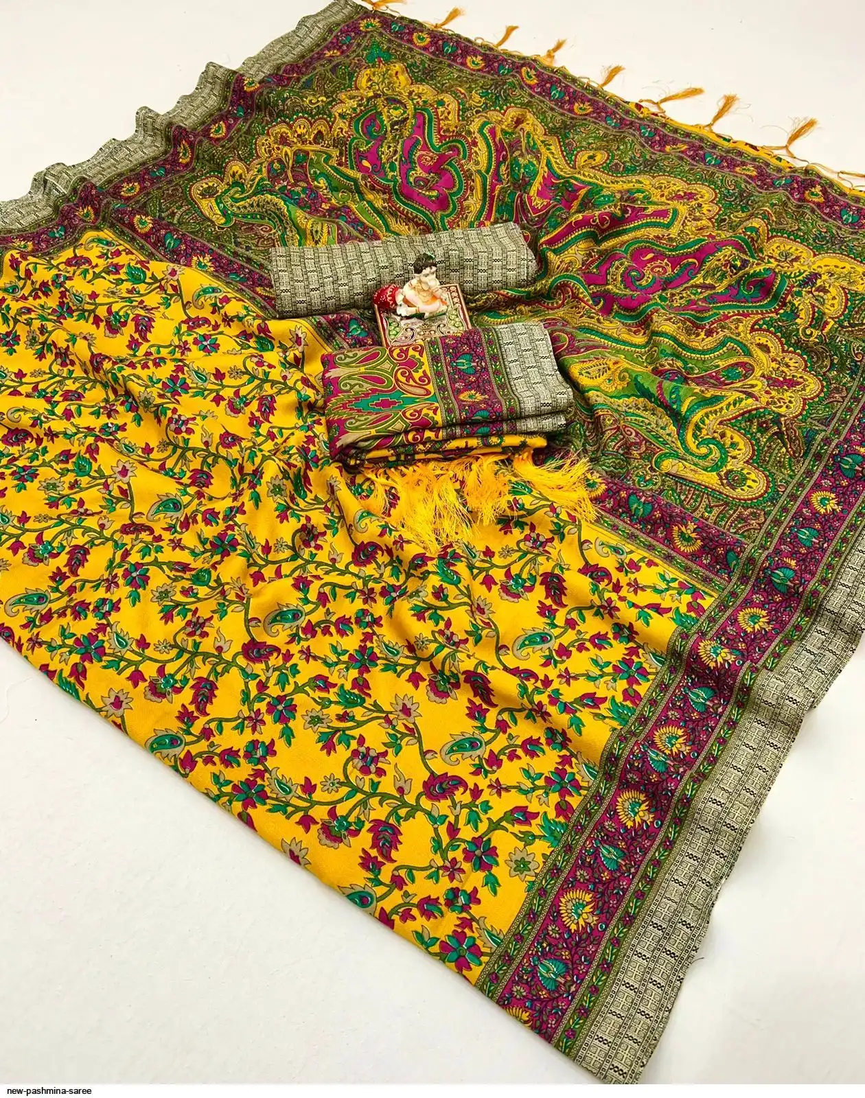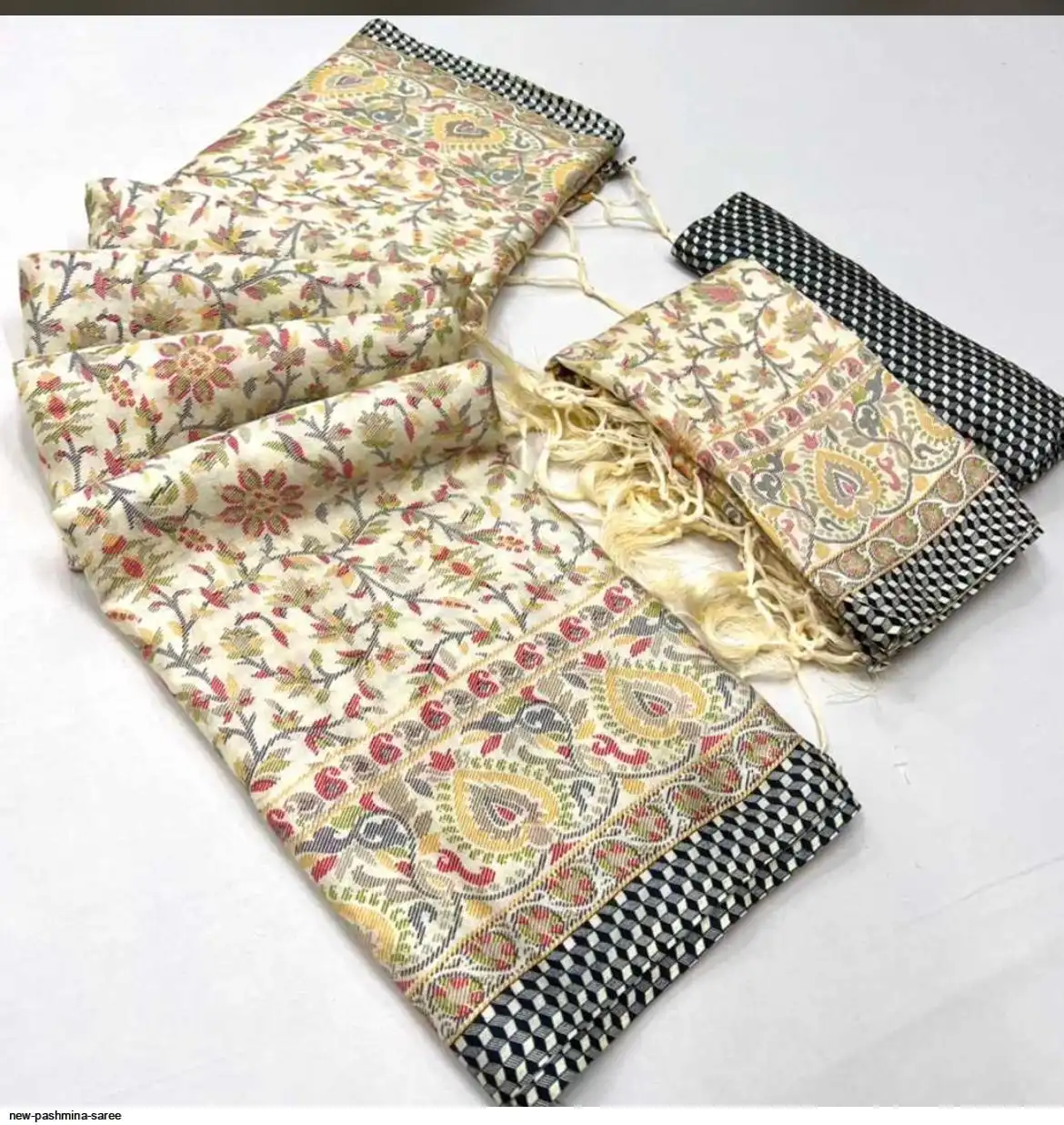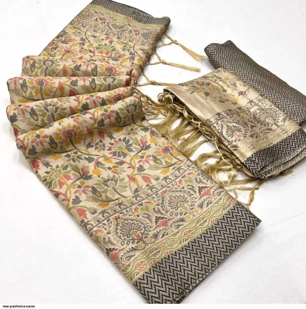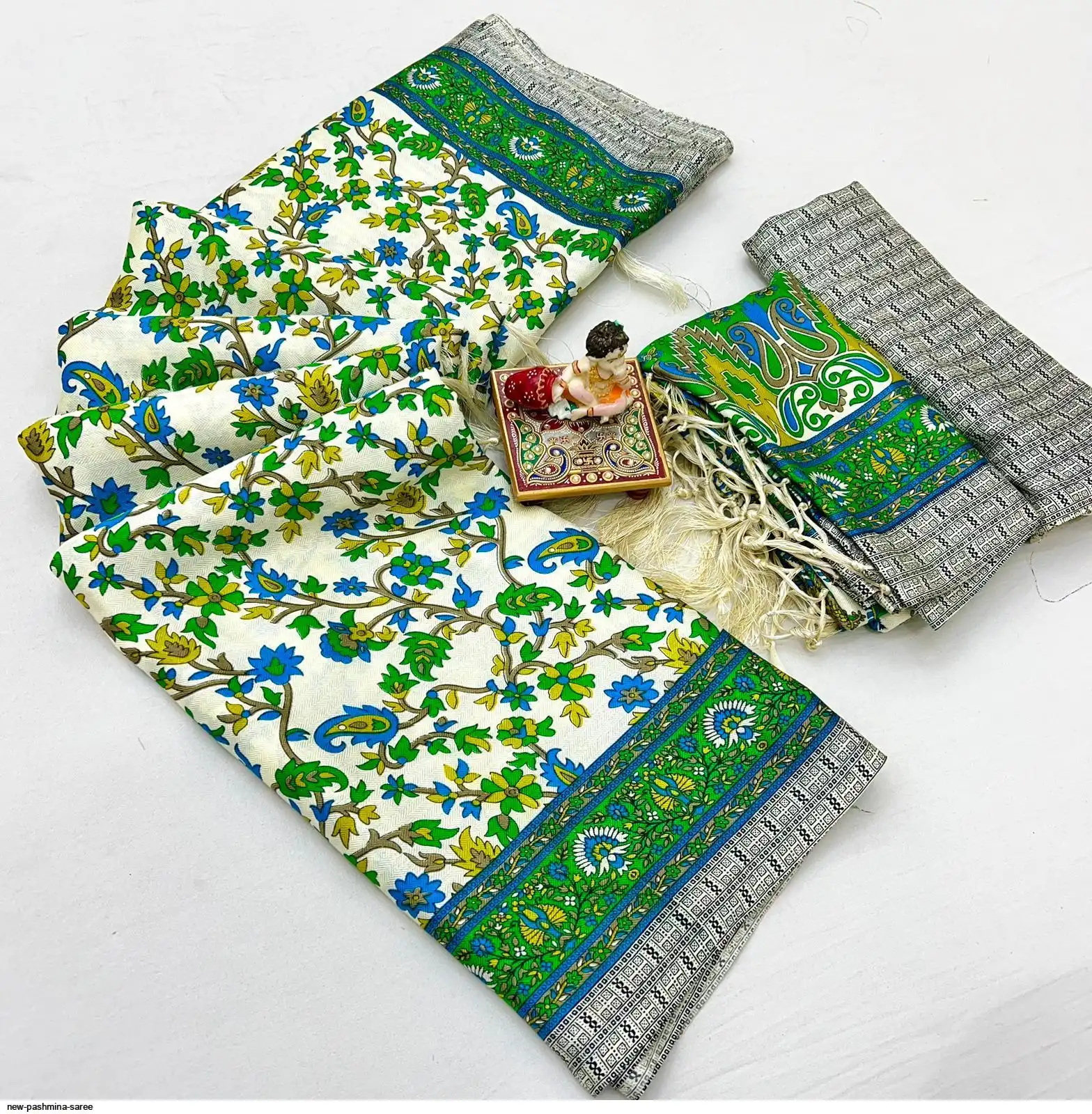 Pashmina Fabric Sarees With Running Blouse And Pashmina Shawl