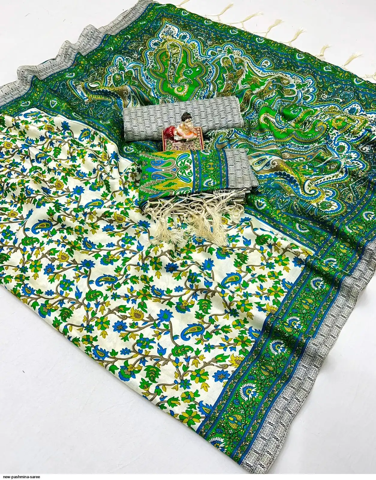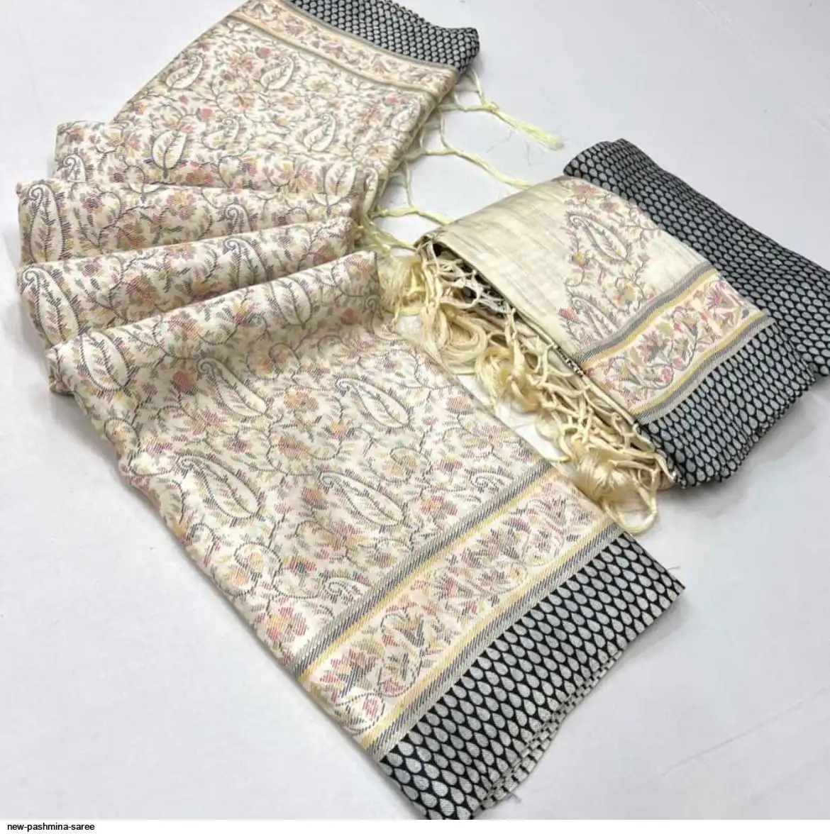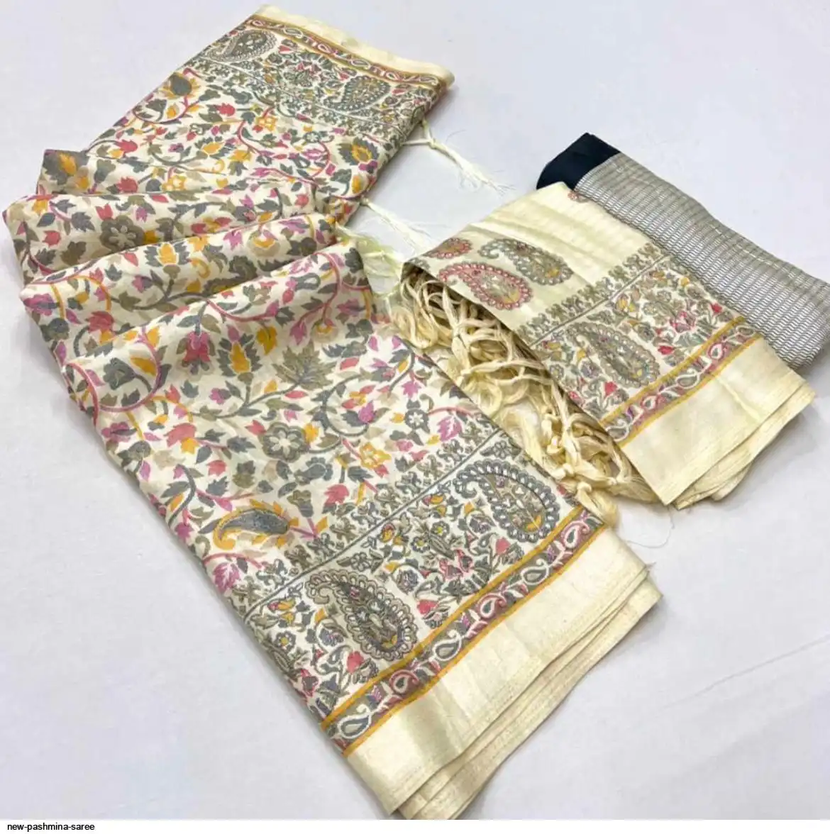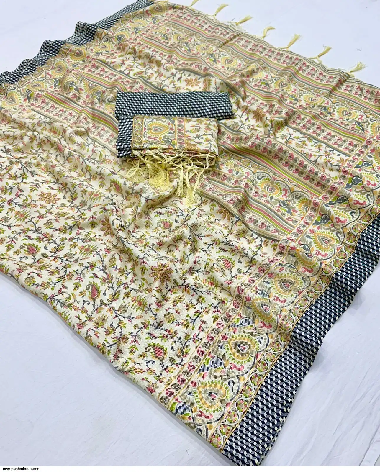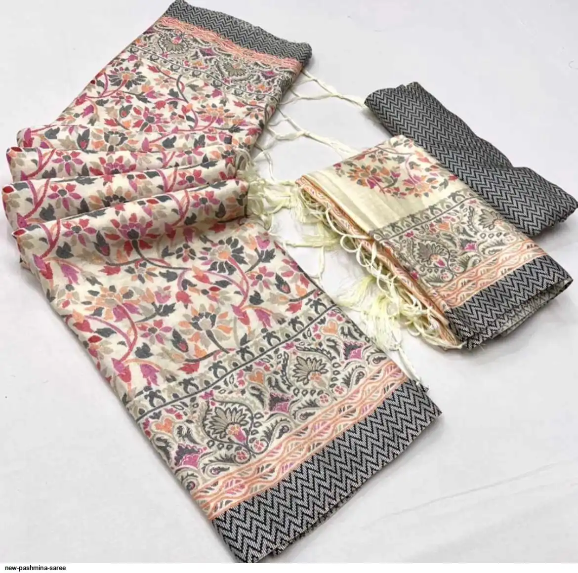 Pashmina Fabric Sarees With Running Blouse And Pashmina Shawl