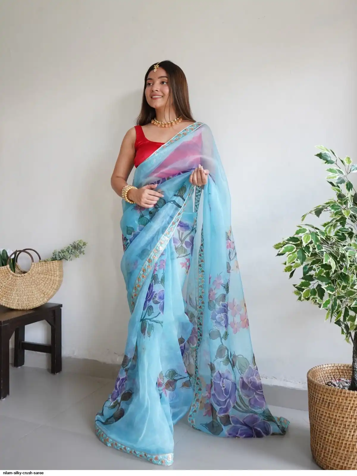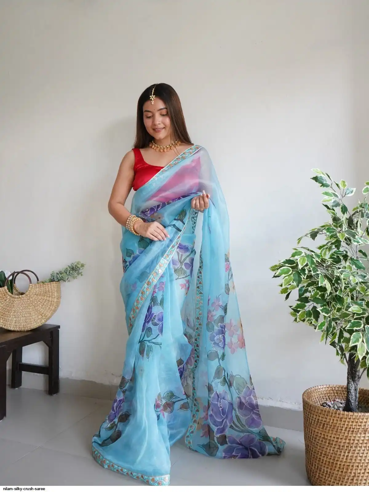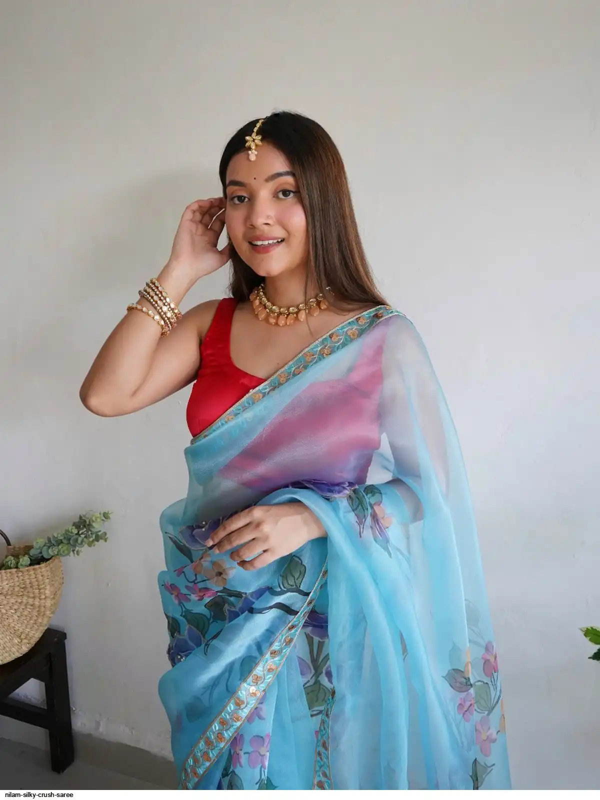 Work : Digital Printed With Hand Work & Lace Border with beglory satin silk blouse