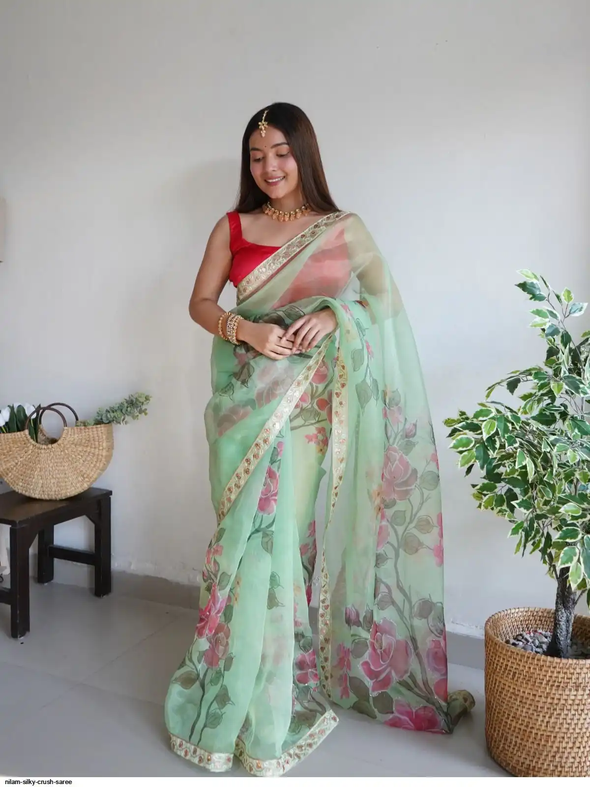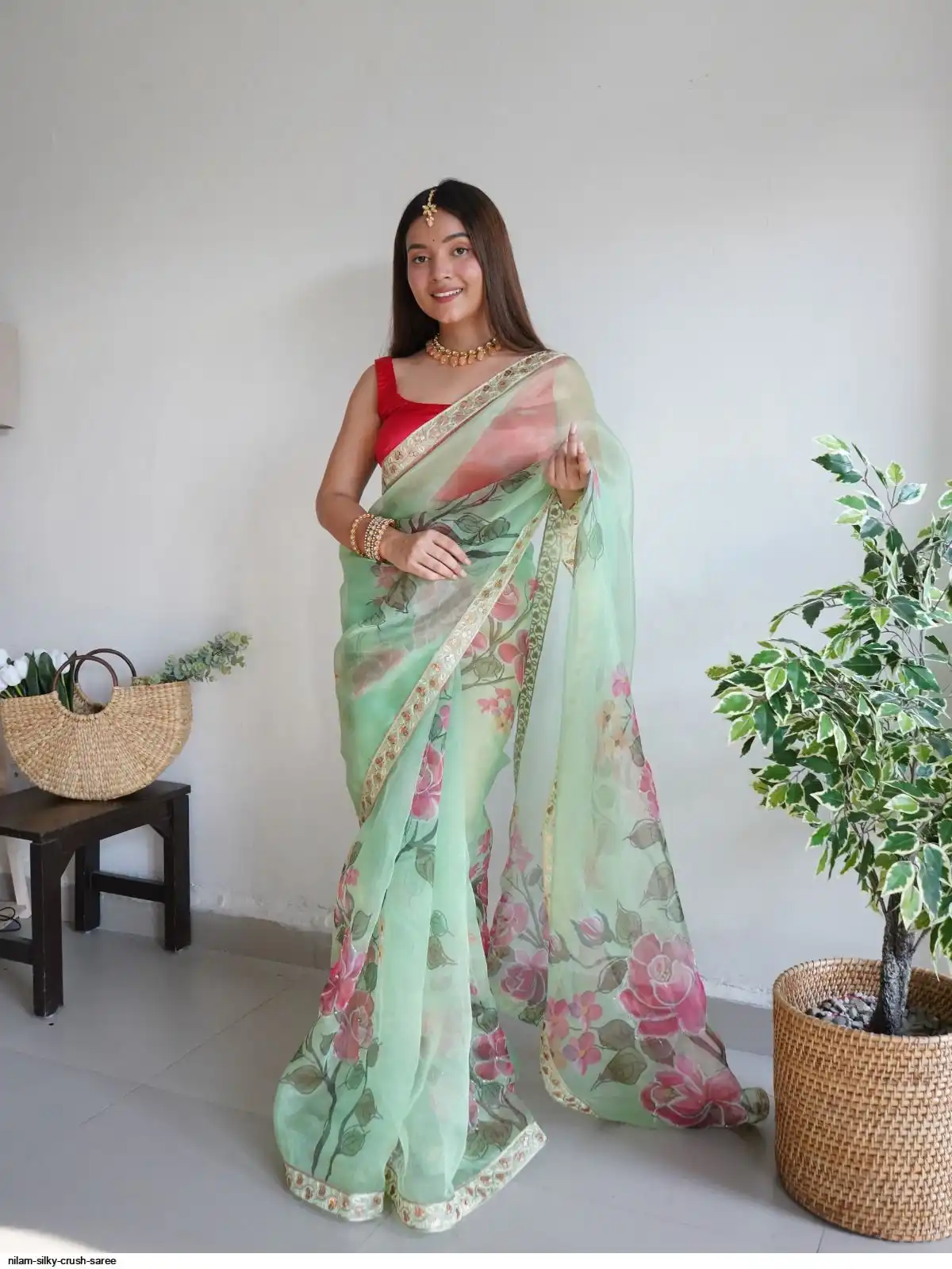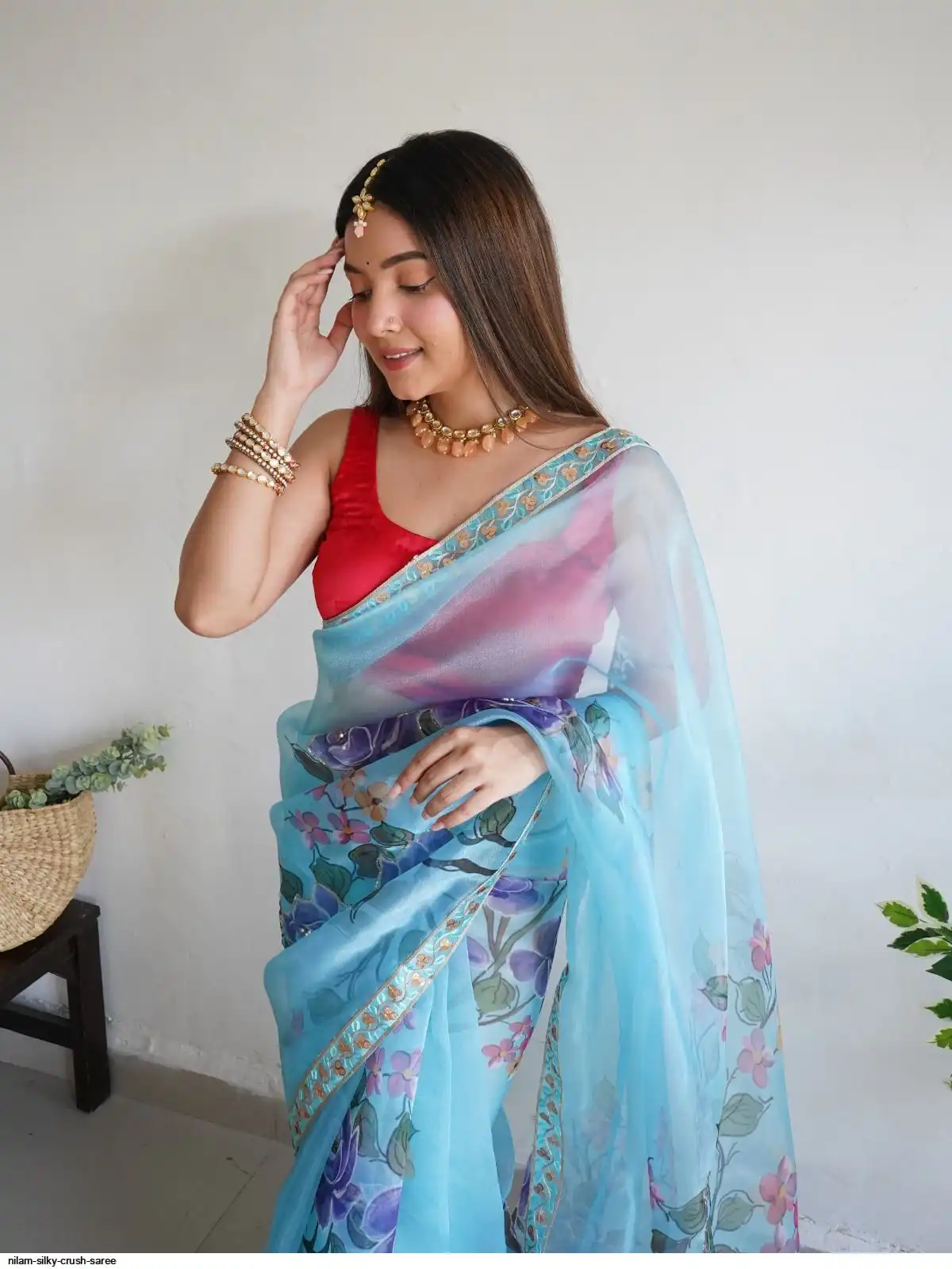 Work : Digital Printed With Hand Work & Lace Border with beglory satin silk blouse