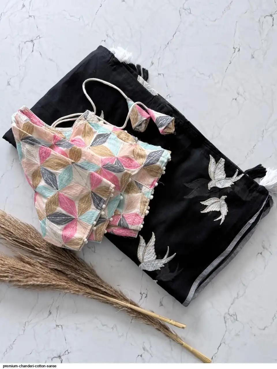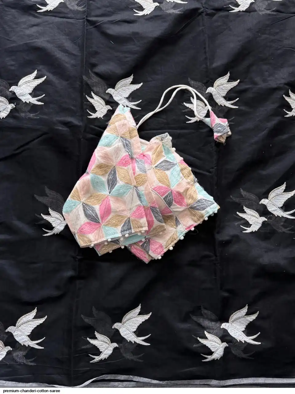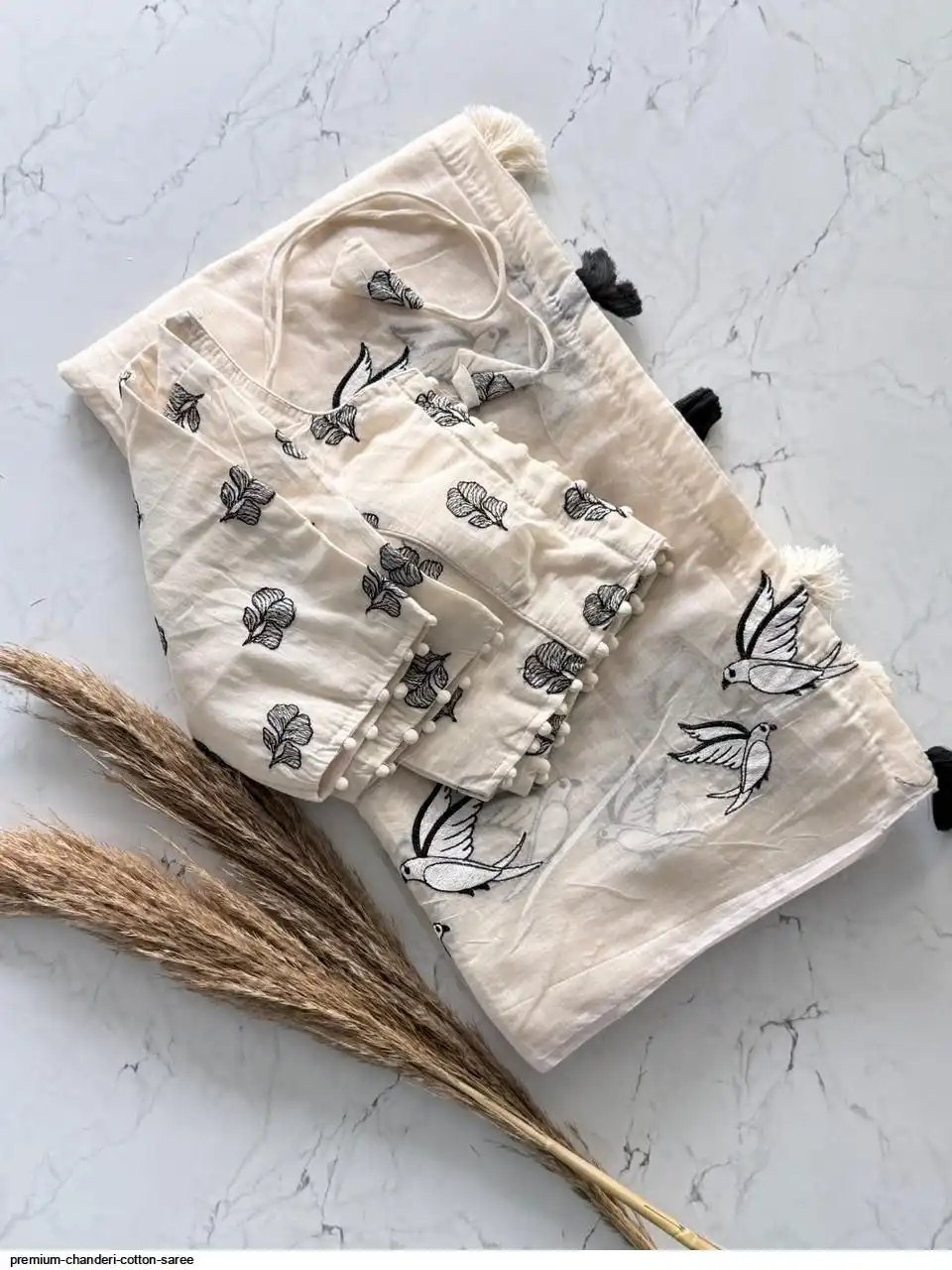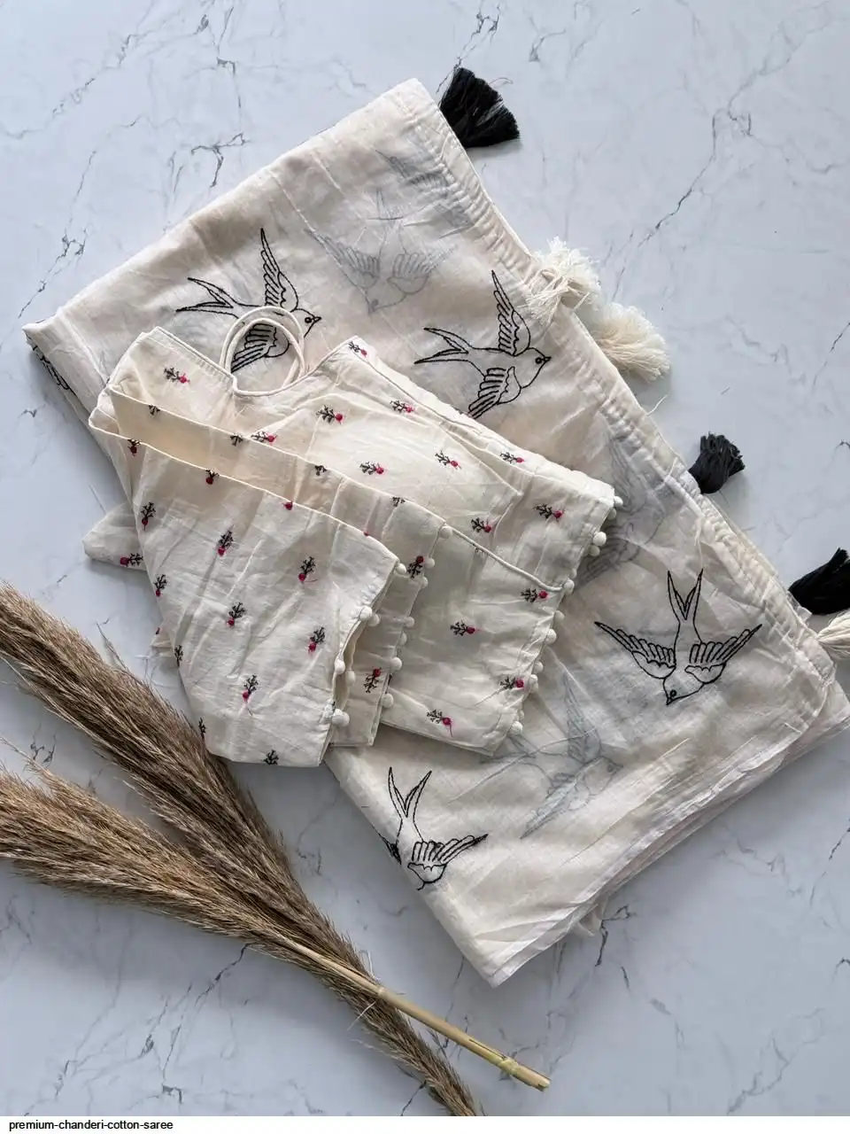 Primium Chanderi Cotton Saree With Multy Thread Eagle Work And Cotton Tussles