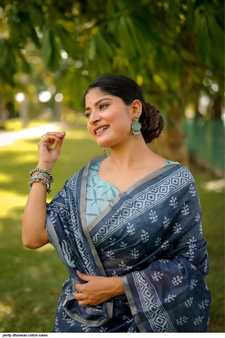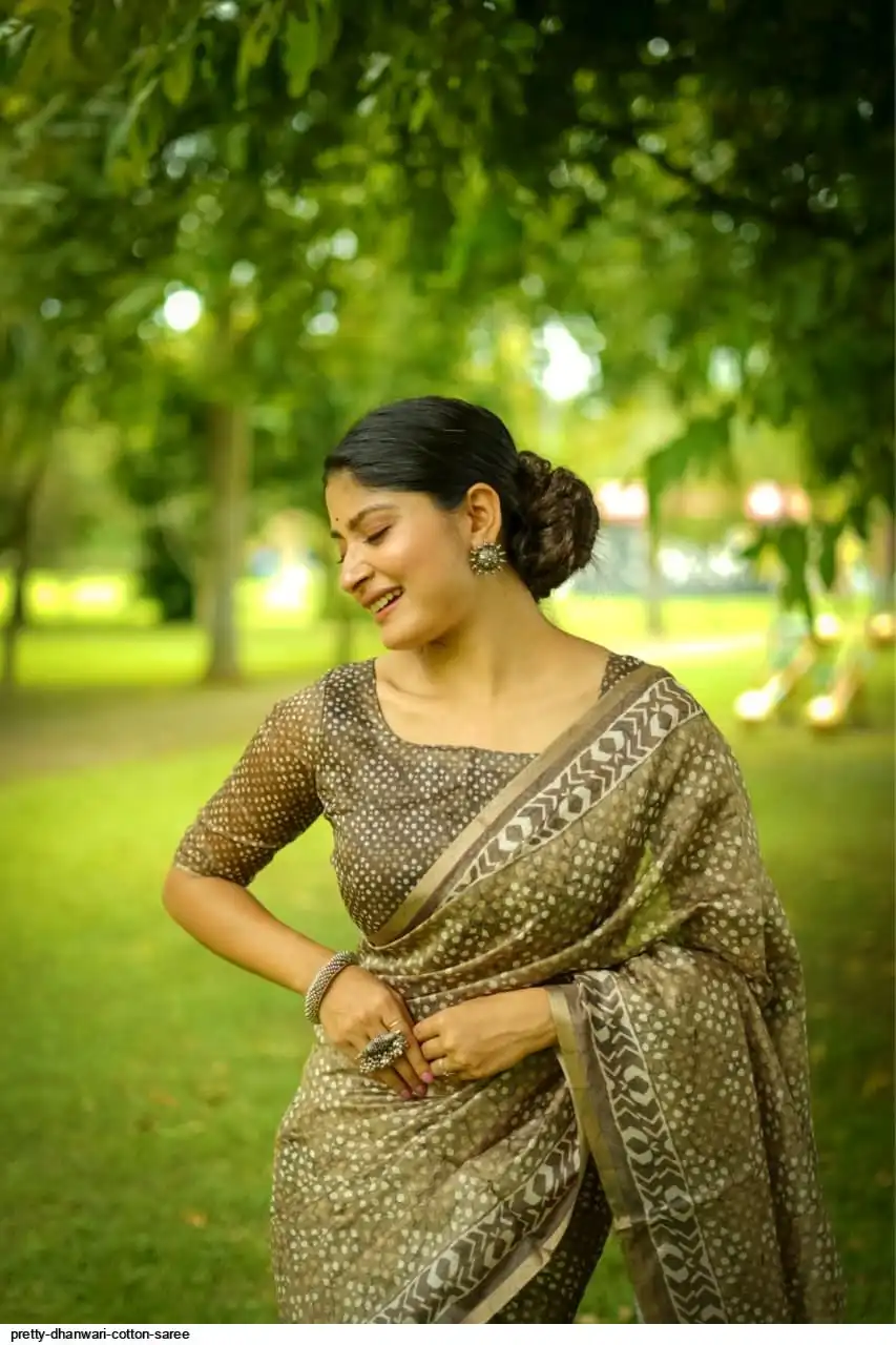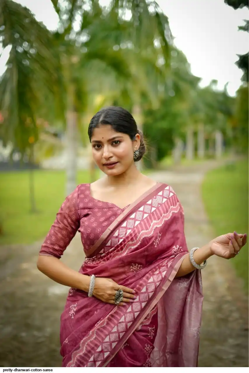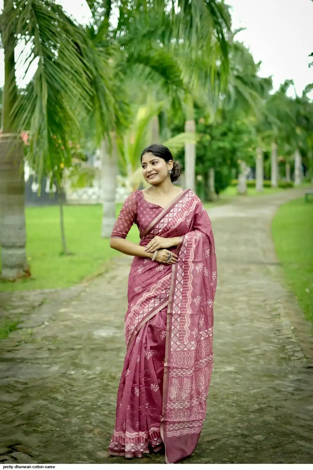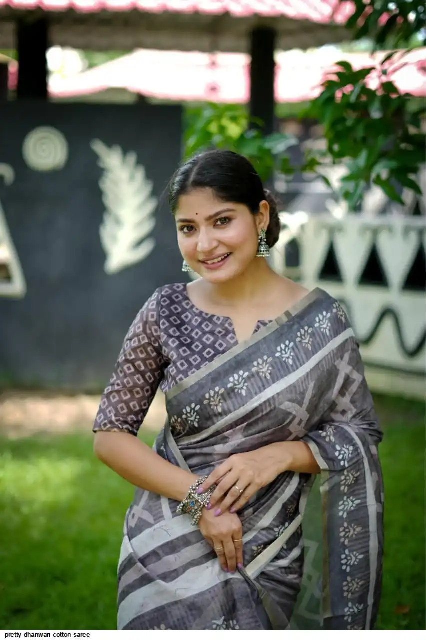 VERY SOFT AND PRETTY FEEL DHANWARI COTTON SAREE WITH TRADITIONAL DIGITAL BLOCK PRINT CATALOGUE AND TINY ZARI BORDER WITH CONTRAST BLOUSE PIECE