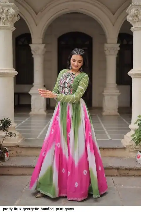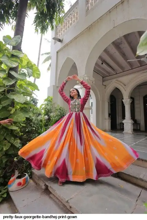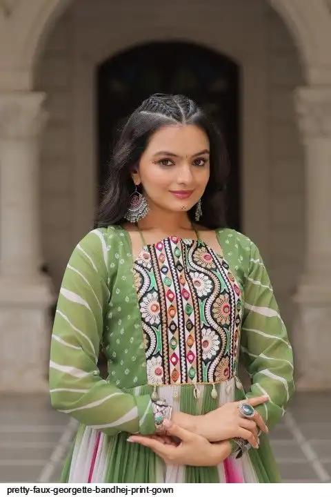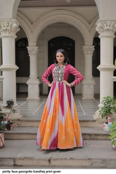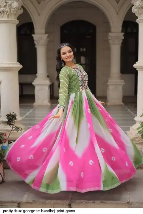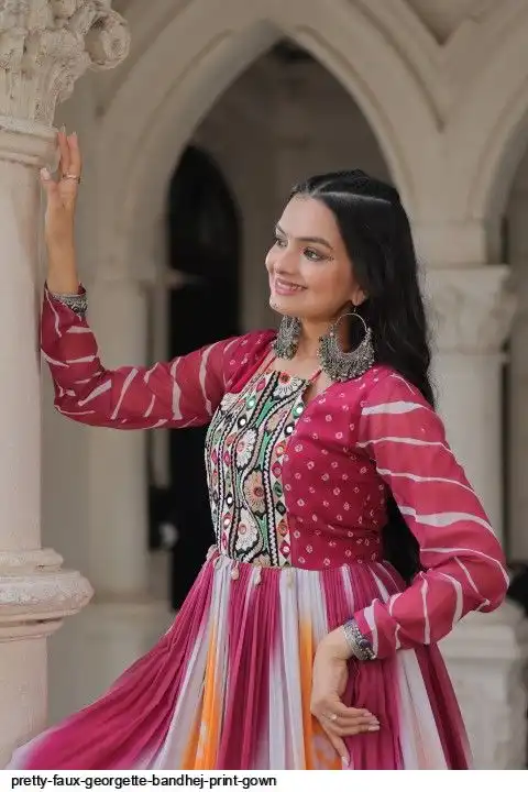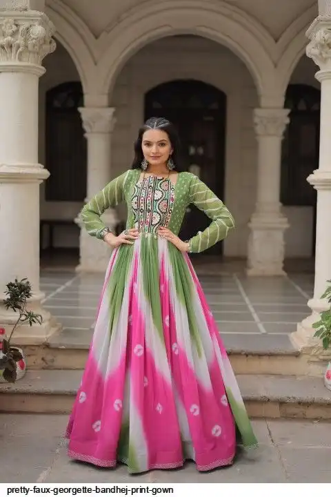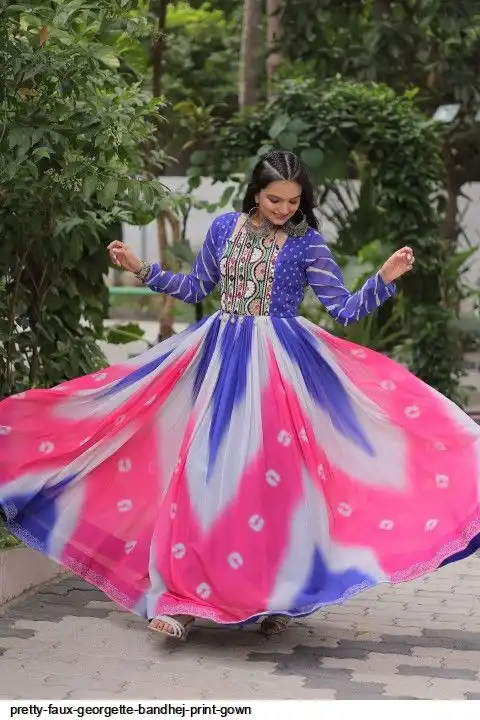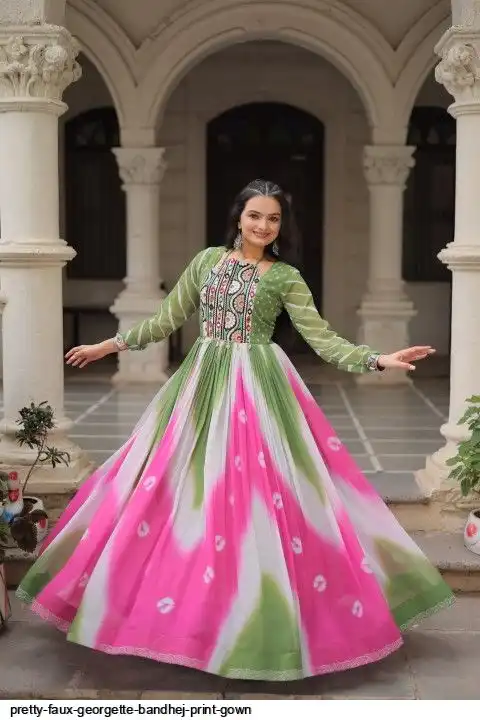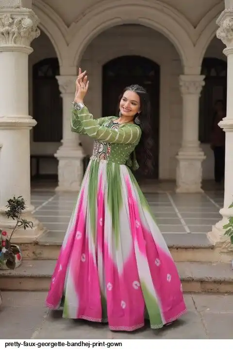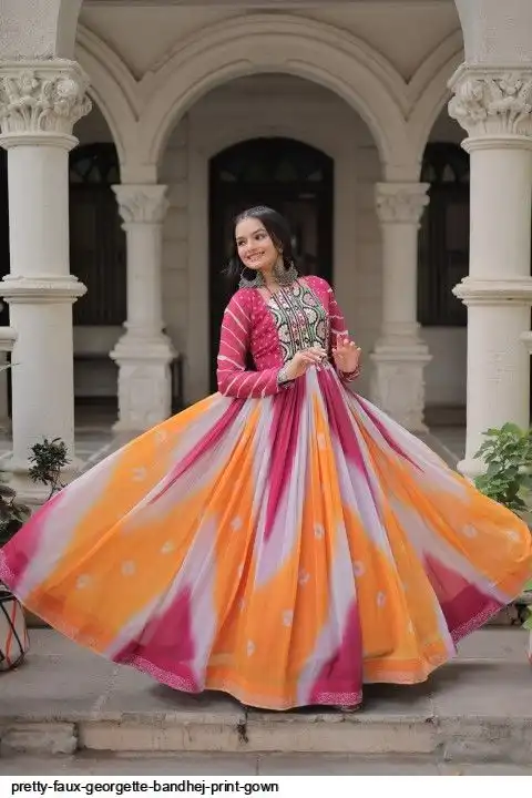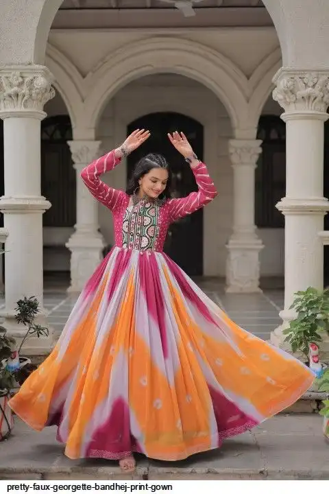 👉🏻 FABRICS & WORK :- Faux Georgette Bandhej Print With Gamthi Embroidered & Mirror embellished Work
