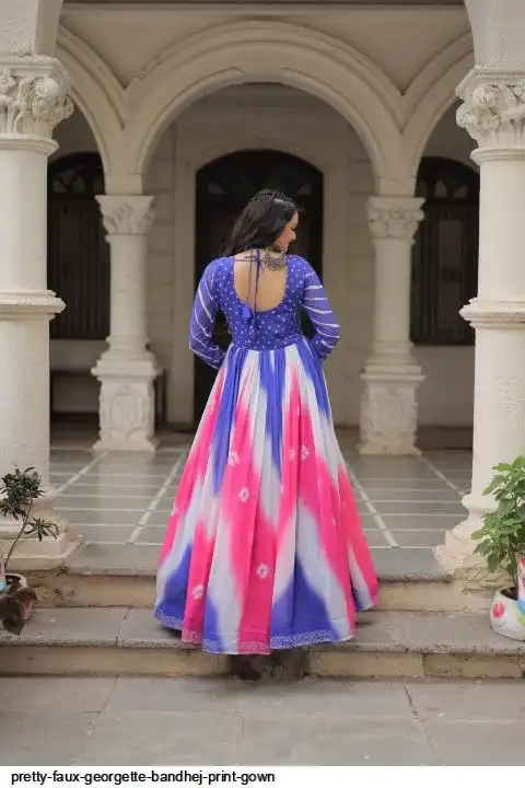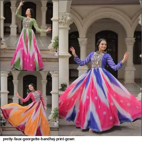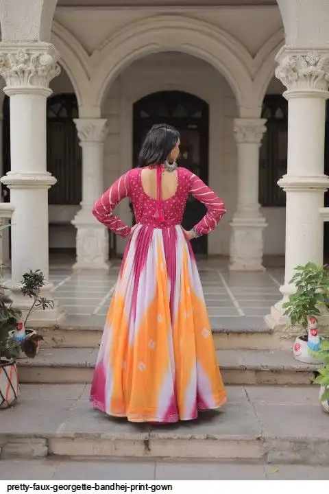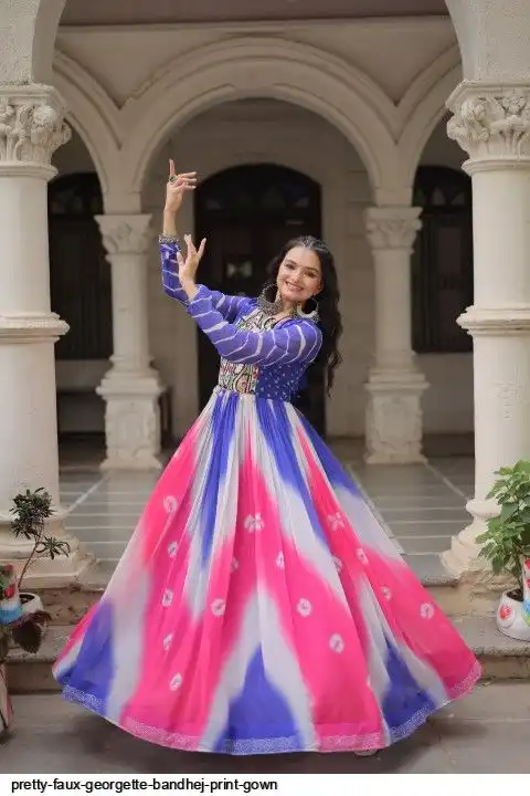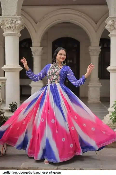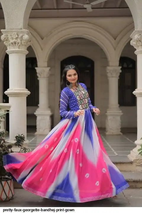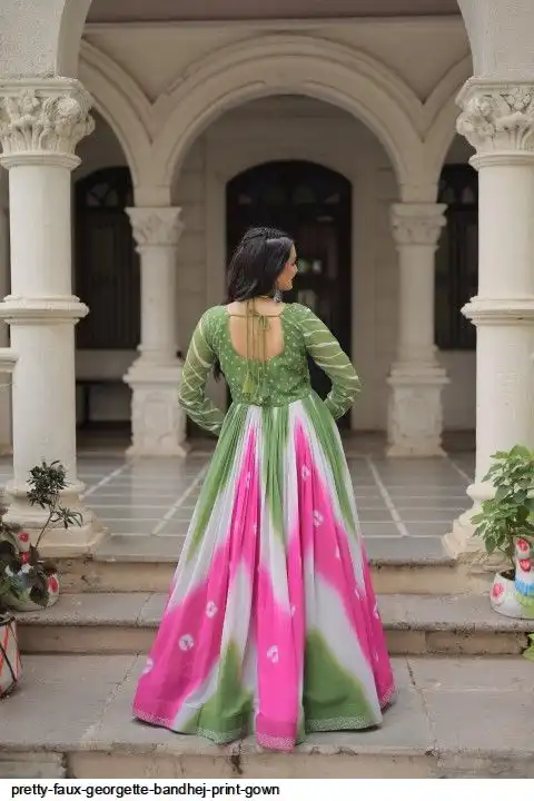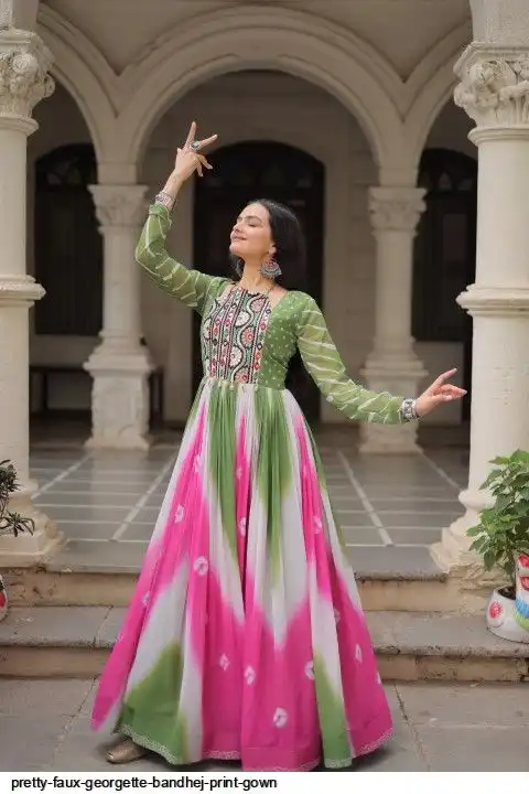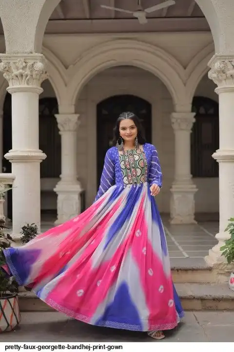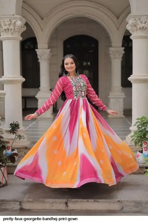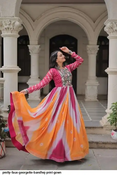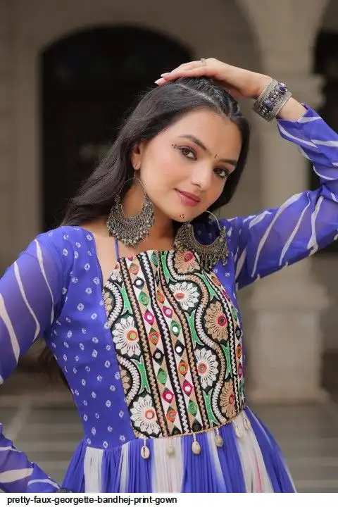 👉🏻 FABRICS & WORK :- Faux Georgette Bandhej Print With Gamthi Embroidered & Mirror embellished Work