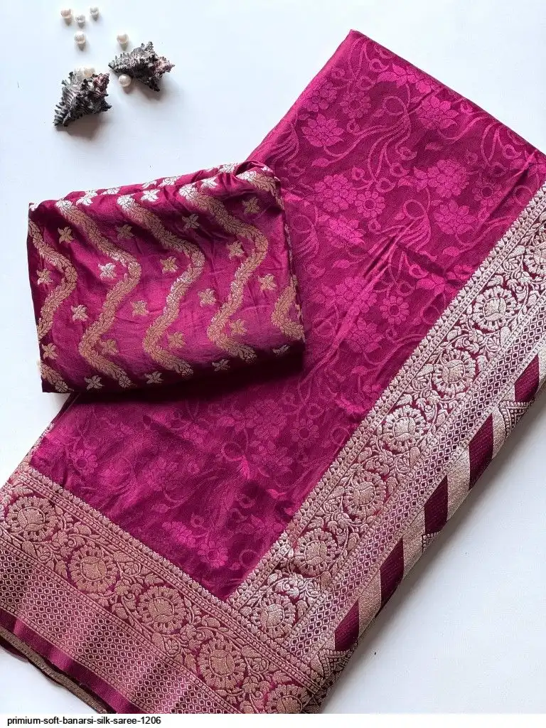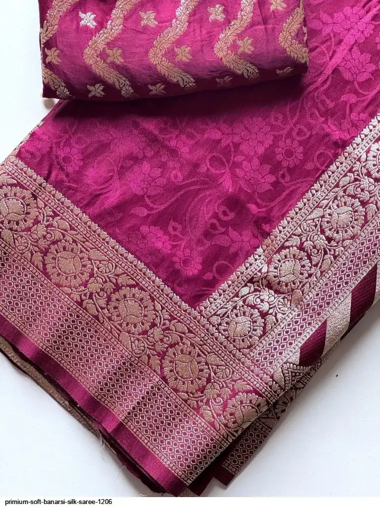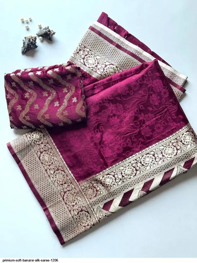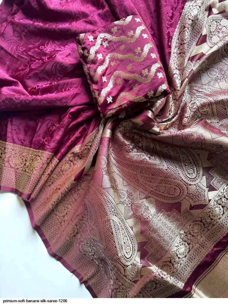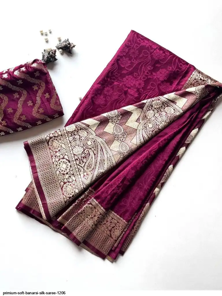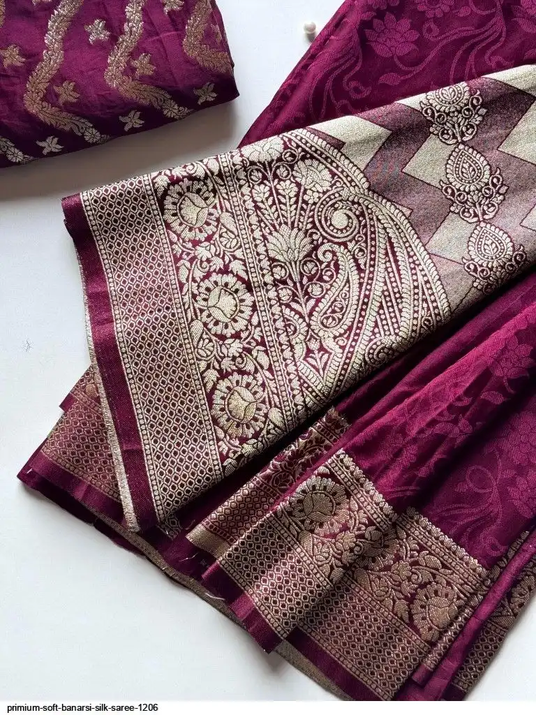 Primium Soft Satin Base Banarsi Silk Saree With Embose Figure And Banarsi Zari with Pure Elegant Wine Color combination