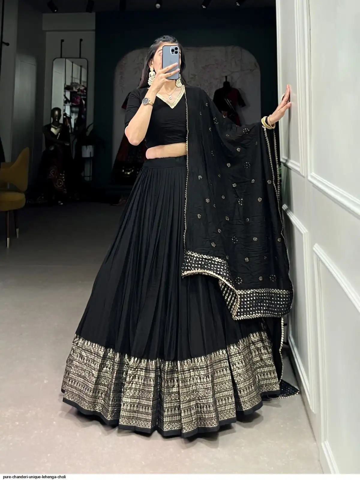 rafted for Grace and Beauty: Pure Chanderi Plain Lehenga with Intricate Zari Work Border, Accompanied by Sequin Embellished Dupatta