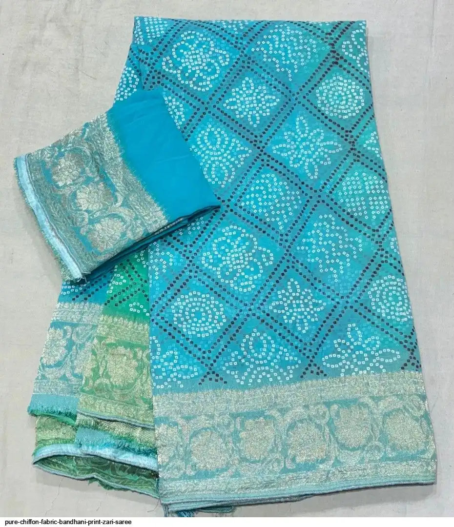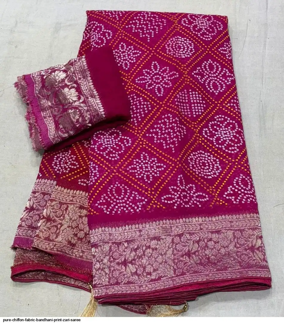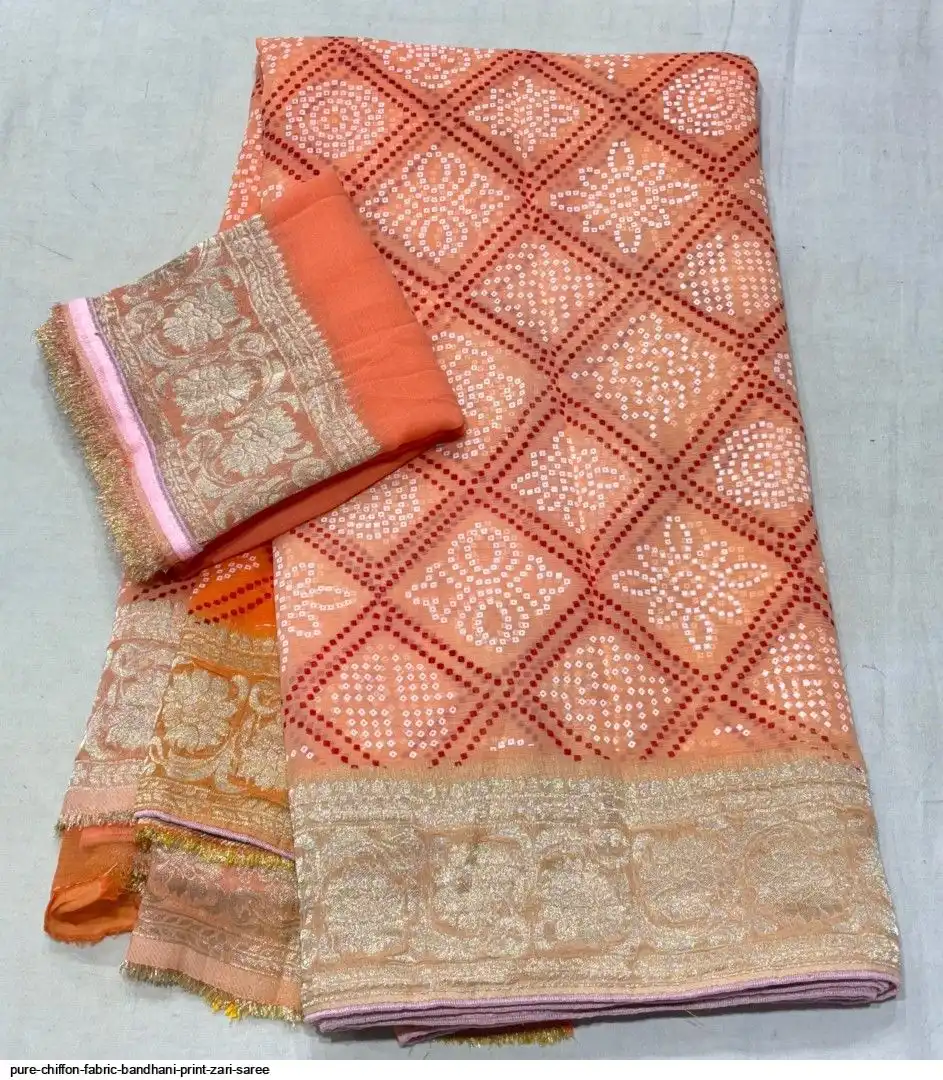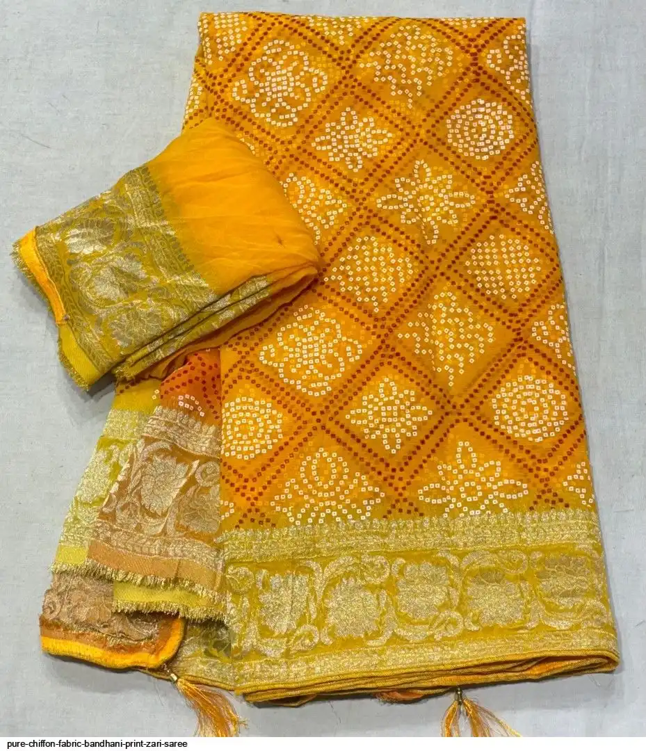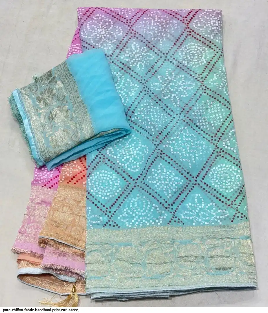 Pure chiffon fabric with beautiful all over Bandhani Print zari border gala rich pallu waiving zari saree