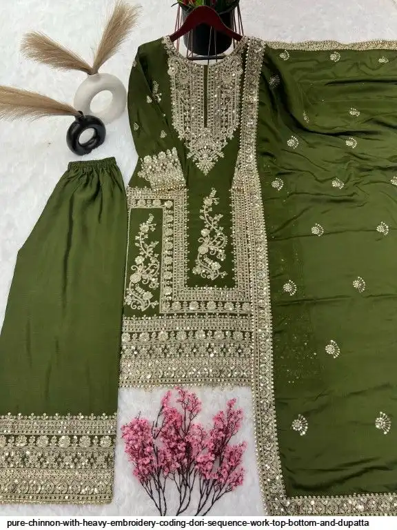 PURE CHINNON WITH HEAVY EMBROIDERY CODING DORI SEQUENCE WORK TOP BOTTOM AND DUPATTA E