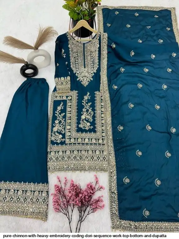 Presenting New Designer Collection In Pure Chinnon With Heavy Embroidery Coding Dori-Sequence Work Top-Bottom And Dupatta Set Fully Stitched Ready To Wear