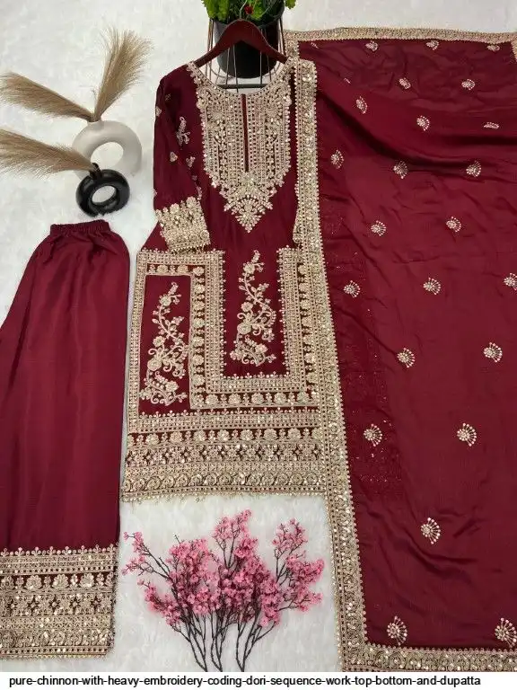 PURE CHINNON WITH HEAVY EMBROIDERY CODING DORI SEQUENCE WORK TOP BOTTOM AND DUPATTA G