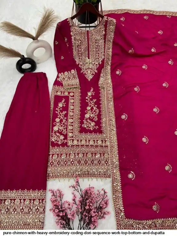 Presenting New Designer Collection In Pure Chinnon With Heavy Embroidery Coding Dori-Sequence Work Top-Bottom And Dupatta Set Fully Stitched Ready To Wear