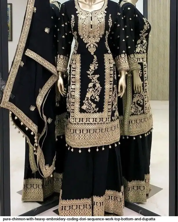 PURE CHINNON WITH HEAVY EMBROIDERY CODING DORI SEQUENCE WORK TOP BOTTOM AND DUPATTA L