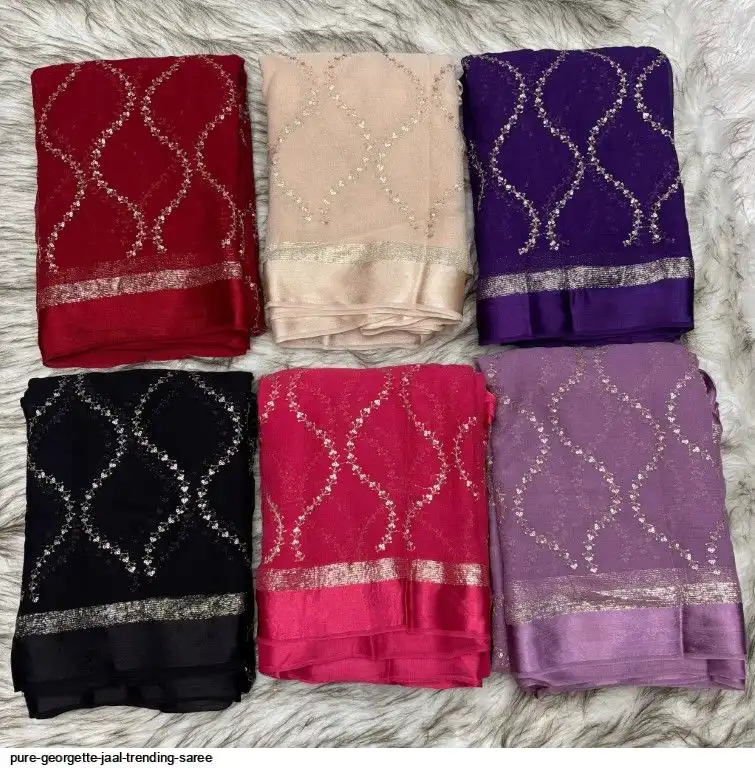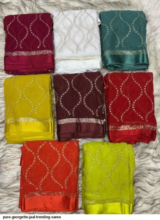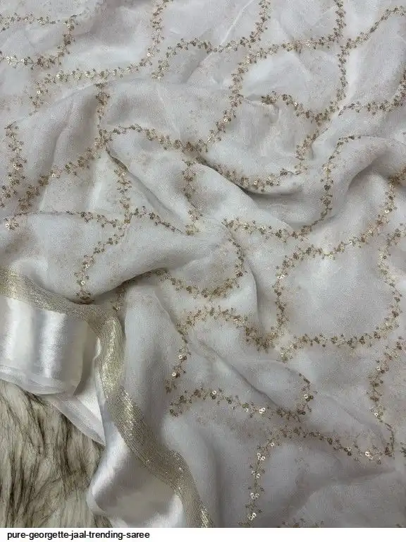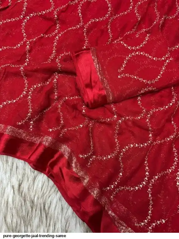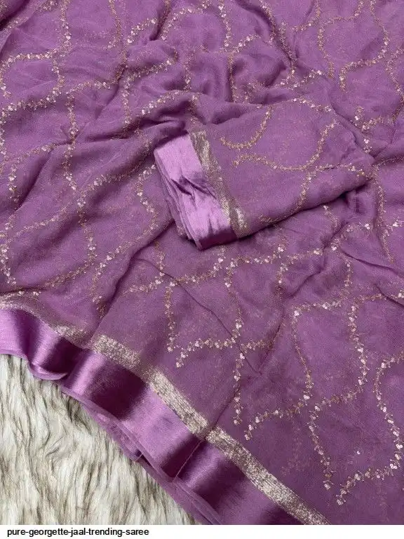 Pure viscose Georgette saree with satin patta border with zari sequence jaal worked all over with running blouse