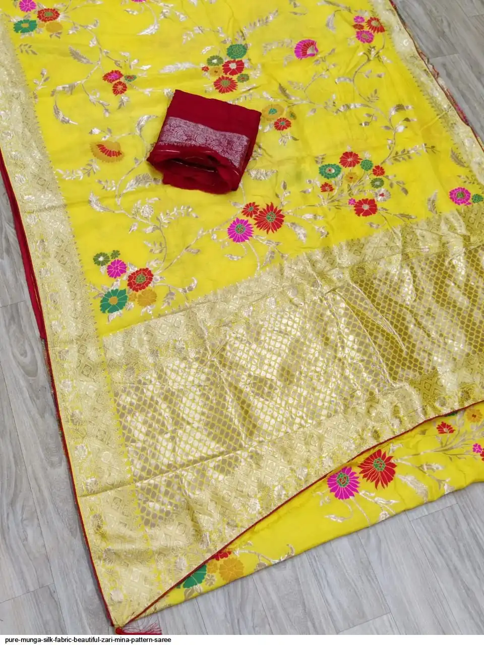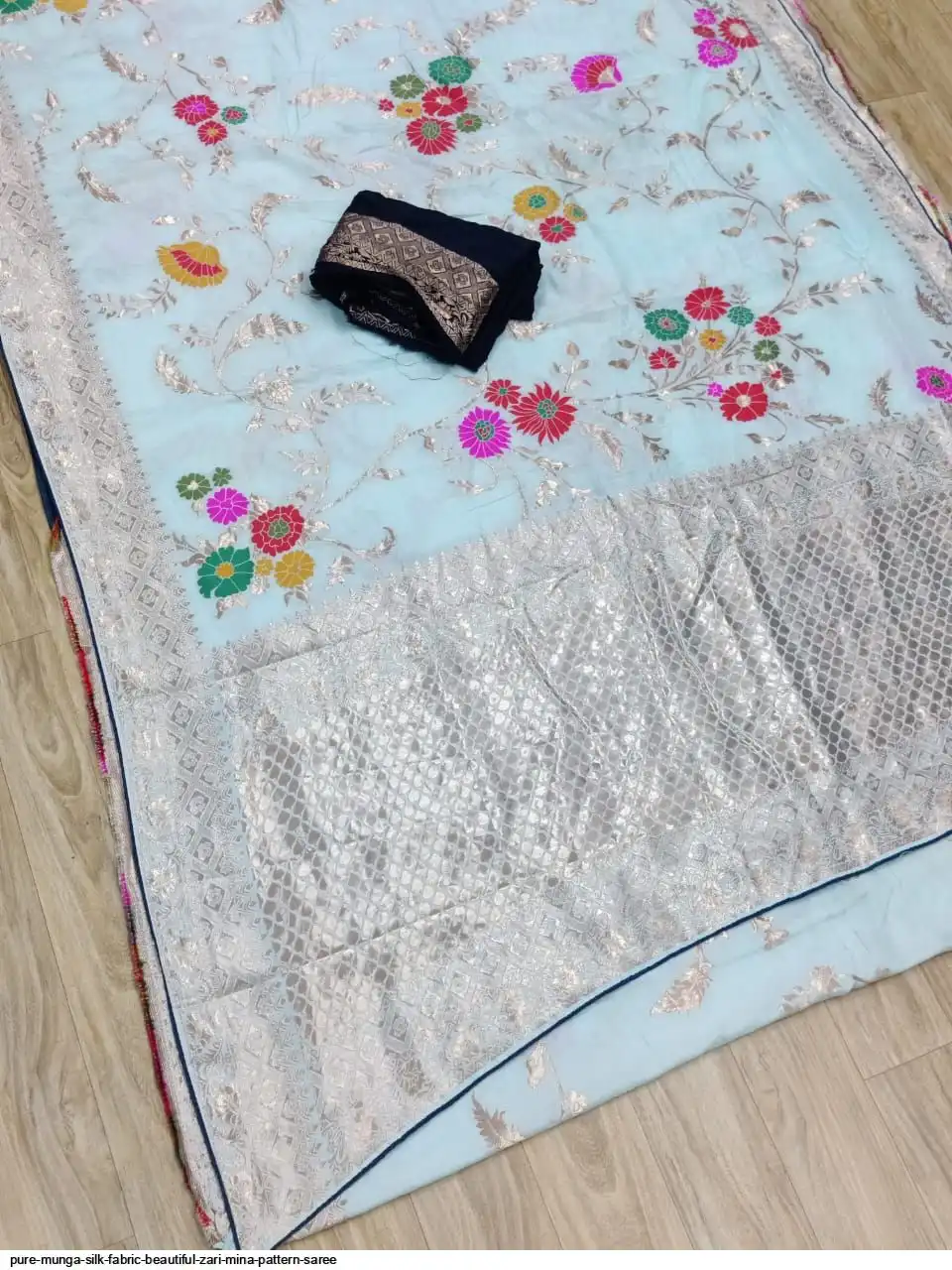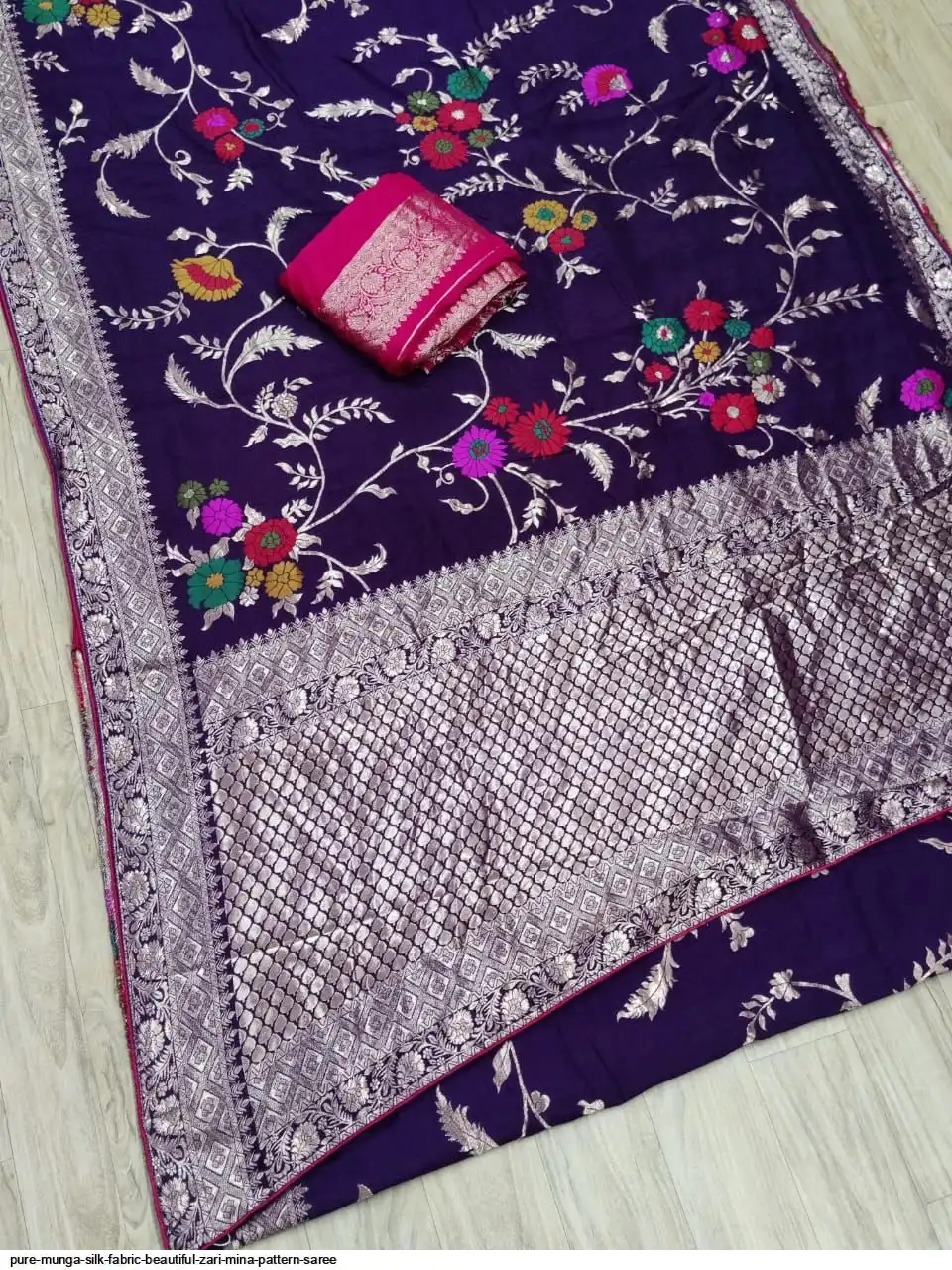 Pure munga silk fabric with beautiful zari mina pattern zari all over and hand daing zari havvy contrast super