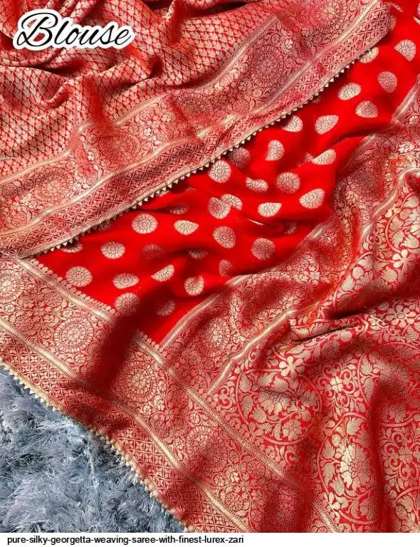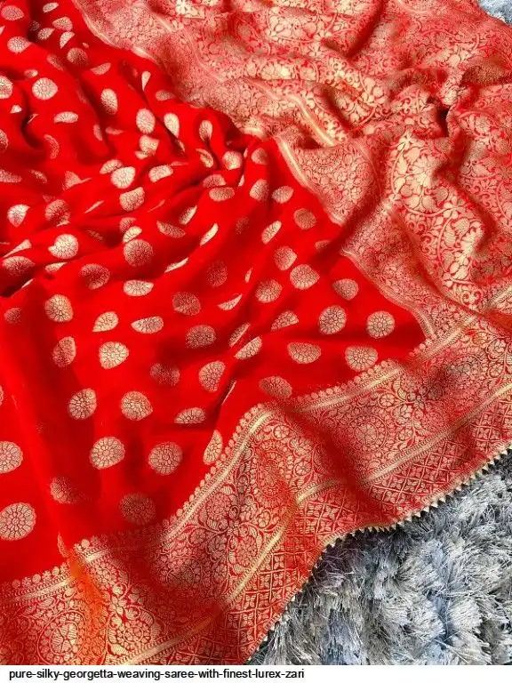 Pure silky Georgetta Weaving Saree With Finest Lurex Zari Rich Weaving Border n All Over Zari Weaving in Full Saree With two tone shade Concept Pairing With Weaving Blouse cover with samosa gotta lace and latkan
