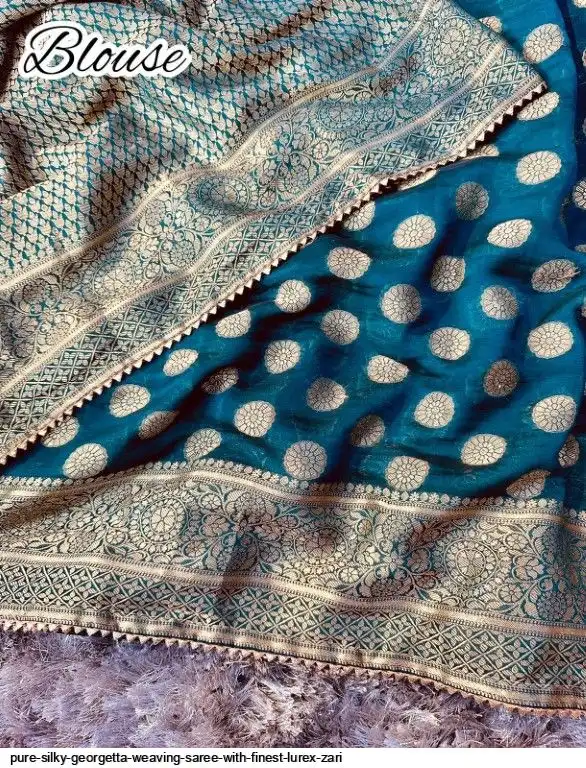 Pure silky Georgetta Weaving Saree With Finest Lurex Zari Rich Weaving Border n All Over Zari Weaving in Full Saree With two tone shade Concept Pairing With Weaving Blouse cover with samosa gotta lace and latkan