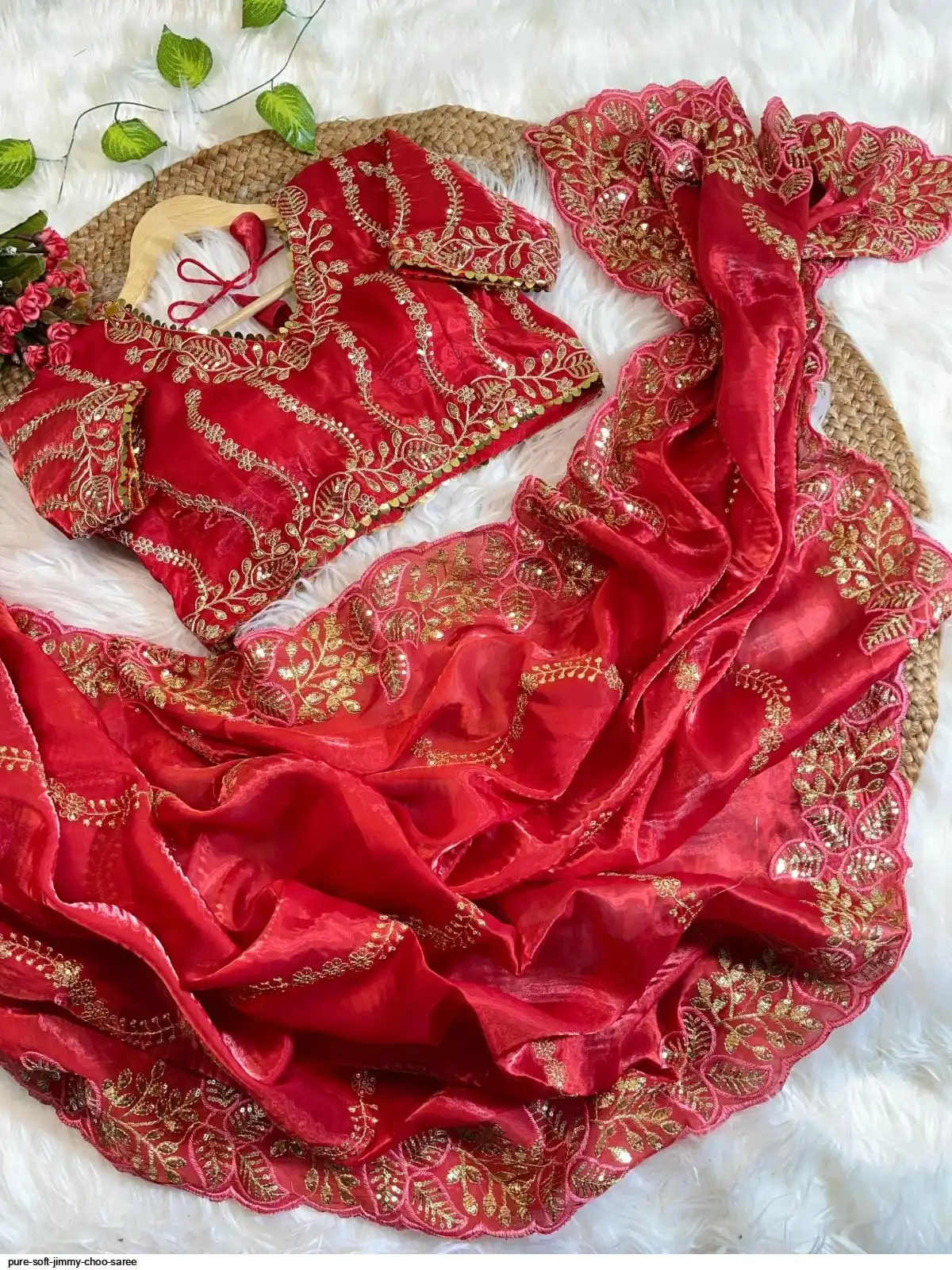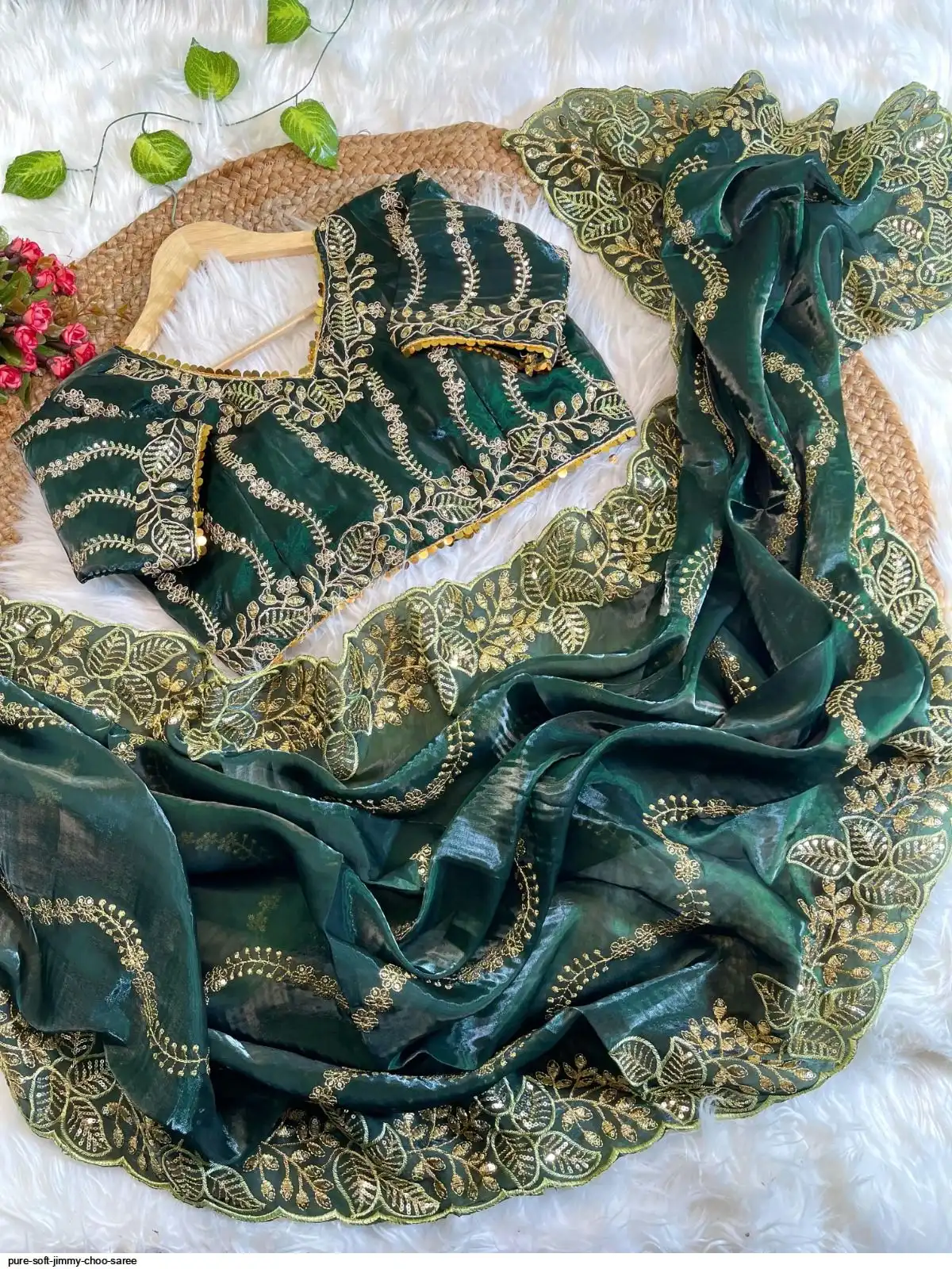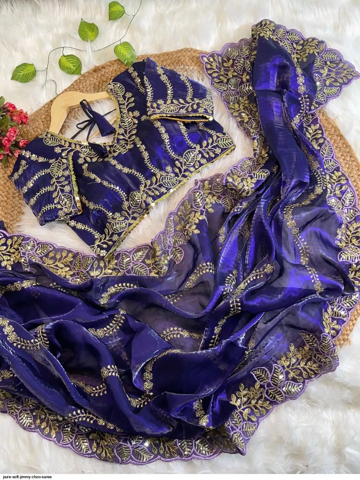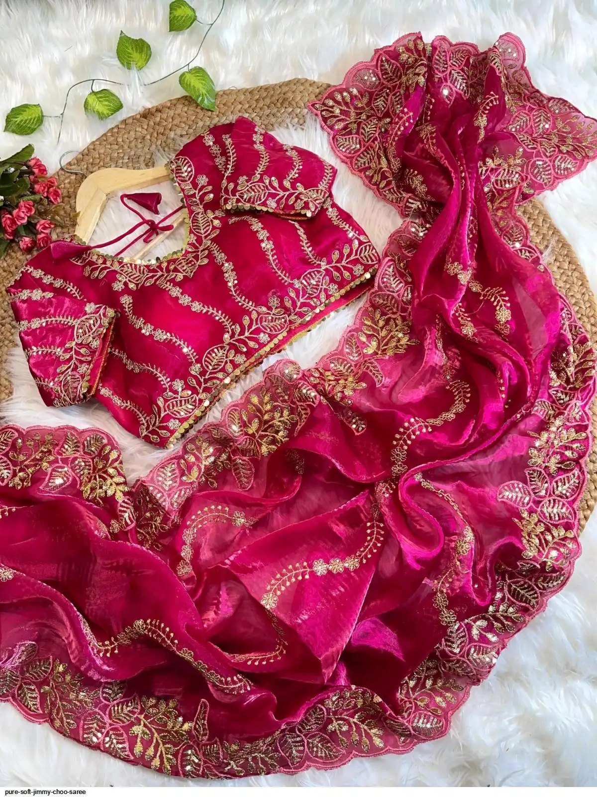 Pure soft jimmy choo silk saree with beautiful embroidery sequence work heavy borders with Lahariya sequence in all over saree nd aarco border