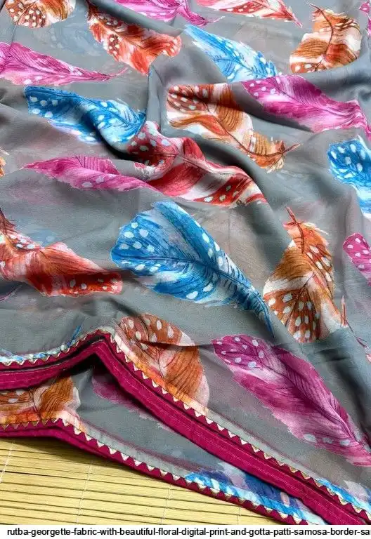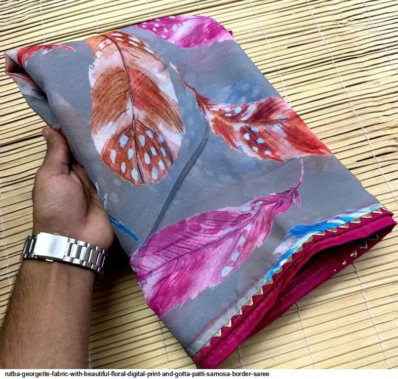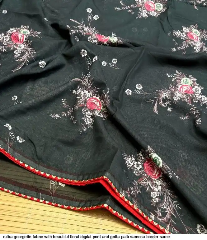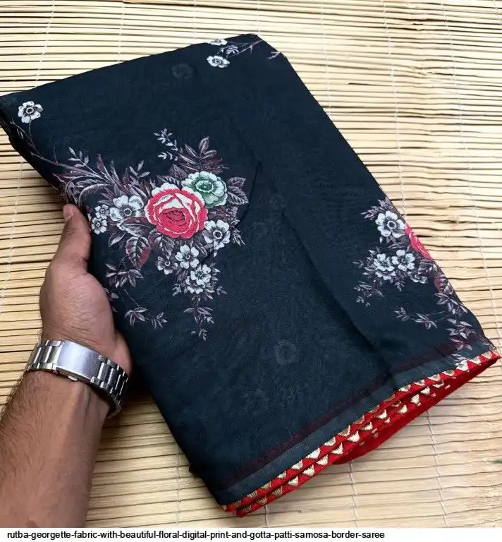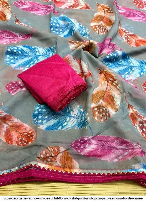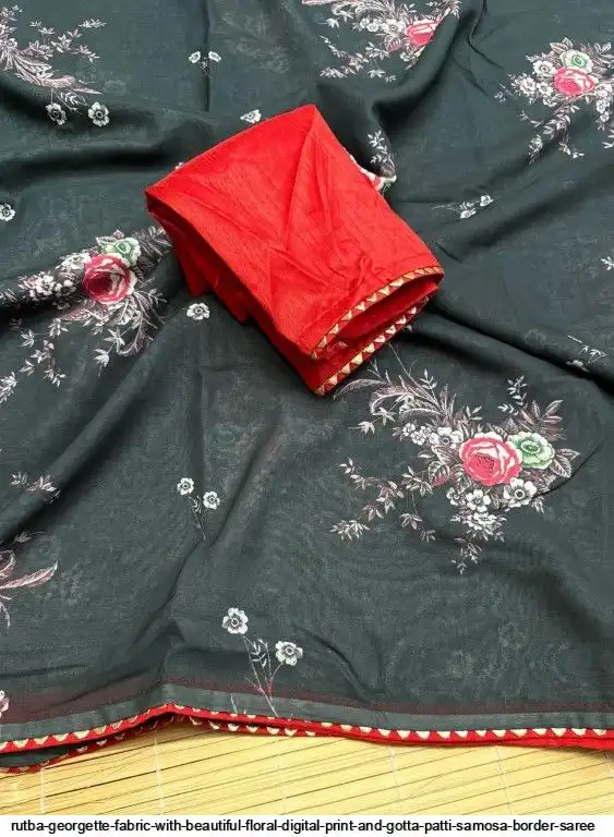 Fabric - Georgette Fabric With Beautiful Floral Digital Print And Gotta Patti Samosa Border And Contrast Banglori Blouse