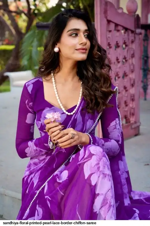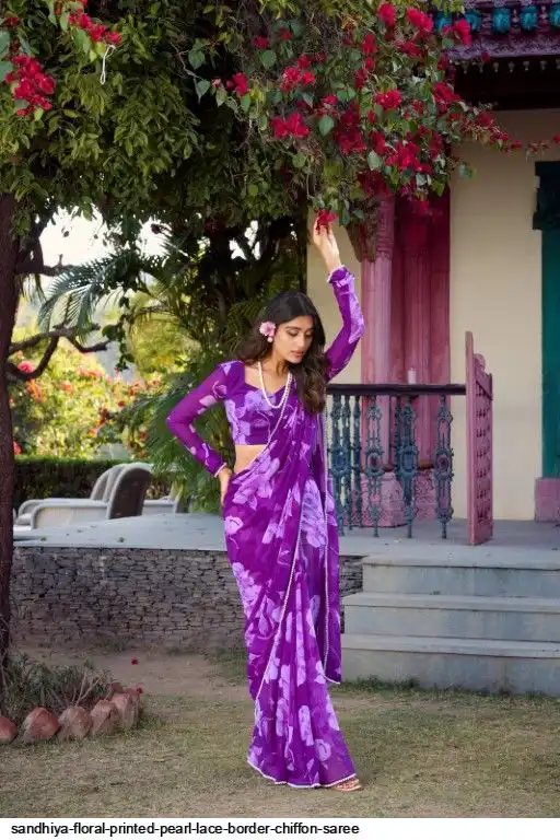 SANDHIYA FLORAL PRINTED PEARL LACE BORDER CHIFFON SAREE C