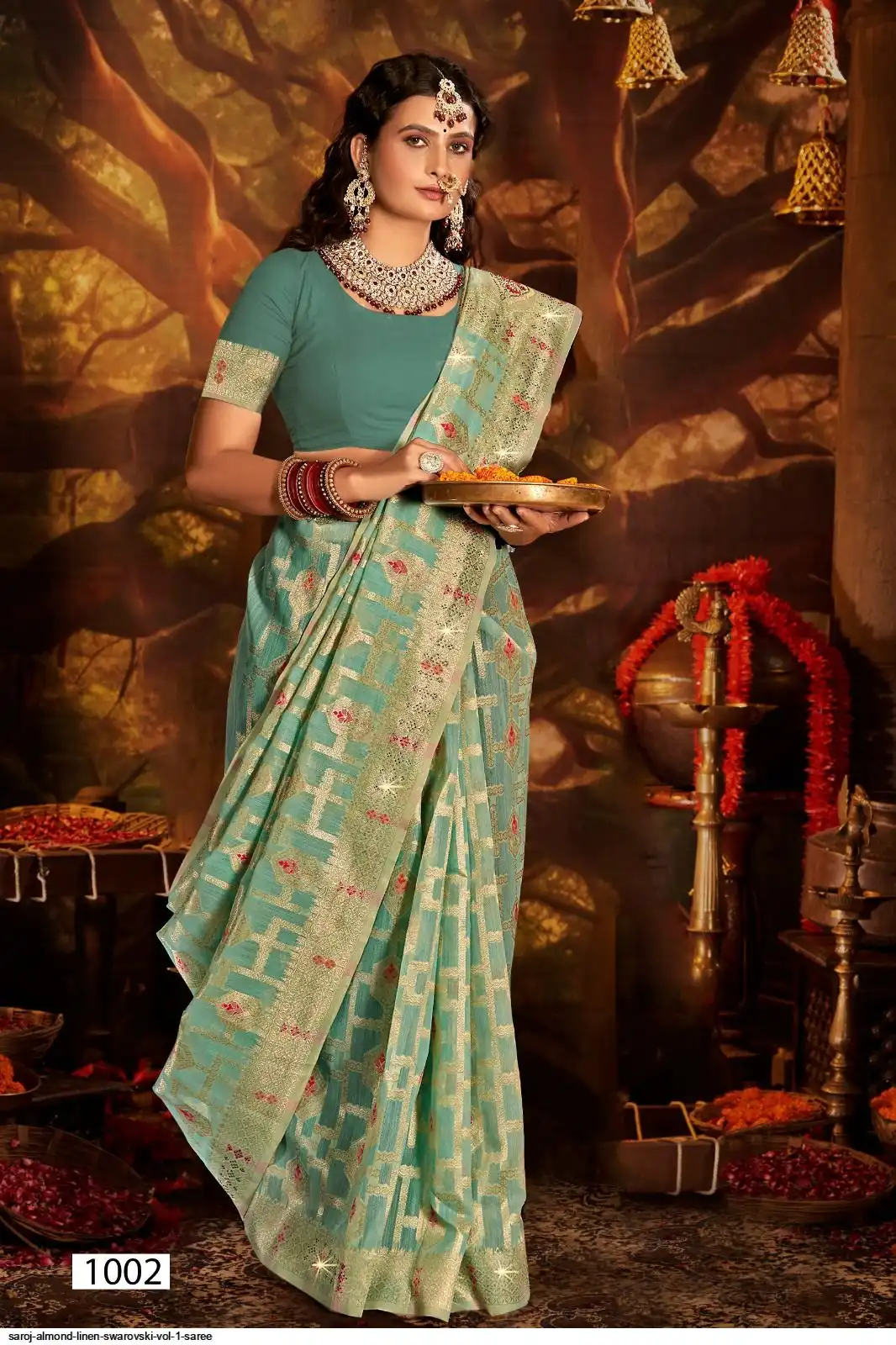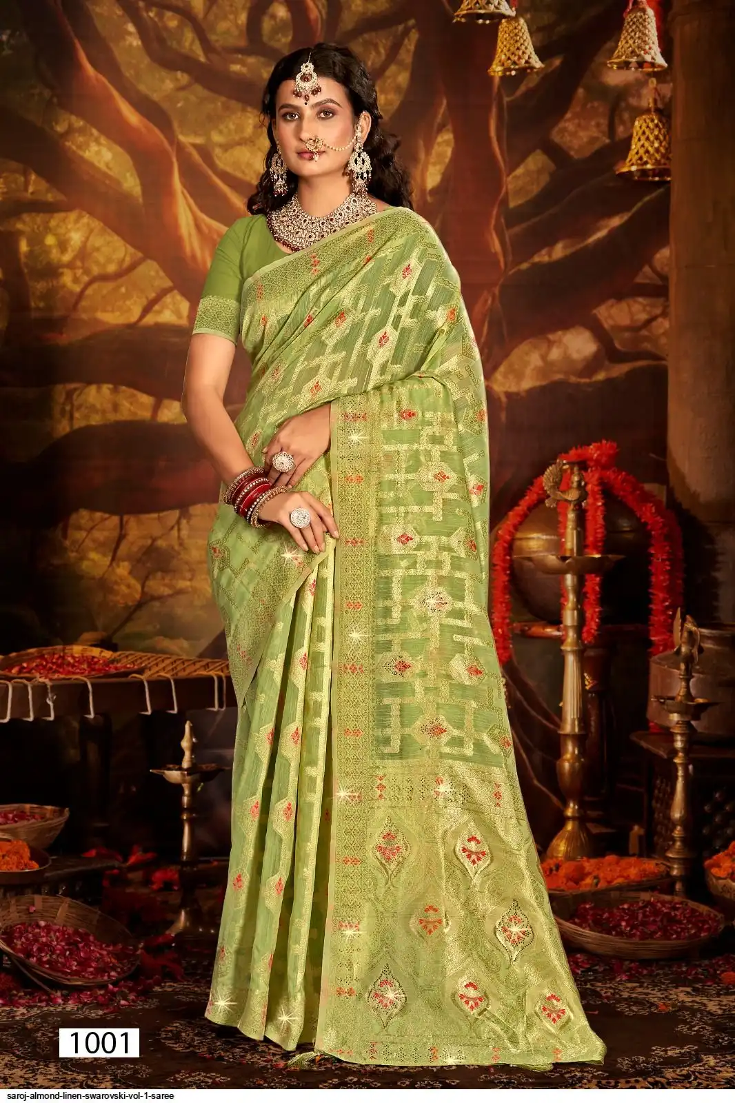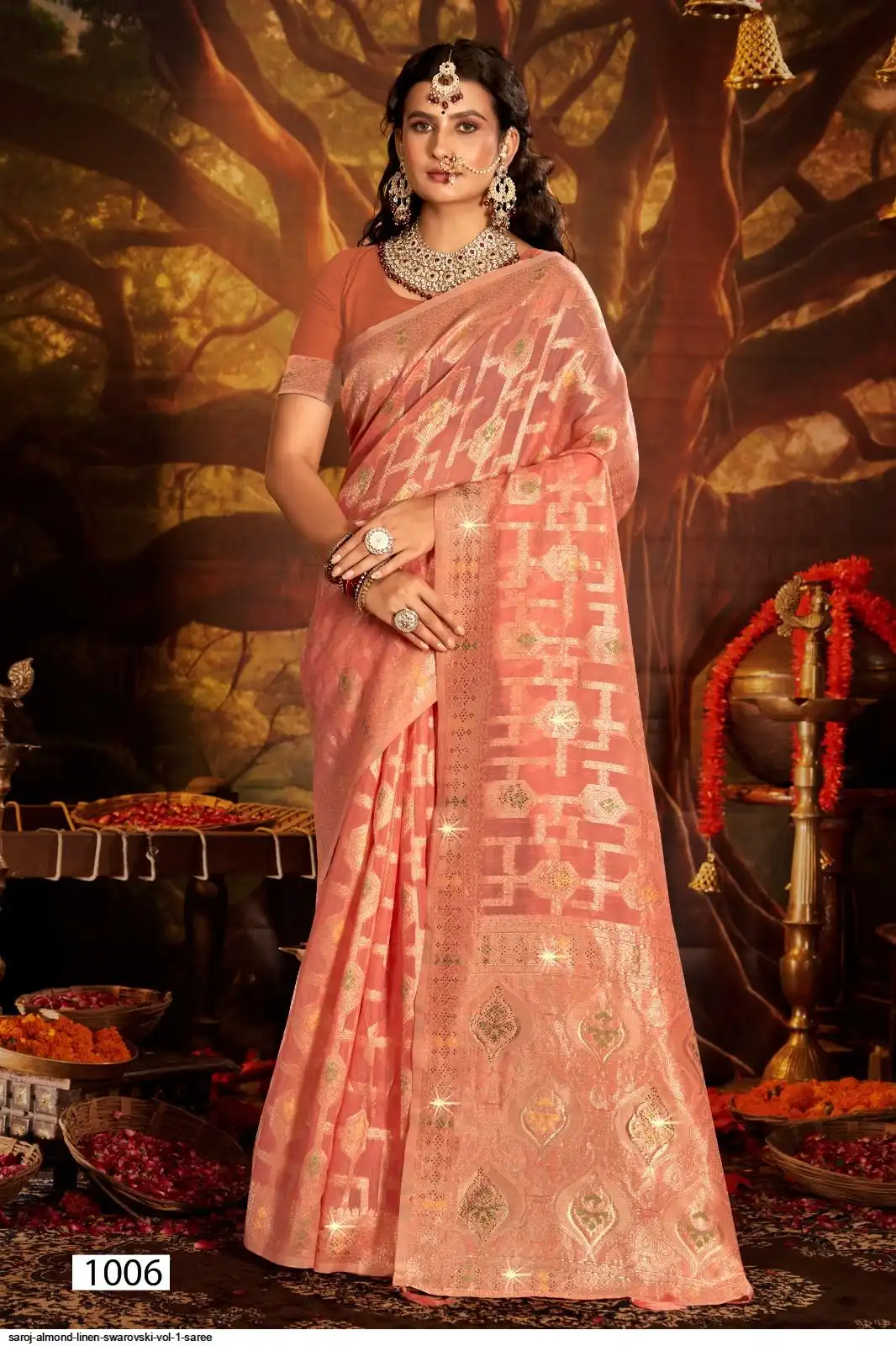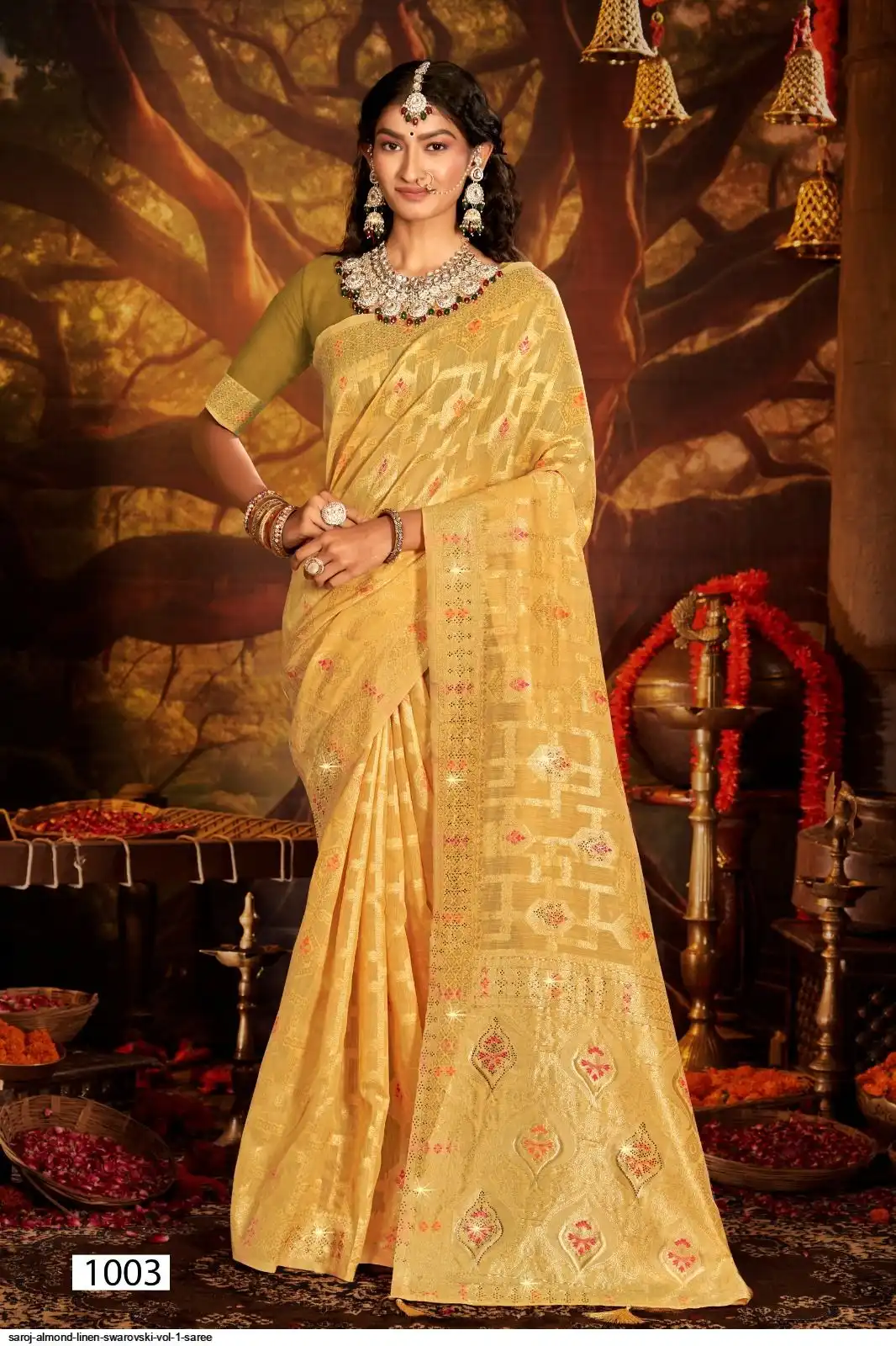 SAROJ ALMOND LINEN SWAROVSKI VOL 1 SAREE