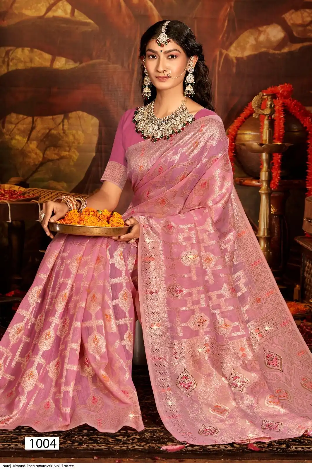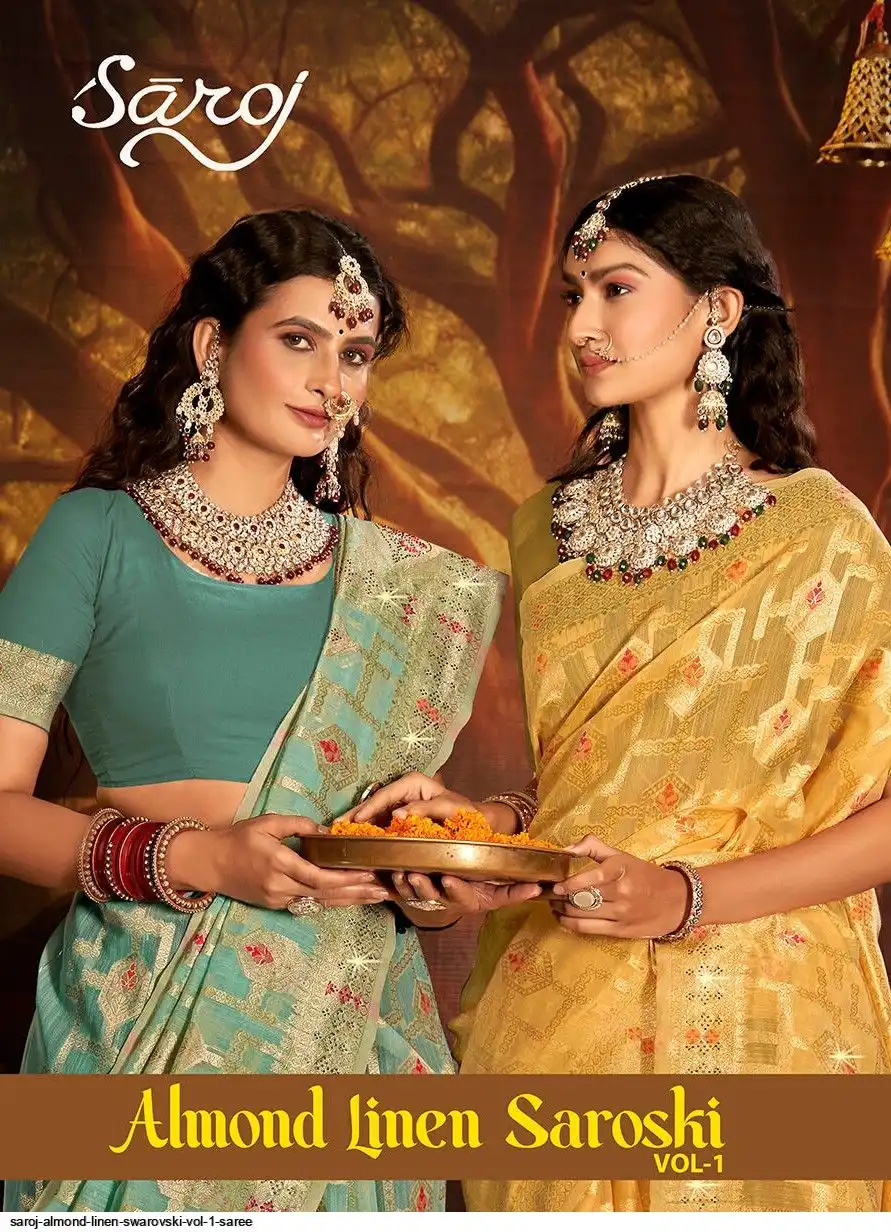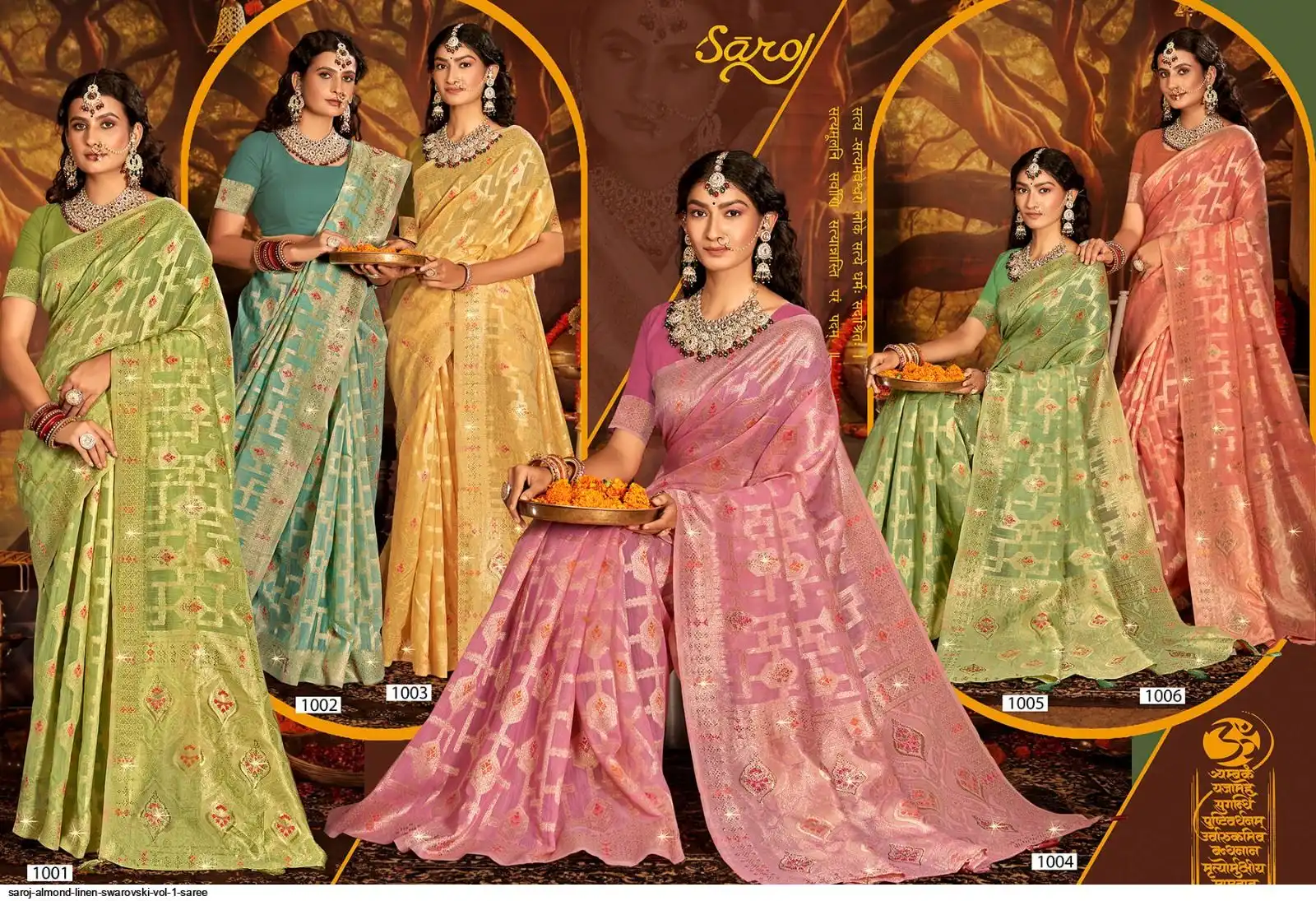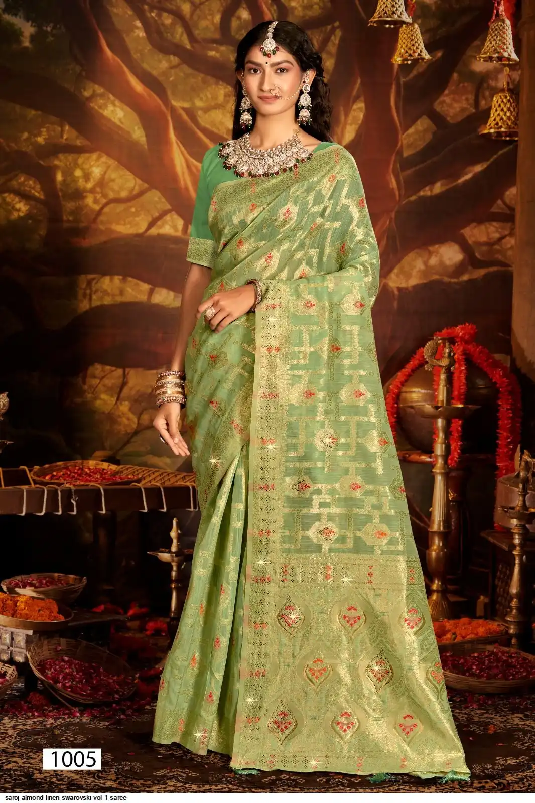 SAROJ ALMOND LINEN SWAROVSKI VOL 1 SAREE