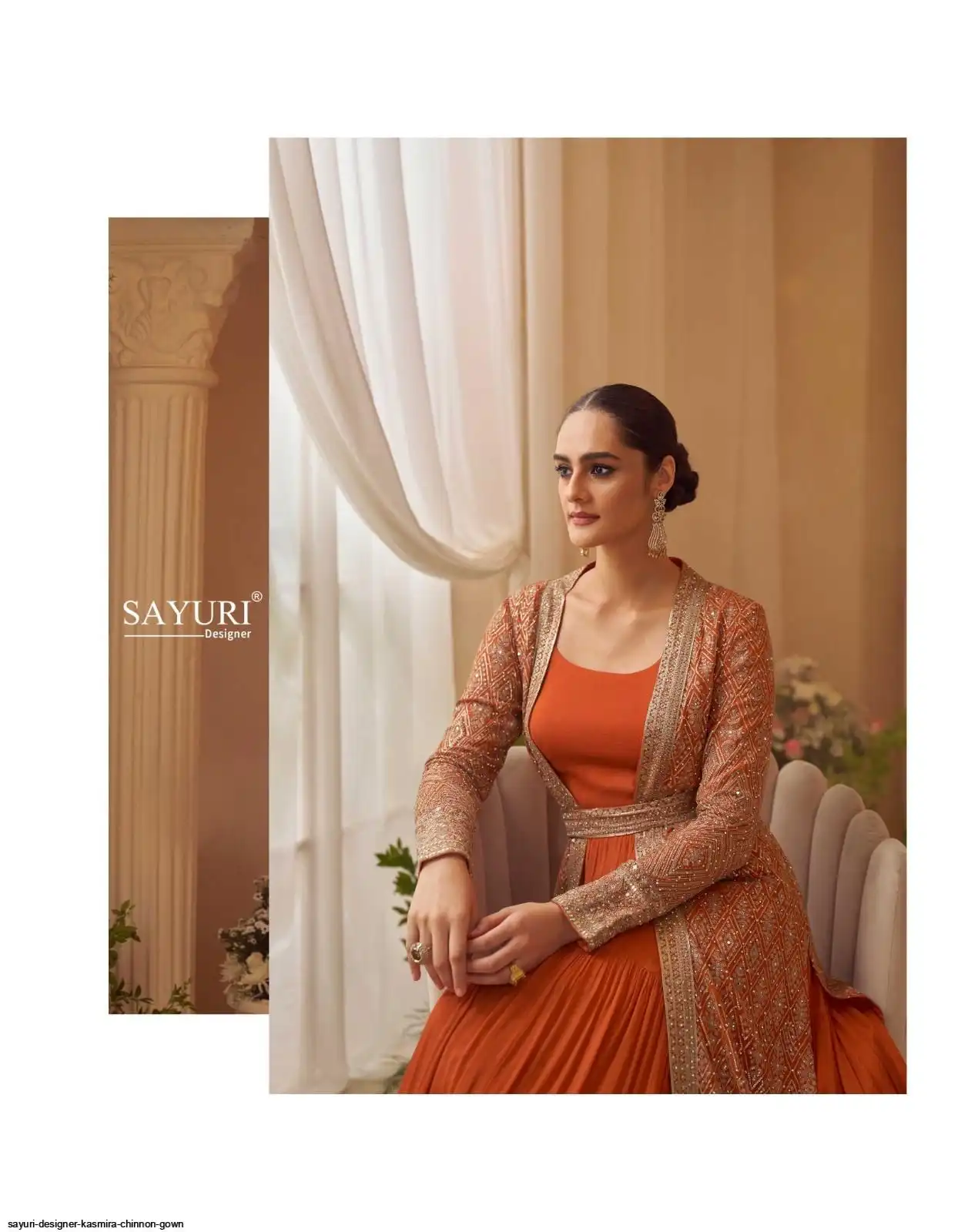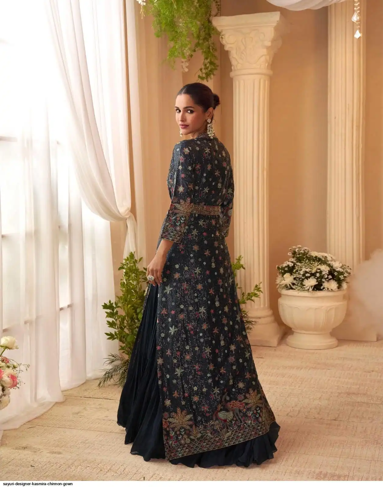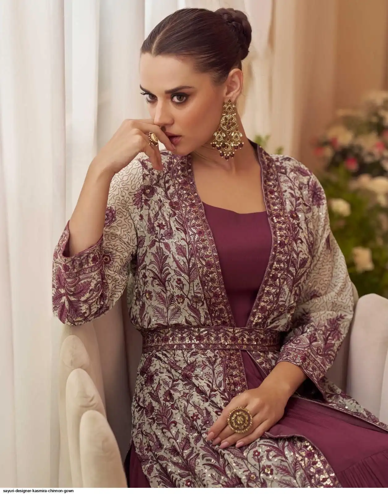 FABRIC - PREMIUM REAL CHİNNON SILK ( TREDY WEDDING LOOK FRONT AND BACK HEAVY EMBROIDERED JACKET WITH BELT AND CHINON SILK GOWN )