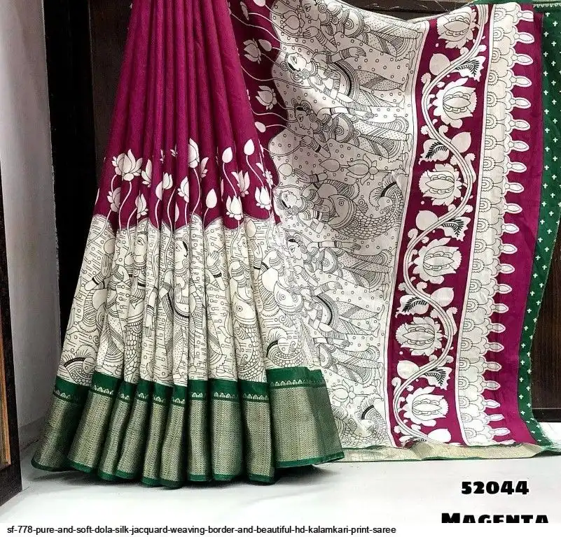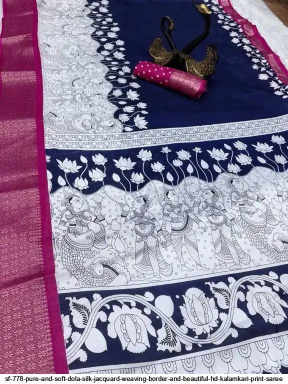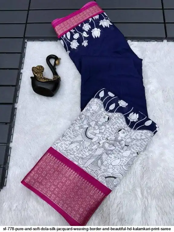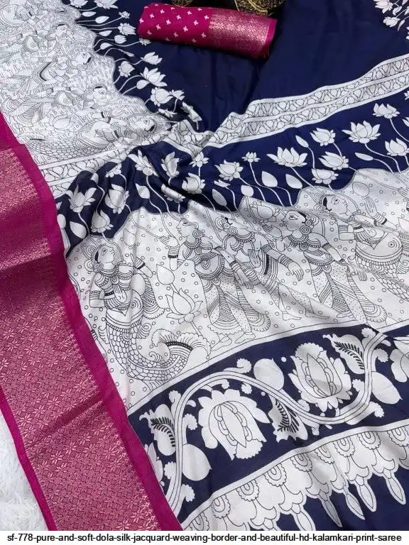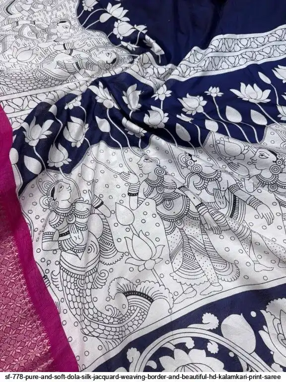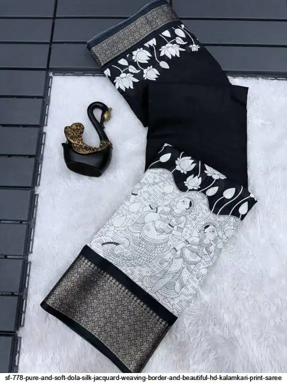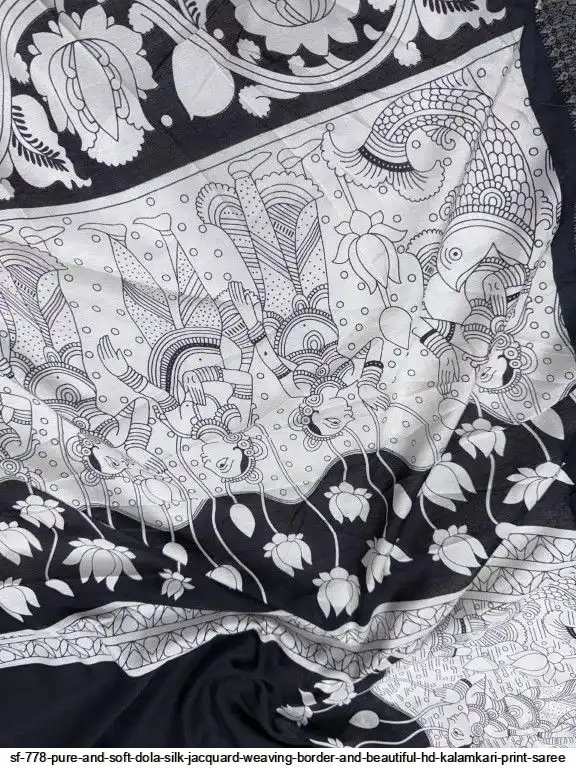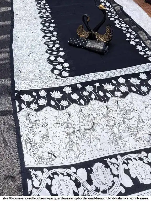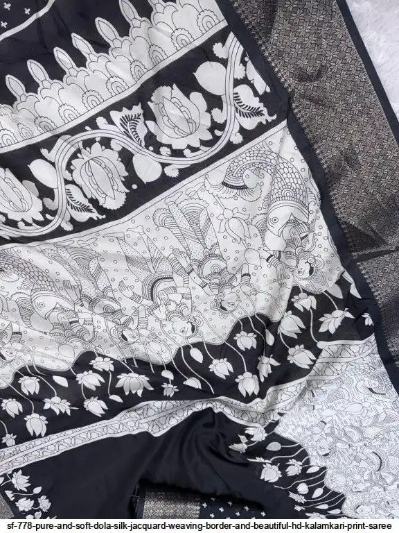 [ heavy jacquard weaving border and beautiful HD KALAMKARI print with attractive WHITE BLACK AND MULTI colour combination ]