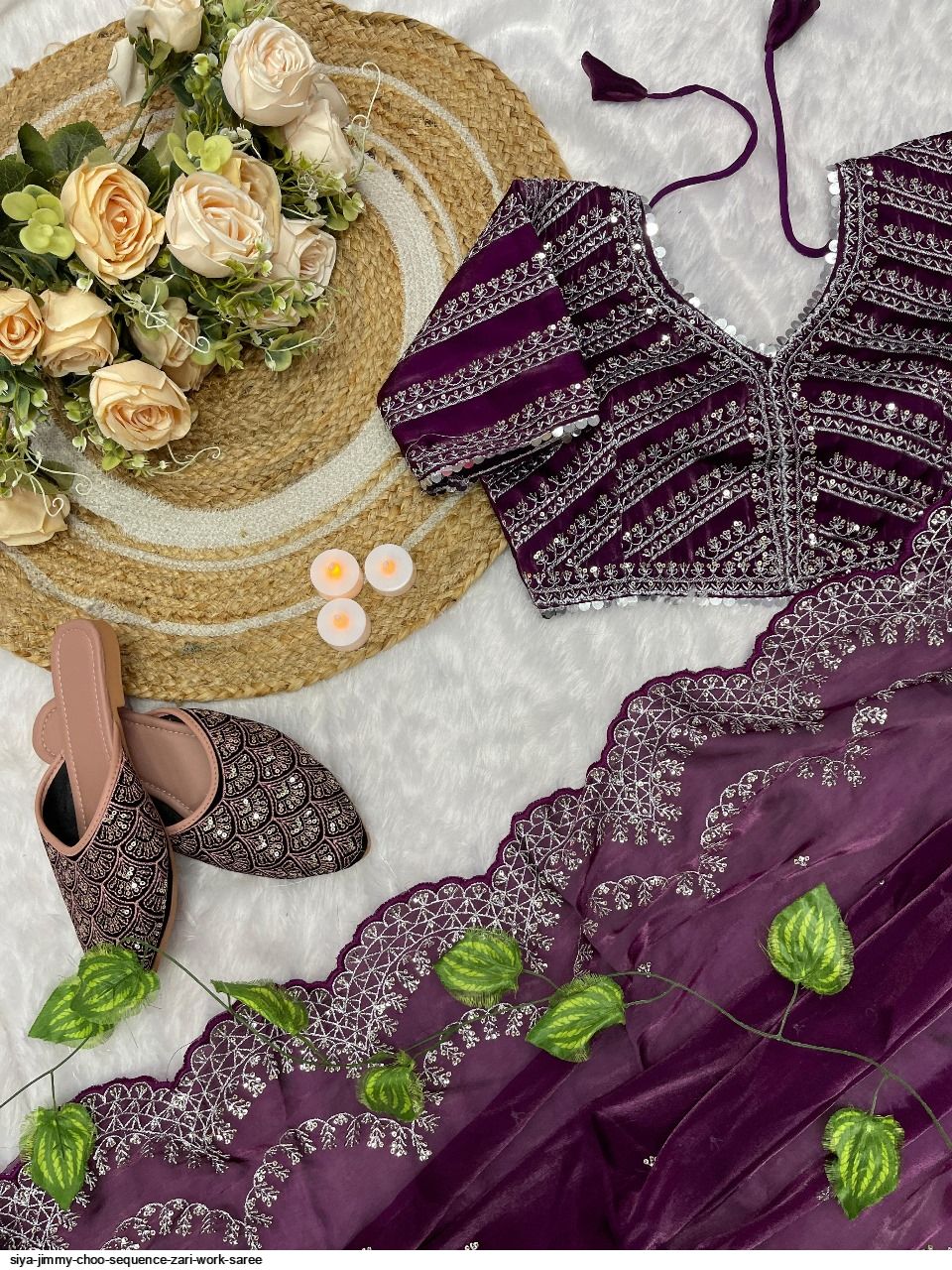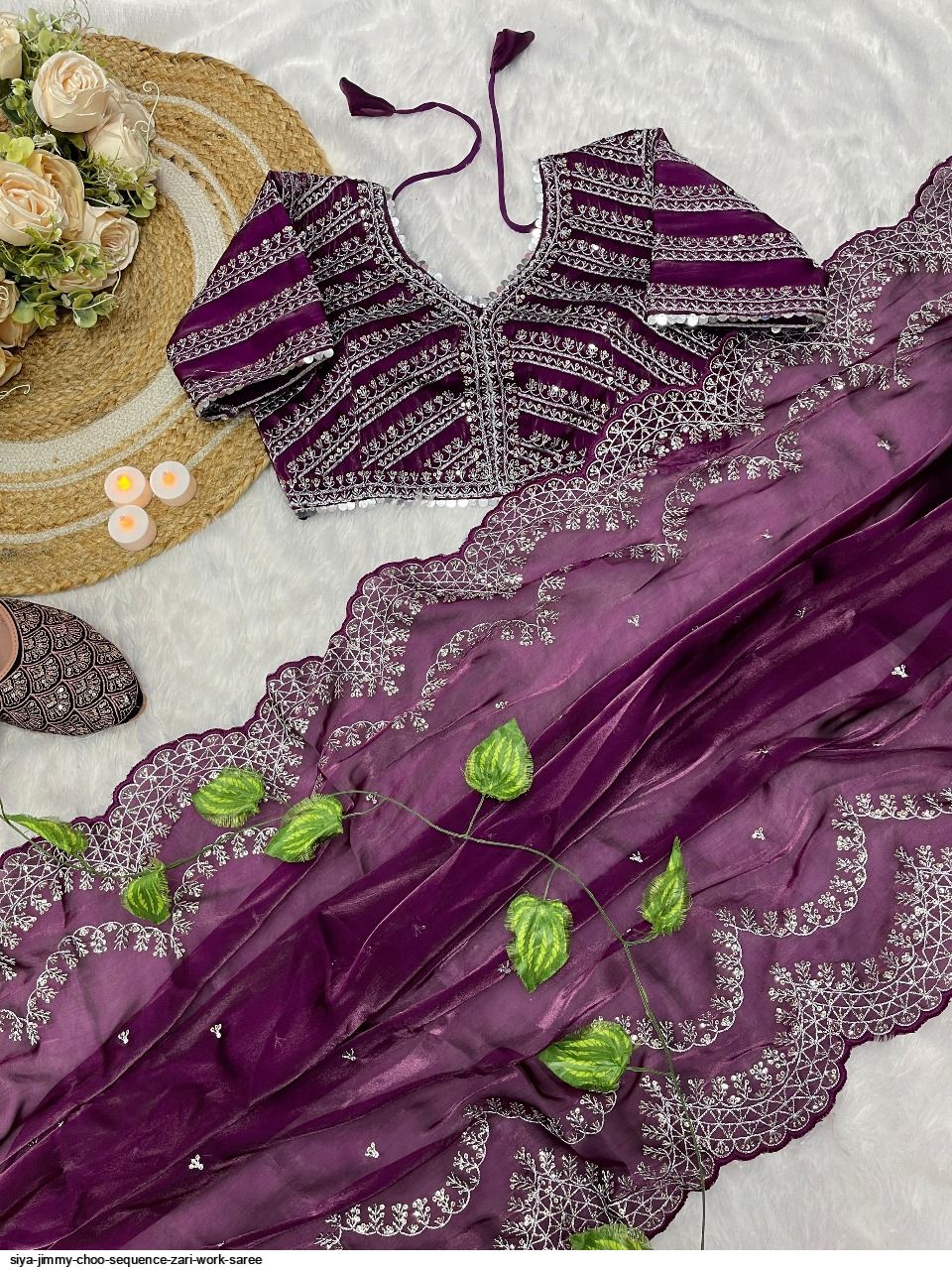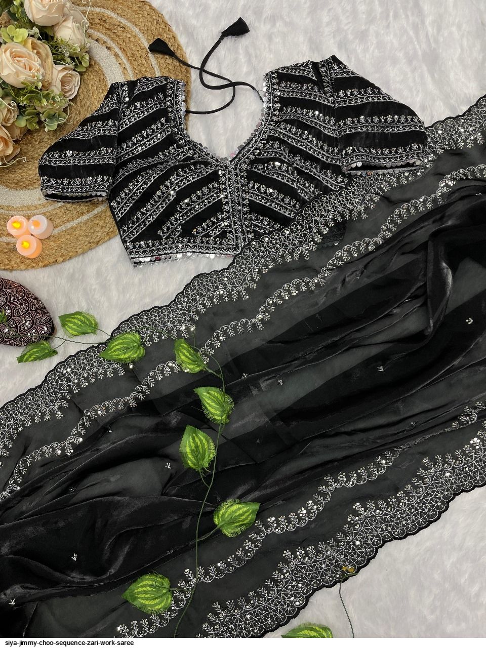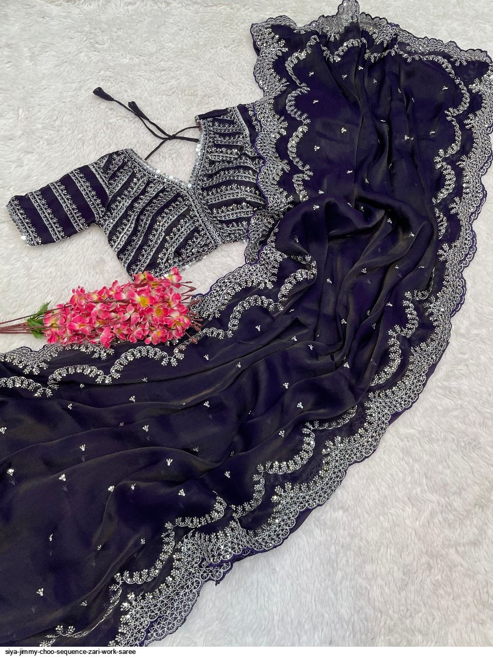Fabric : Pure Jimmy Choo Satin Saree With Beautiful 3MM Sequence Zari (C-Pallu) Work And Arco Border