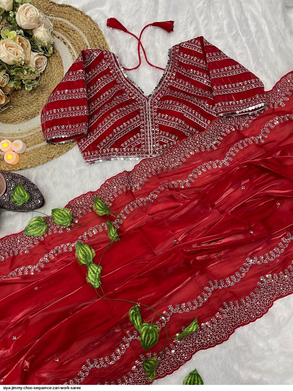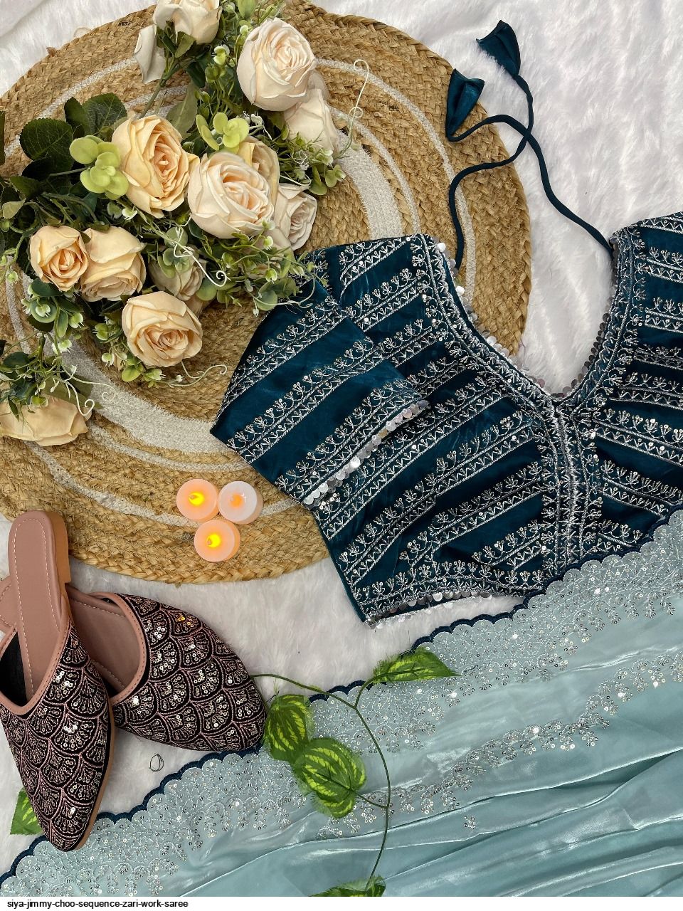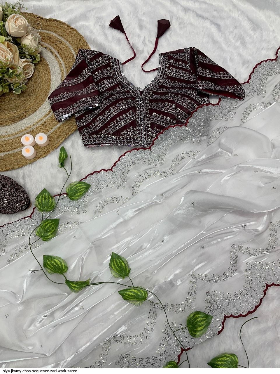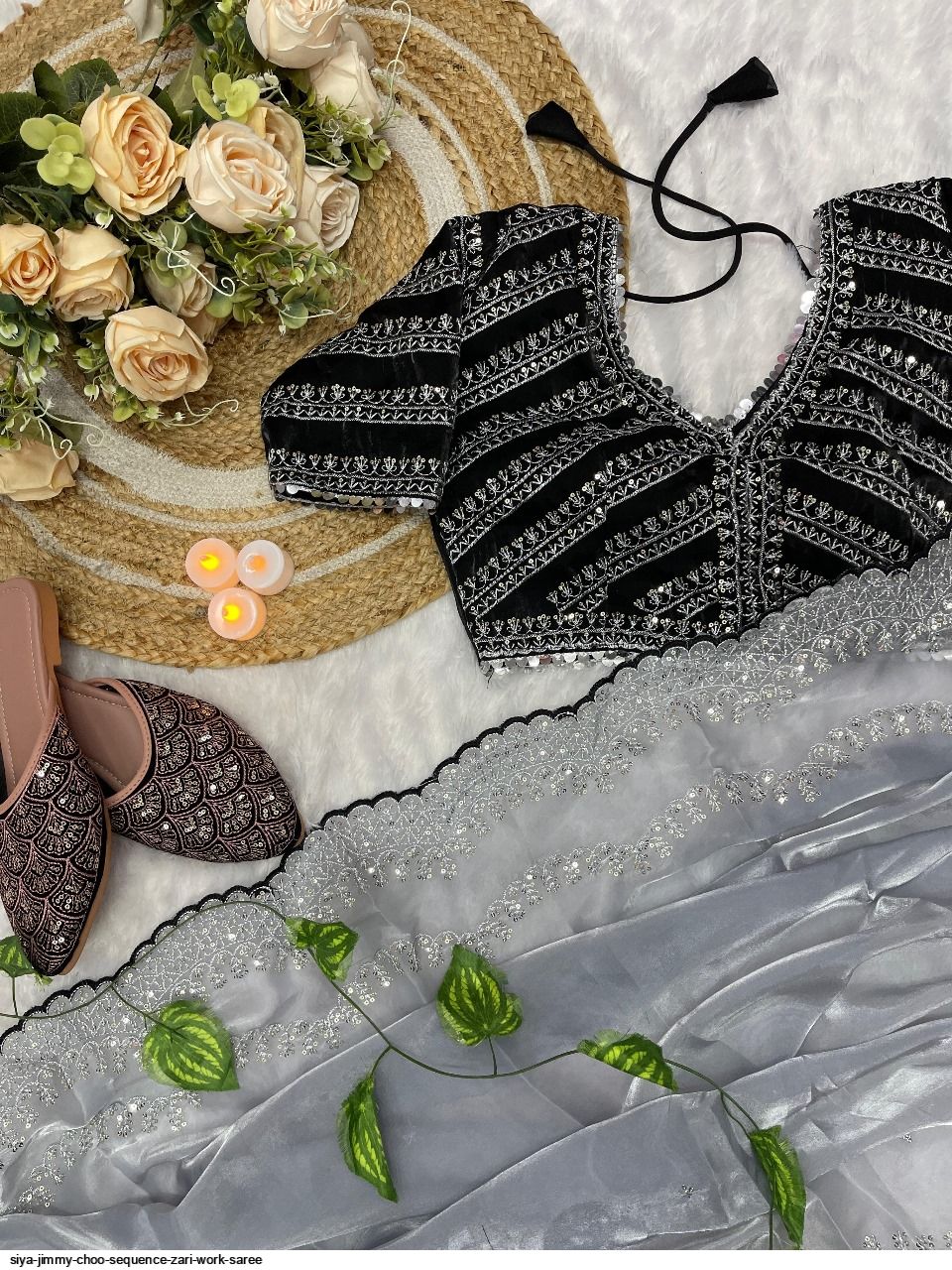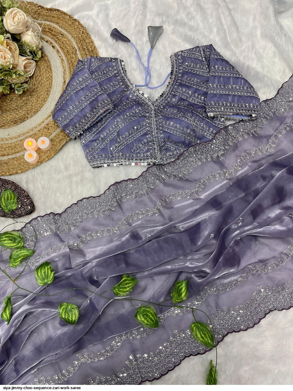 Fabric : Pure Jimmy Choo Satin Saree With Beautiful 3MM Sequence Zari (C-Pallu) Work And Arco Border
