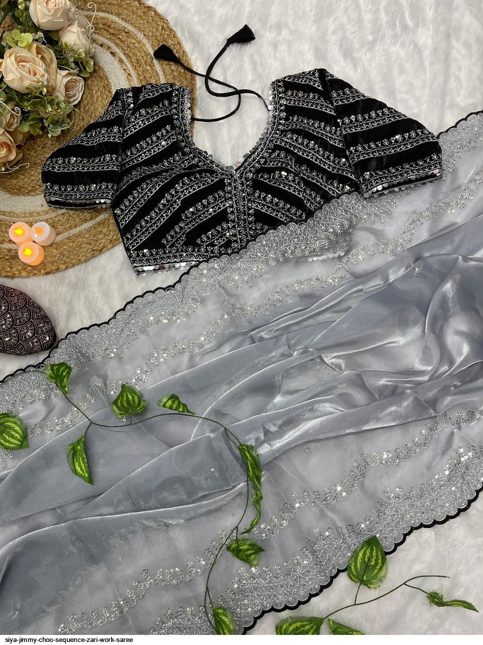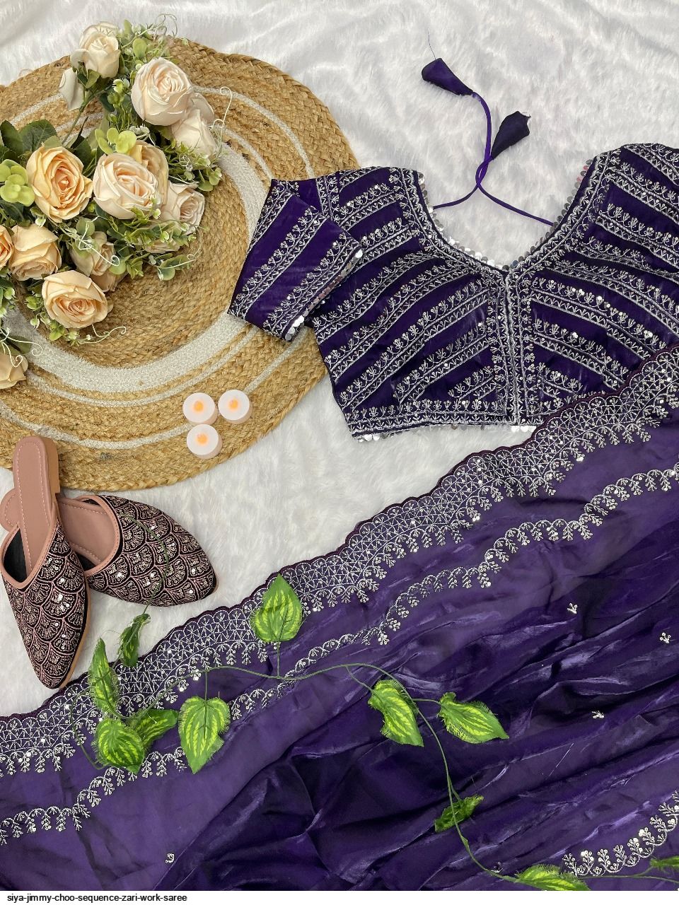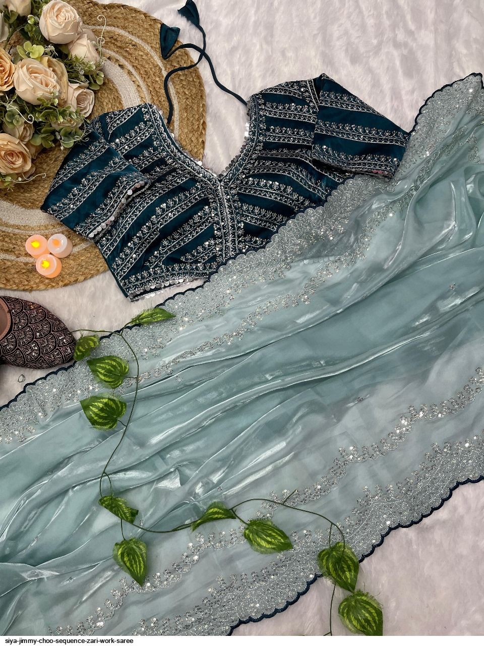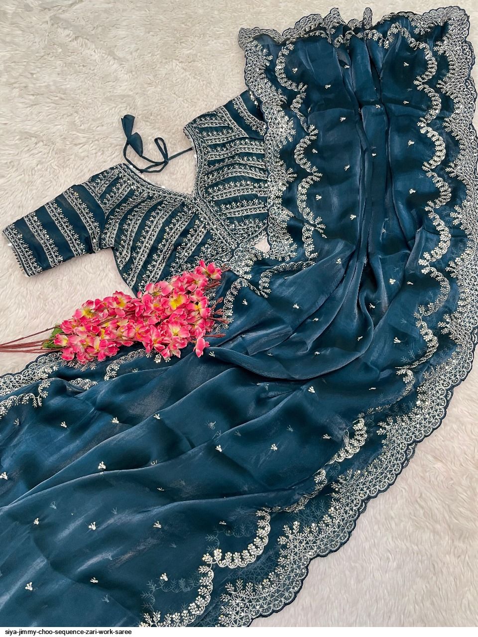 Fabric : Pure Jimmy Choo Satin Saree With Beautiful 3MM Sequence Zari (C-Pallu) Work And Arco Border