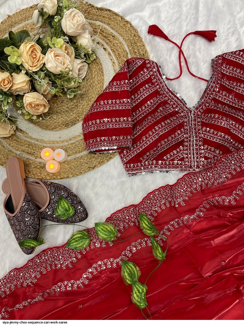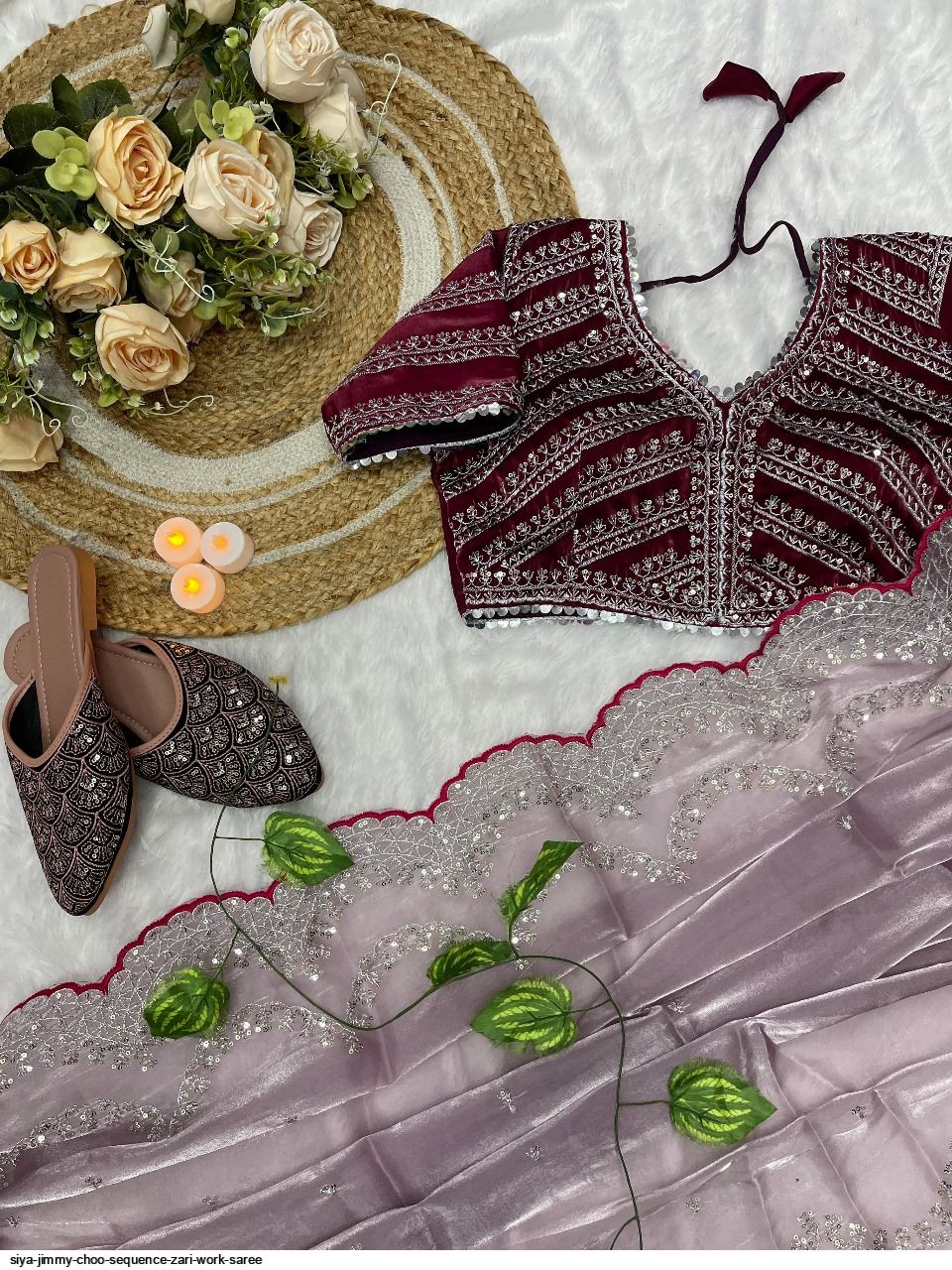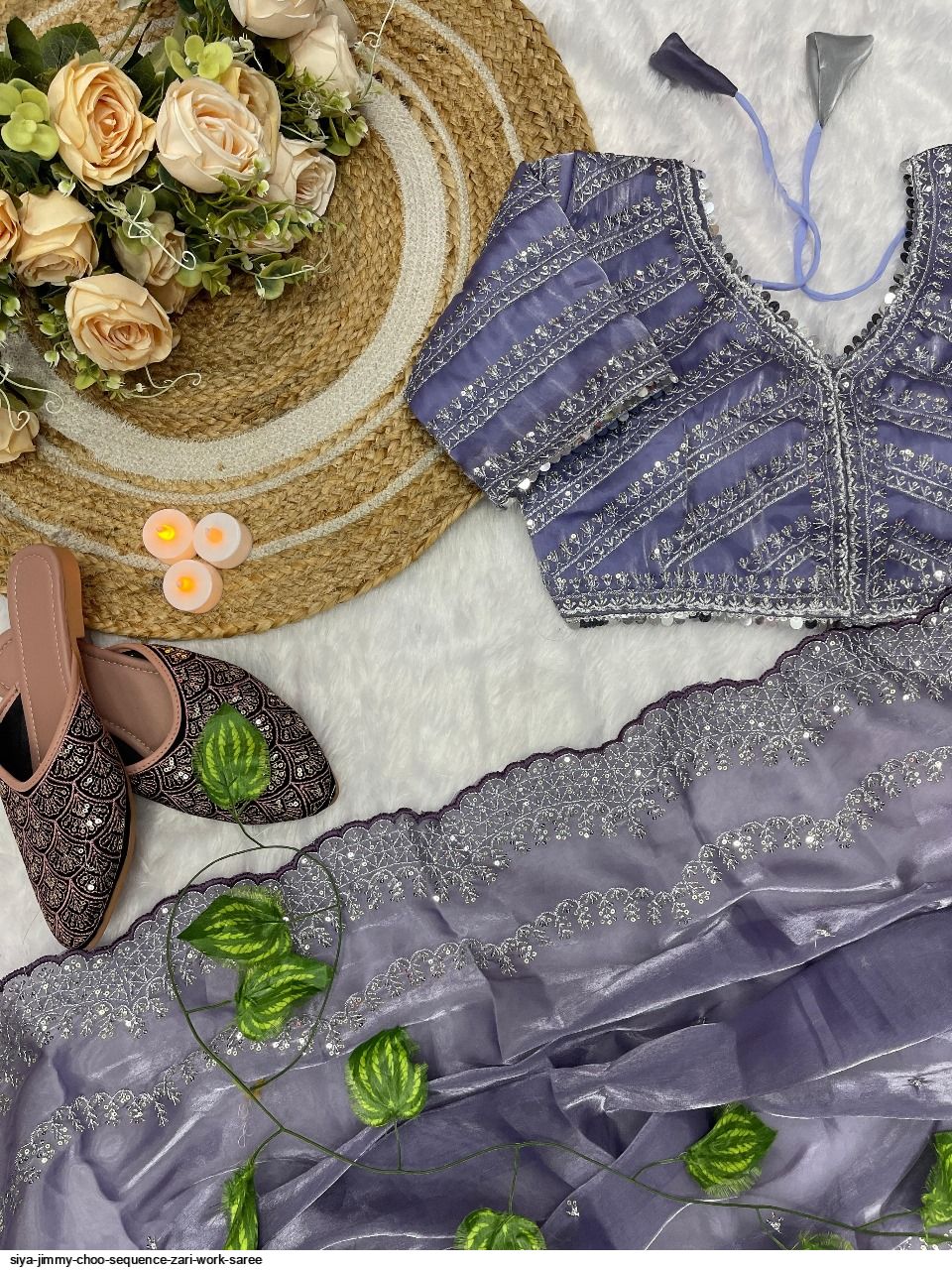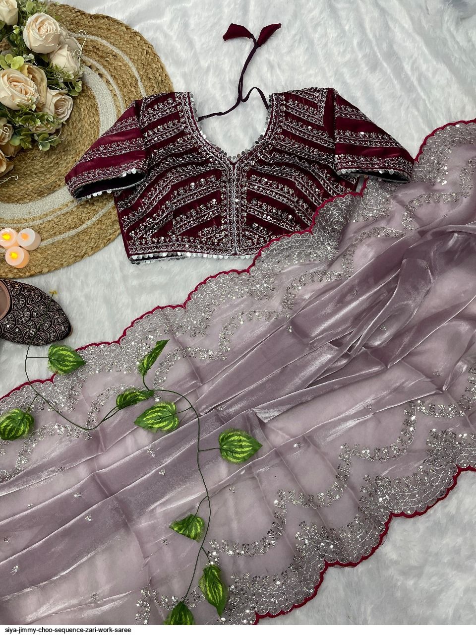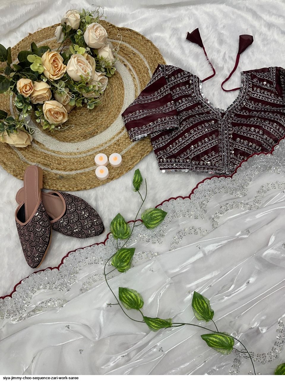 Fabric : Pure Jimmy Choo Satin Saree With Beautiful 3MM Sequence Zari (C-Pallu) Work And Arco Border