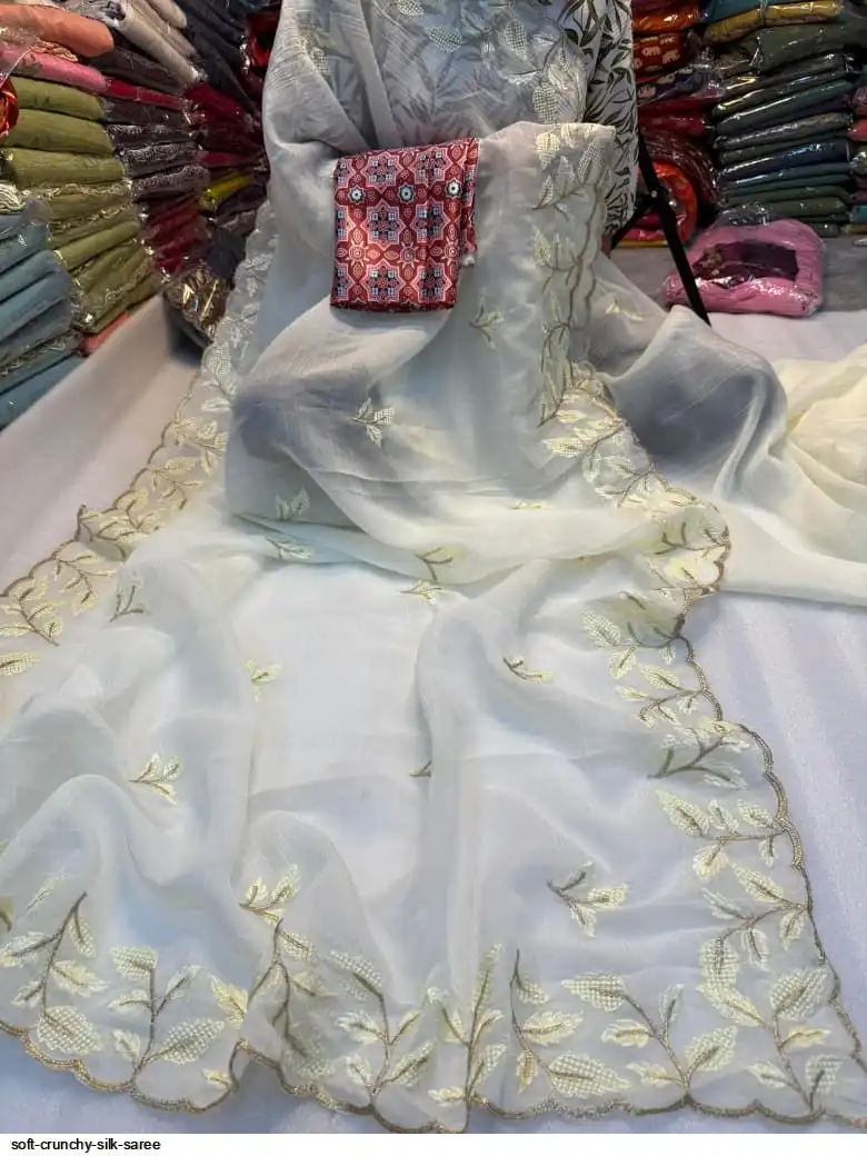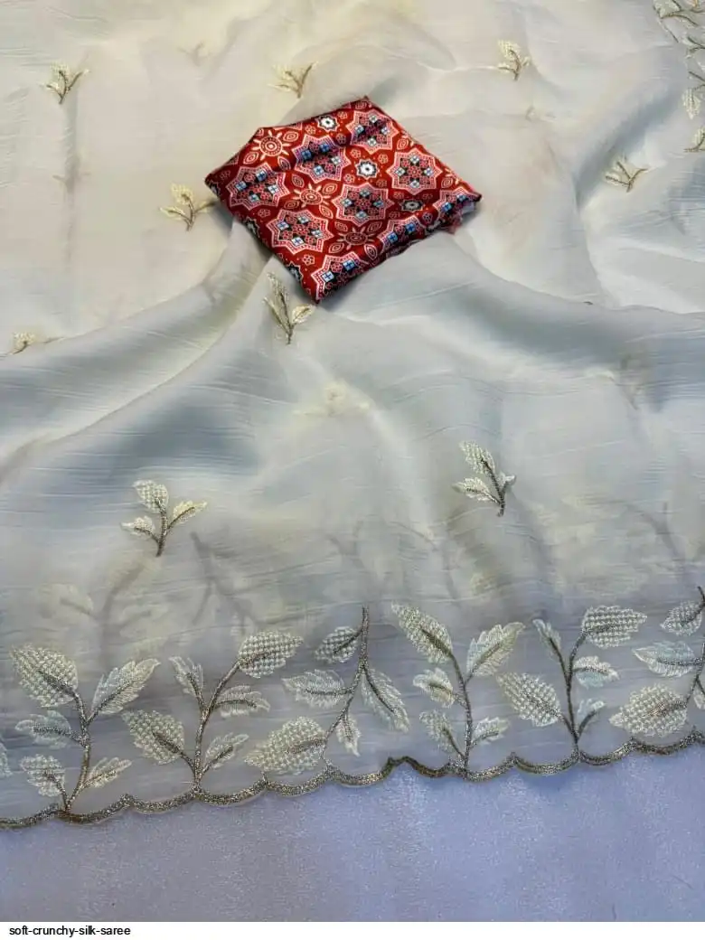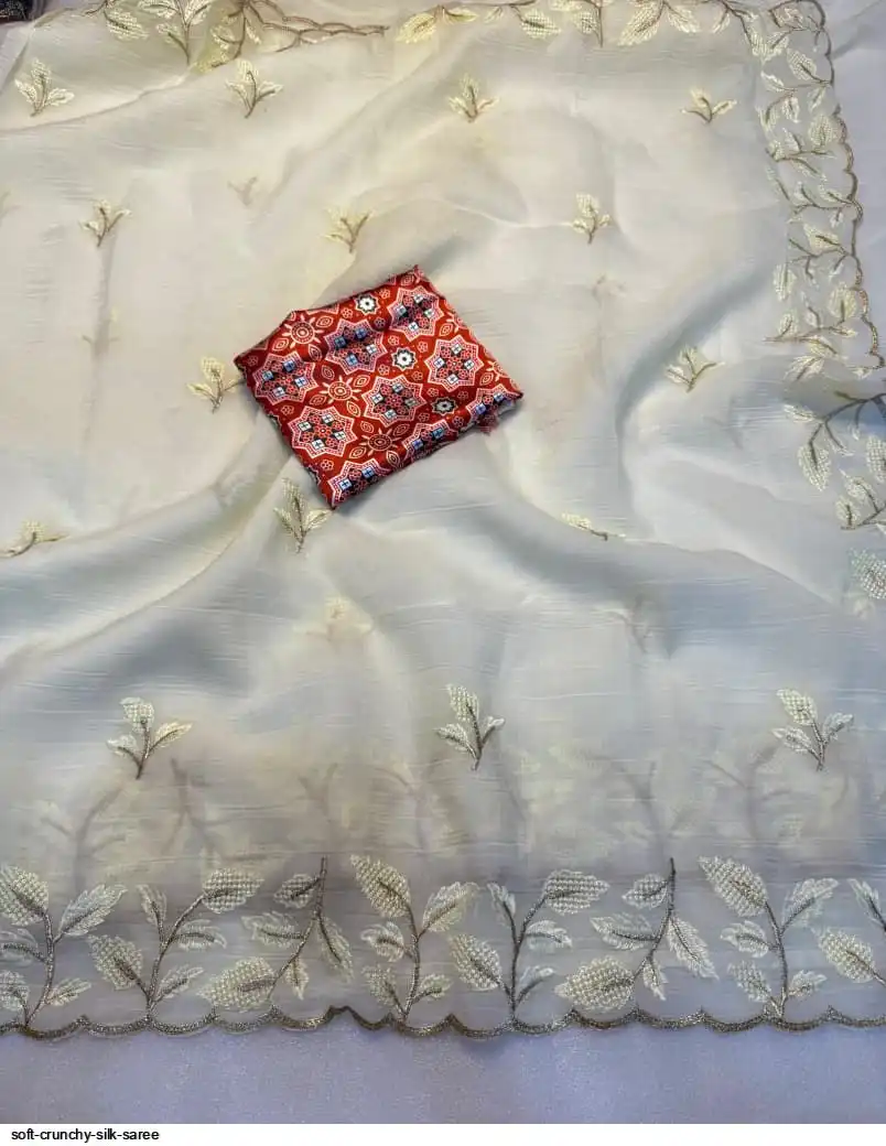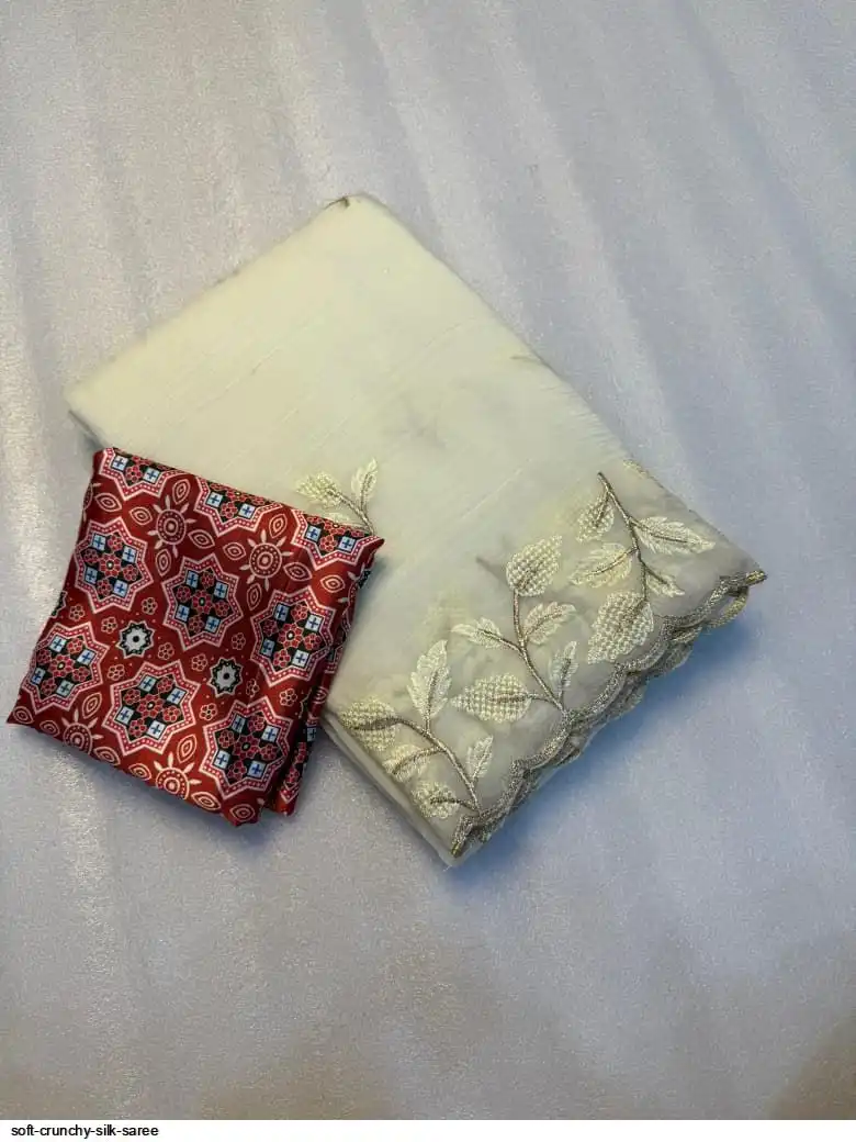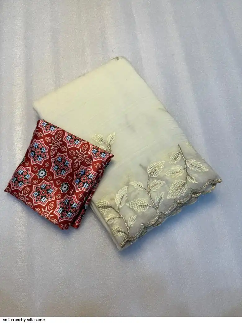 Soft crunchy silk saree with embroidery therd work with contrast digital blouse