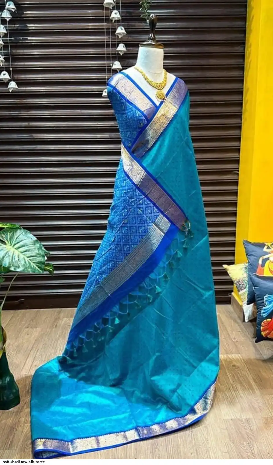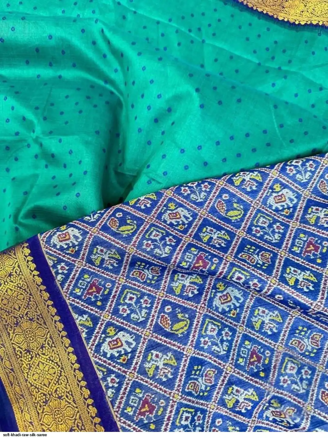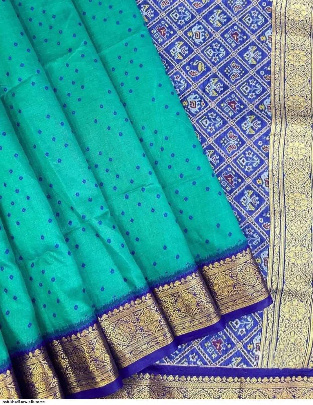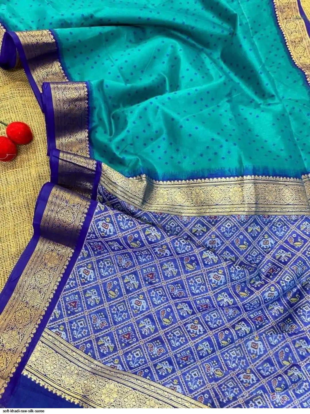 SOFT KHADI RAW SILK SAREE WITH CLASSIC PATOLA WEAVING PALLU AND ALL OVER BANDHANI WEAVING PATTERN AND ZARI WEAVING BORDER WITH FANCY TASSELS AND CONTRAST PATOLA WEAVE BLOUSE PIECE