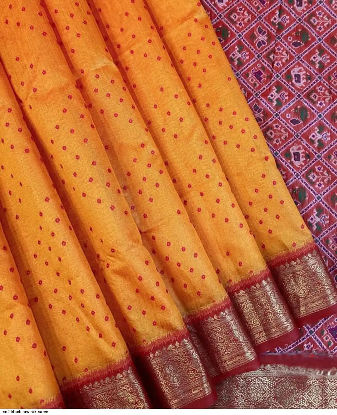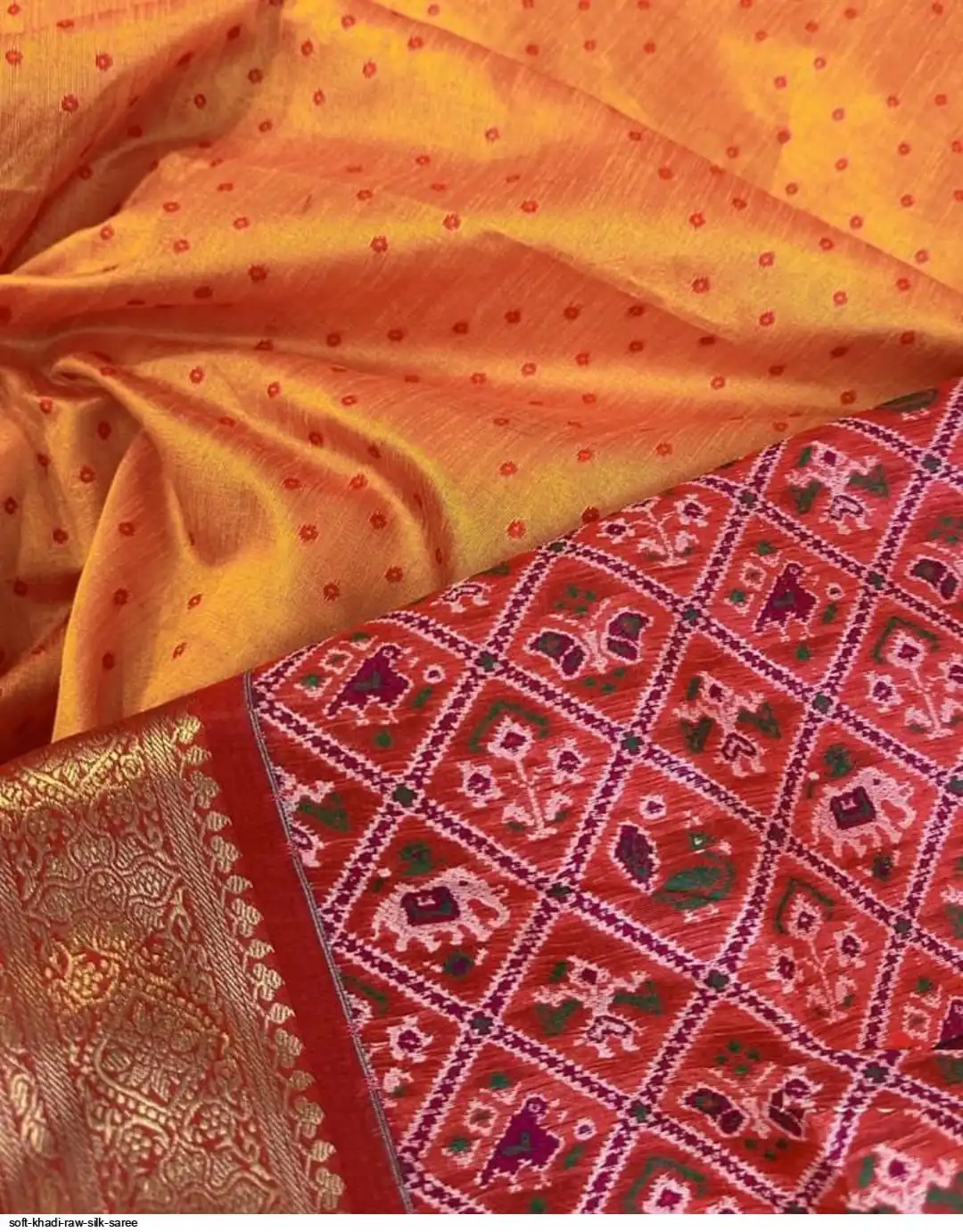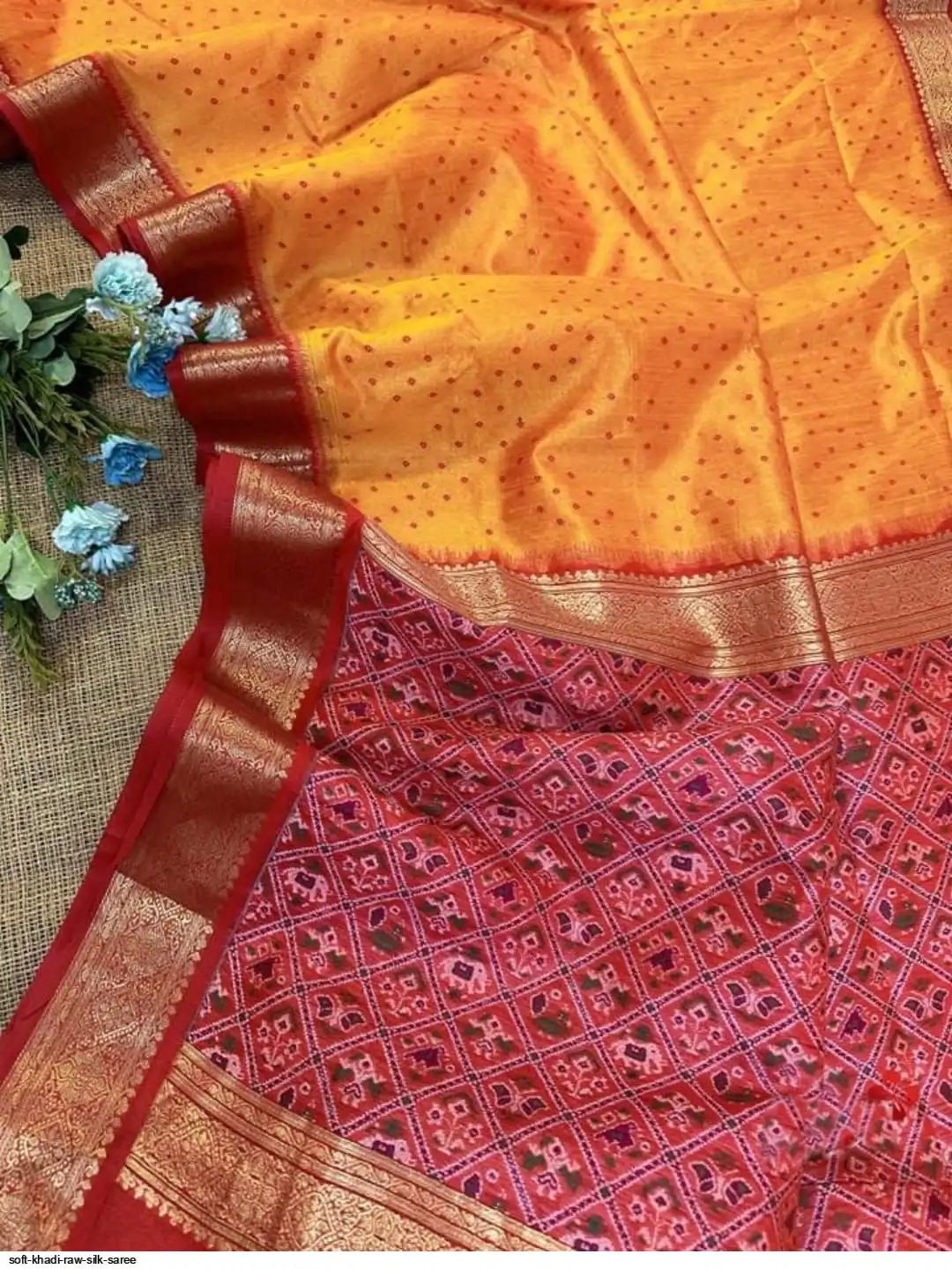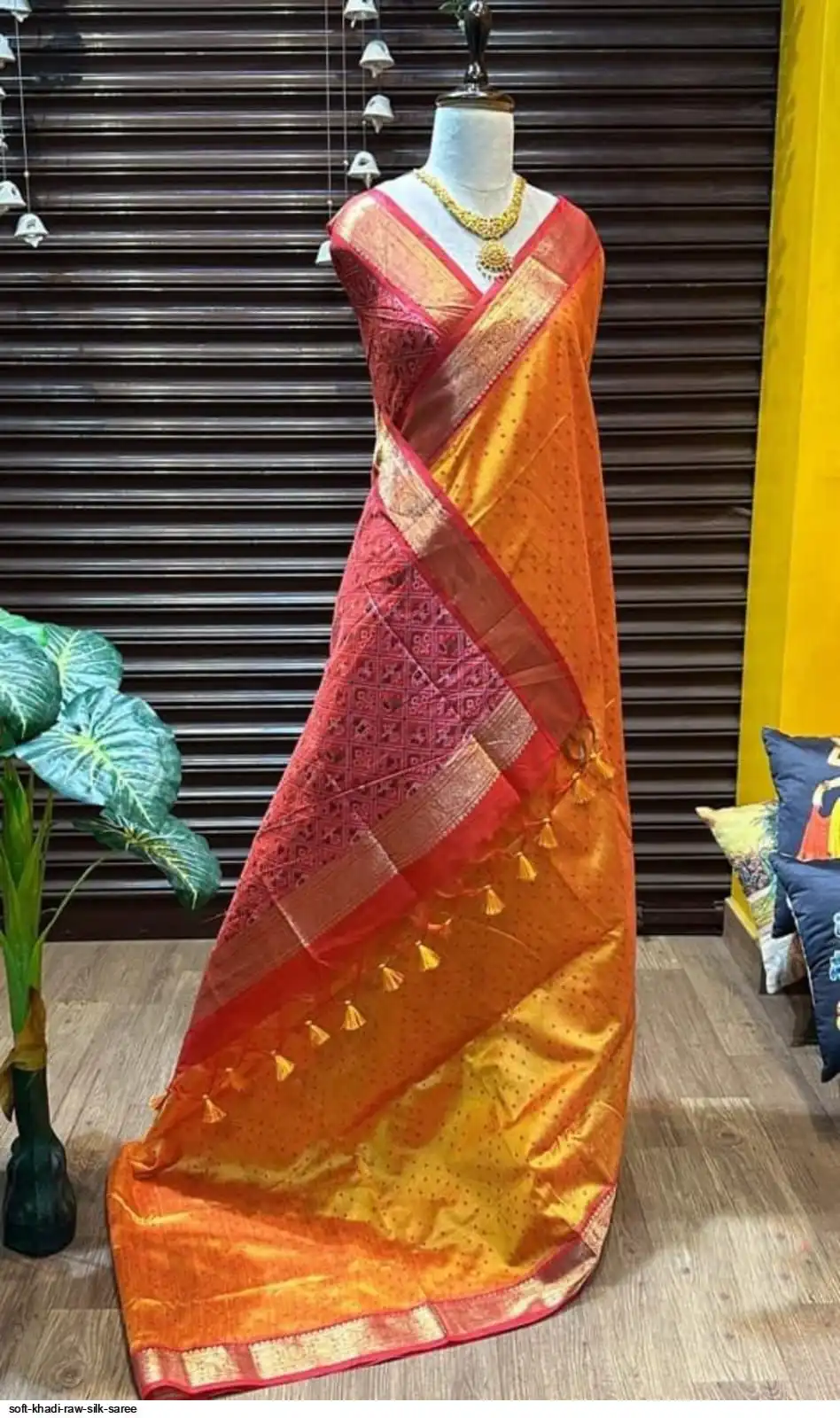SOFT KHADI RAW SILK SAREE WITH CLASSIC PATOLA WEAVING PALLU AND ALL OVER BANDHANI WEAVING PATTERN AND ZARI WEAVING BORDER WITH FANCY TASSELS AND CONTRAST PATOLA WEAVE BLOUSE PIECE