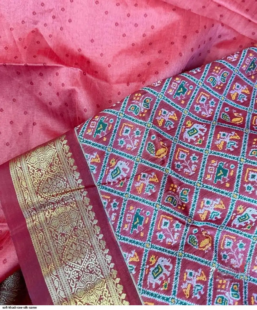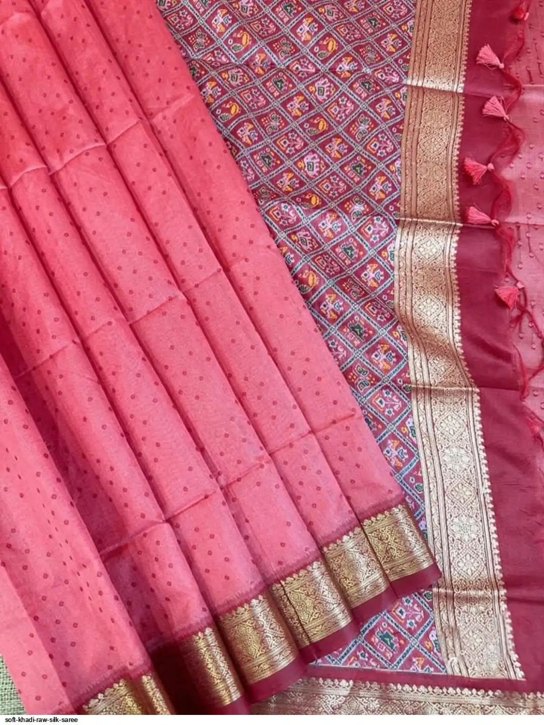 SOFT KHADI RAW SILK SAREE WITH CLASSIC PATOLA WEAVING PALLU AND ALL OVER BANDHANI WEAVING PATTERN AND ZARI WEAVING BORDER WITH FANCY TASSELS AND CONTRAST PATOLA WEAVE BLOUSE PIECE
