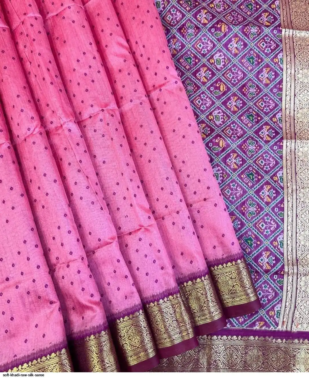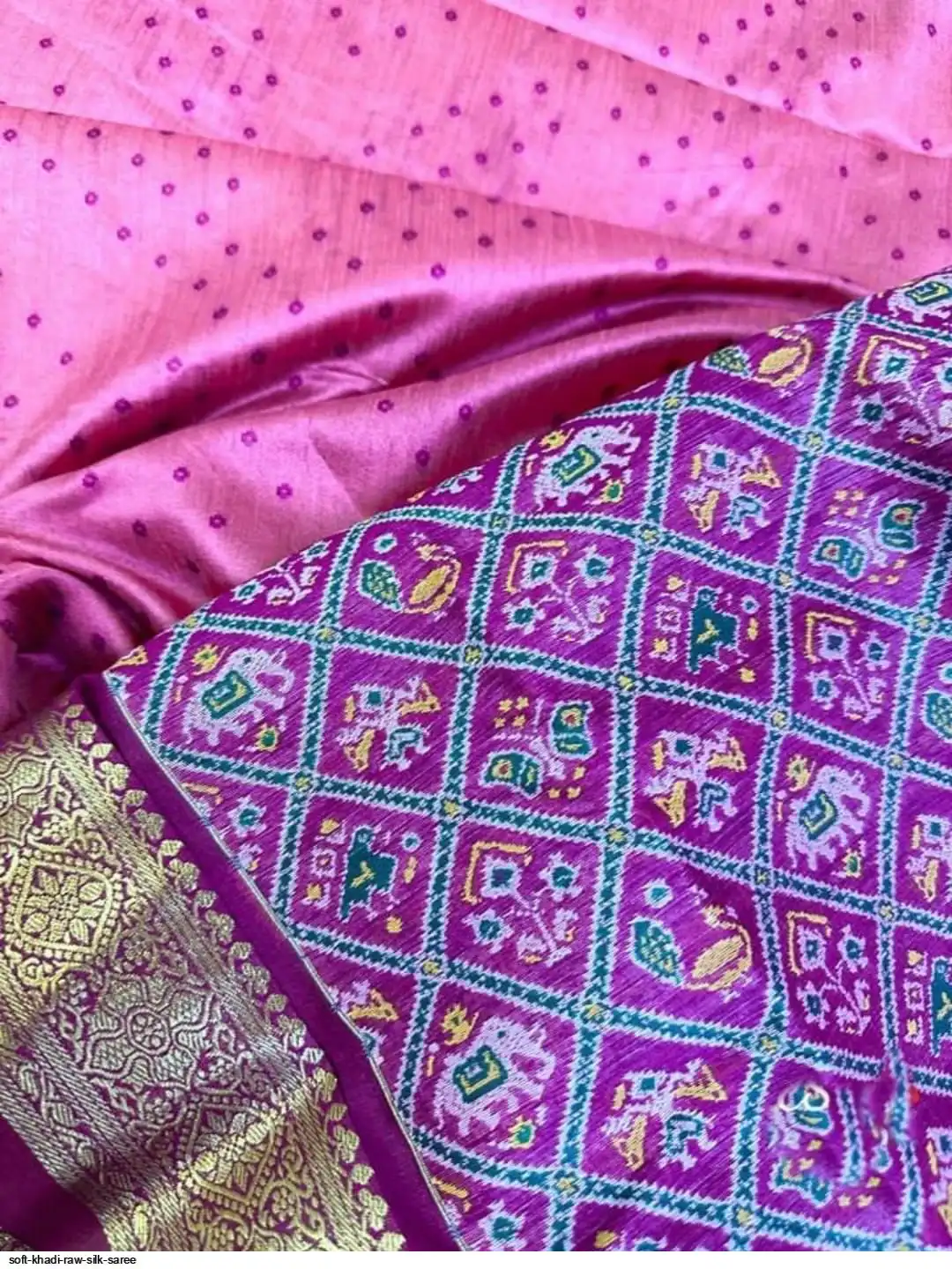 SOFT KHADI RAW SILK SAREE WITH CLASSIC PATOLA WEAVING PALLU AND ALL OVER BANDHANI WEAVING PATTERN AND ZARI WEAVING BORDER WITH FANCY TASSELS AND CONTRAST PATOLA WEAVE BLOUSE PIECE
