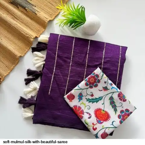 Soft mulmul silk with beautiful sequence work all over saree attach with handmade latkan and printed cotton blouse