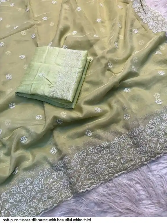 Soft pure tussar silk saree with beautiful white therd embroidery work c pallu with embroidery work blouse