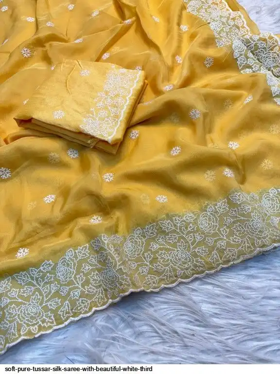 Soft pure tussar silk saree with beautiful white therd embroidery work c pallu with embroidery work blouse