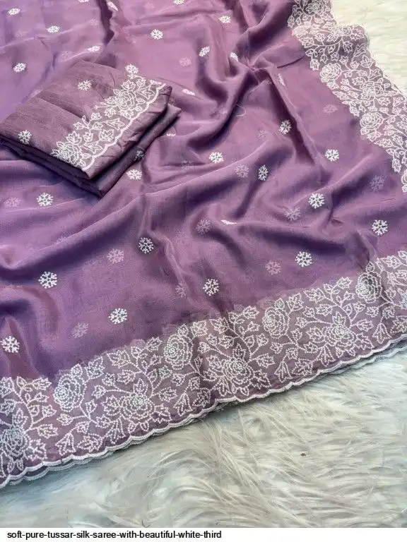 Soft pure tussar silk saree with beautiful white therd embroidery work c pallu with embroidery work blouse