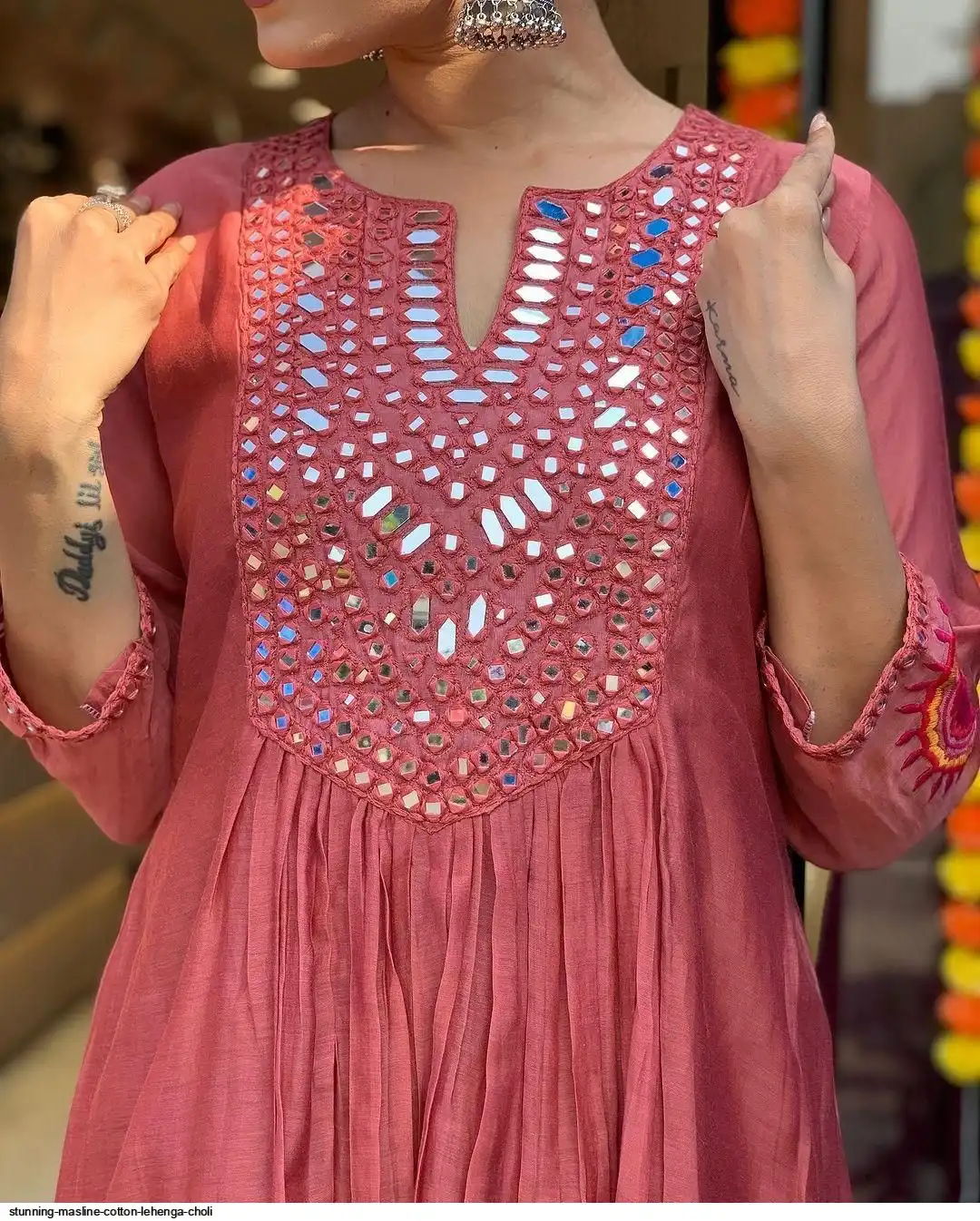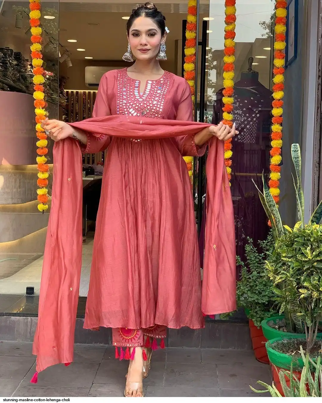 The outfit is made of Masline cotton giving it a smooth and luxurious feel. The set includes a long kurti, matching pants, and a dupatta. Embroidery & Mirror Work in kurti features intricate mirror work on the neckline, adding a striking appeal. The sleeves have embroidery and mirror work near the cuffs, 🪻enhancing the design. The pants have embroidery and mirror work on the bottom side, making them visually appealing. The outfit is in a beautiful purple & pinkish-red shade, perfect for festive and ethnic occasions.
