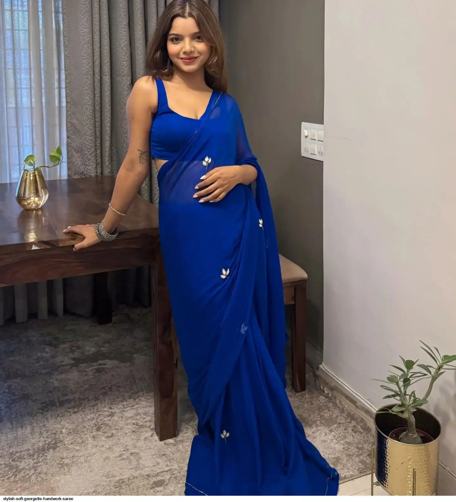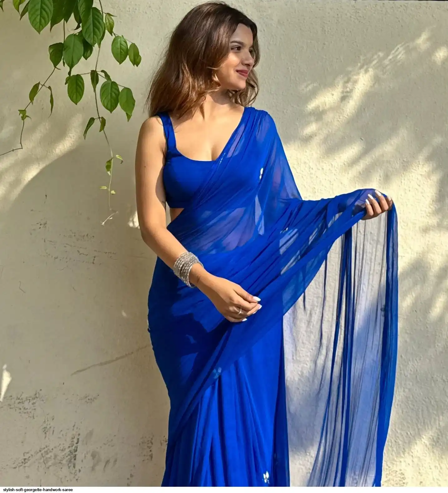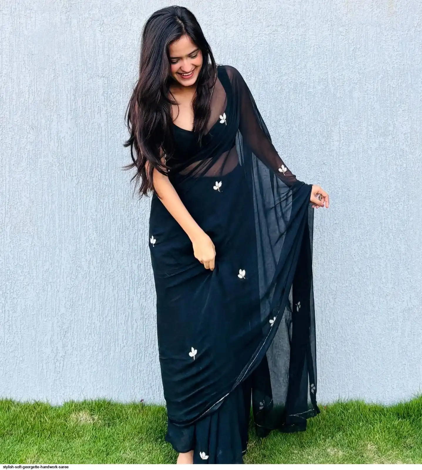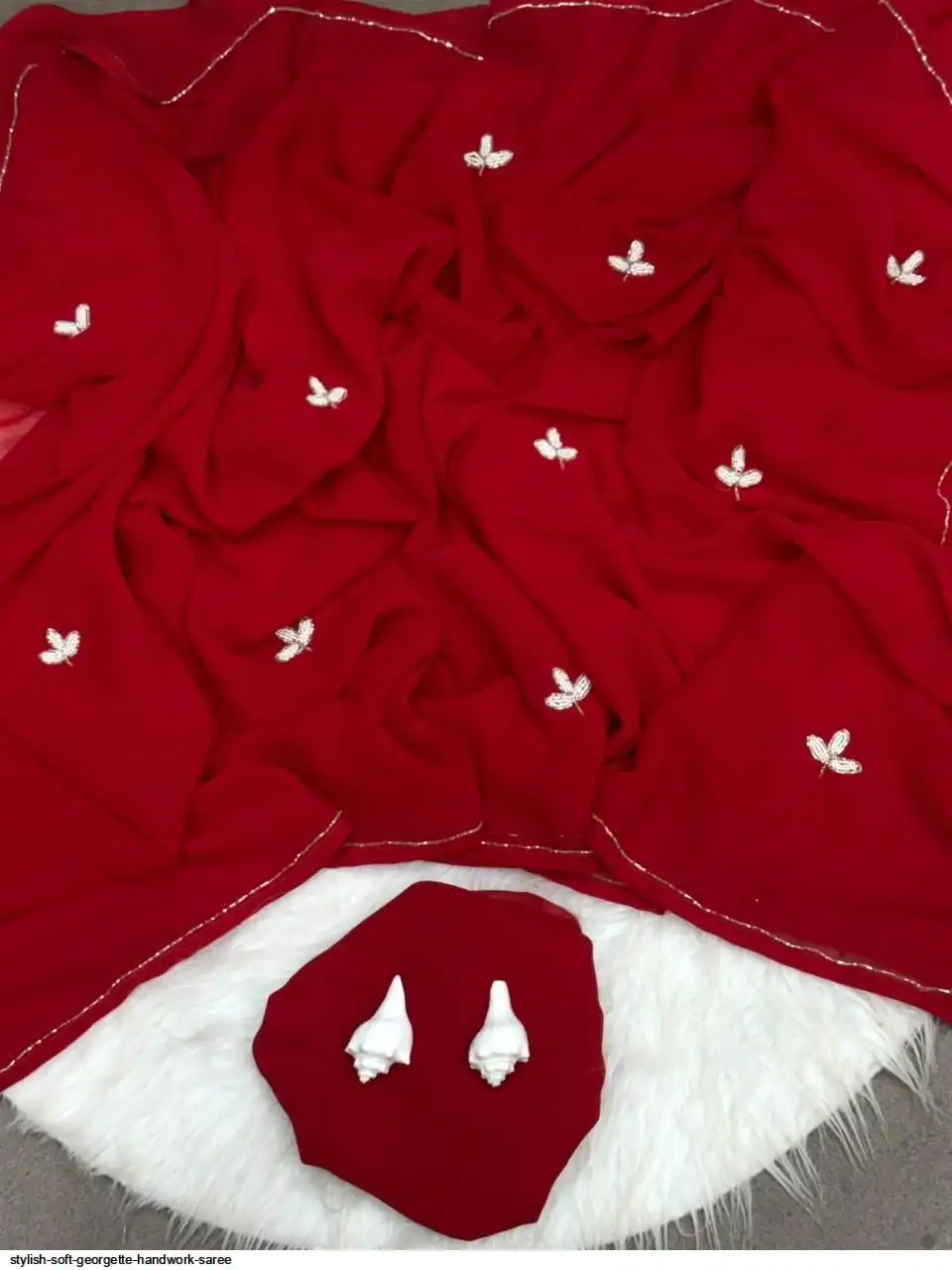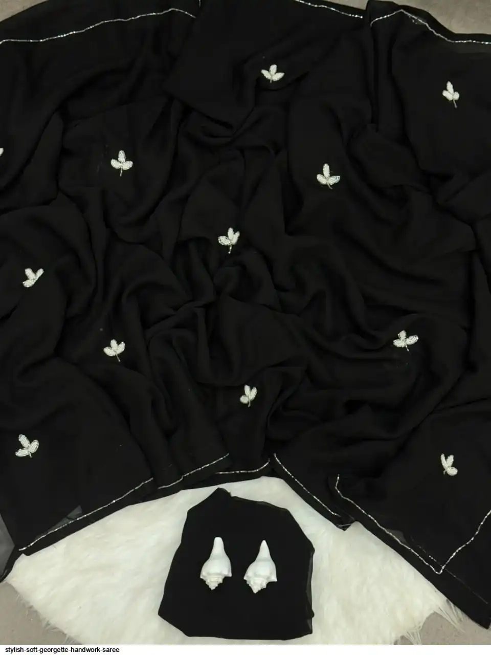SOFT GEORGETTE DINNER SAREE WITH HANDWORK CUT DANA LEAF WITH SILVER CUT DANA HANDWORK LINE BODER