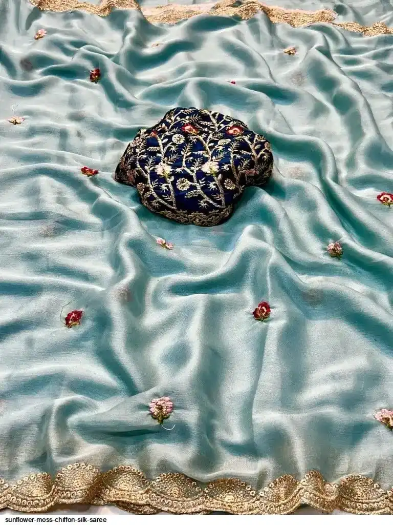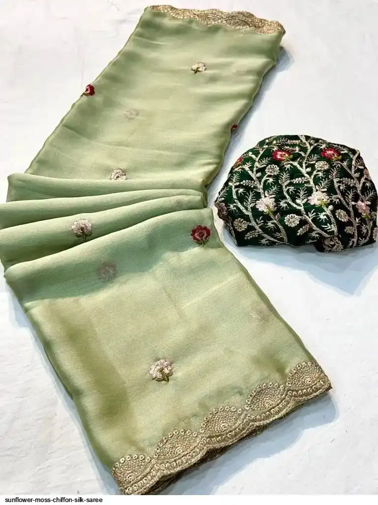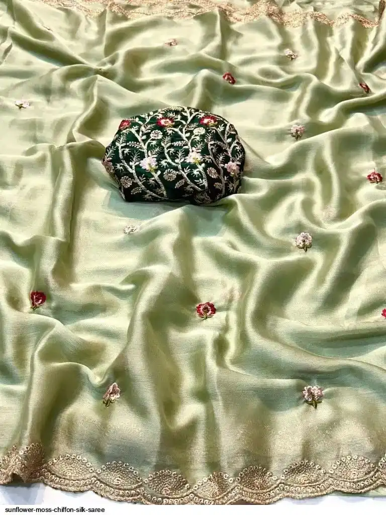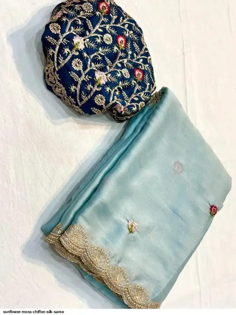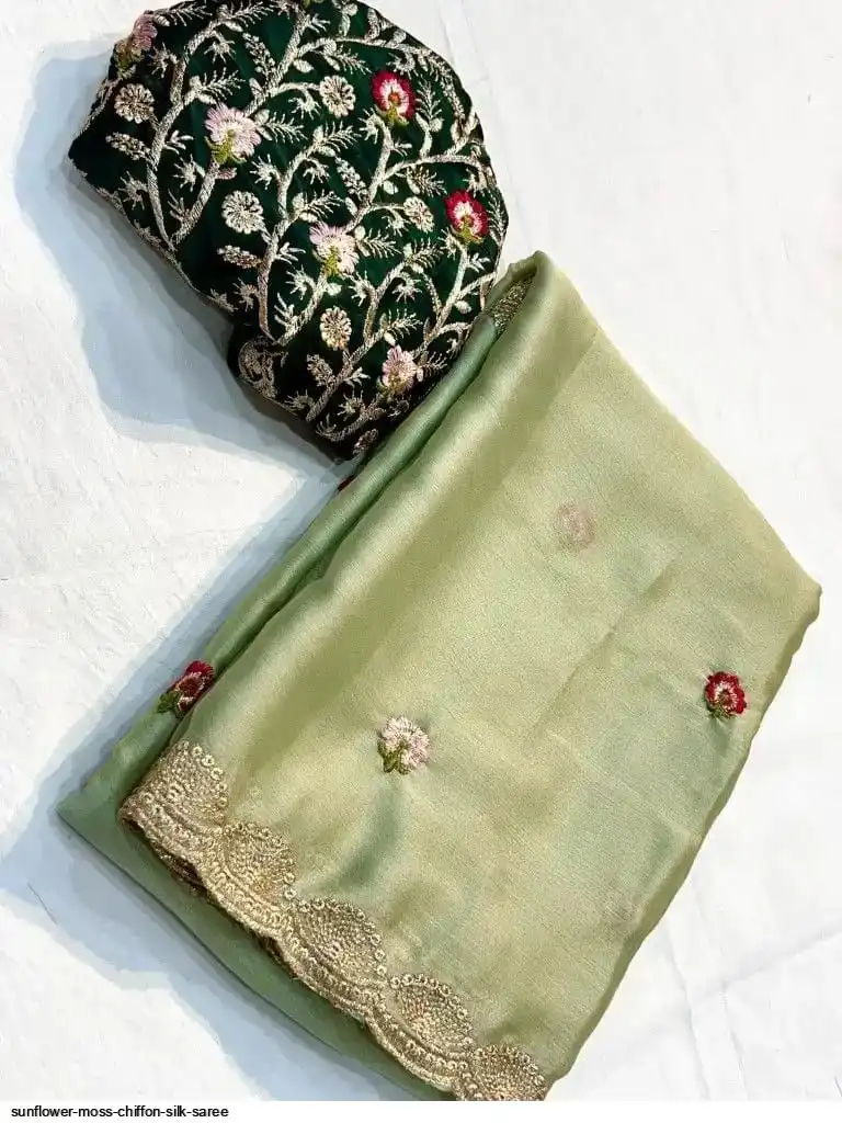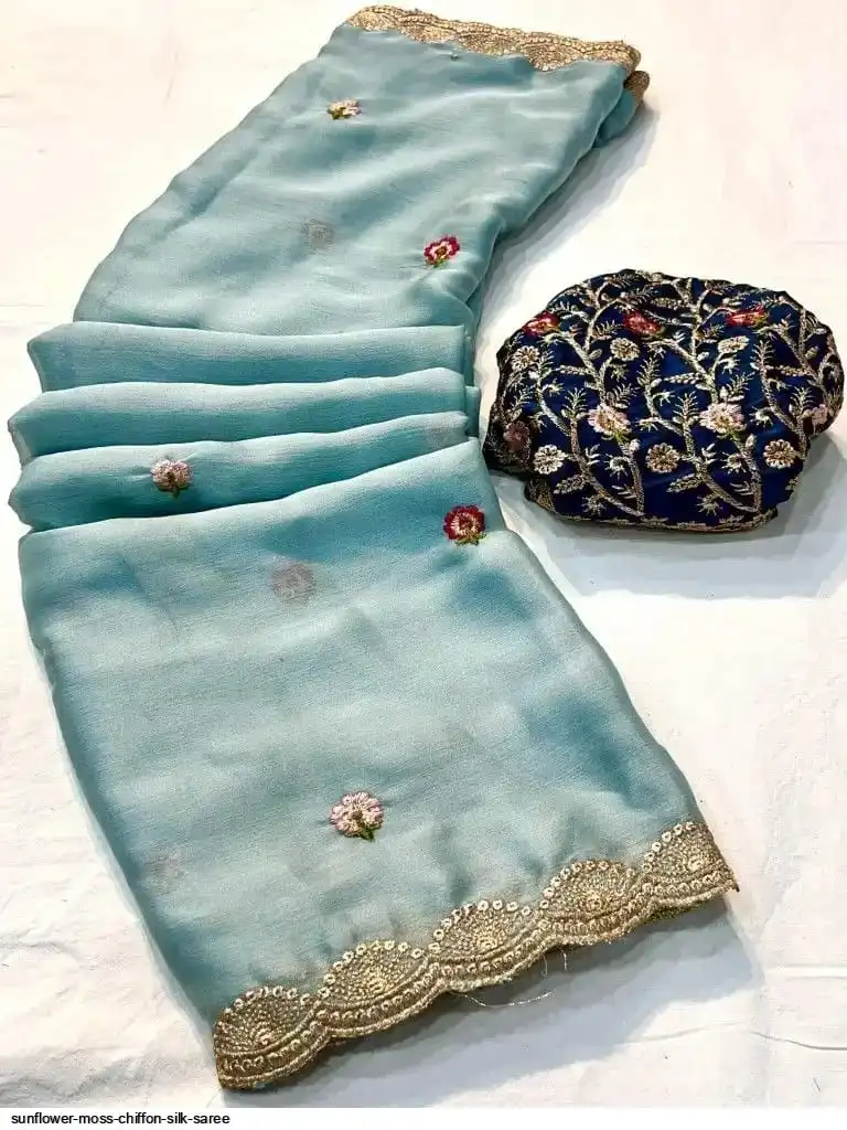 Moss Chiffon silk saree with Multi Emrodiry Work attached with embroidery Work & Rangoli Silk Blouse