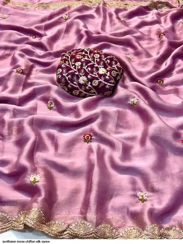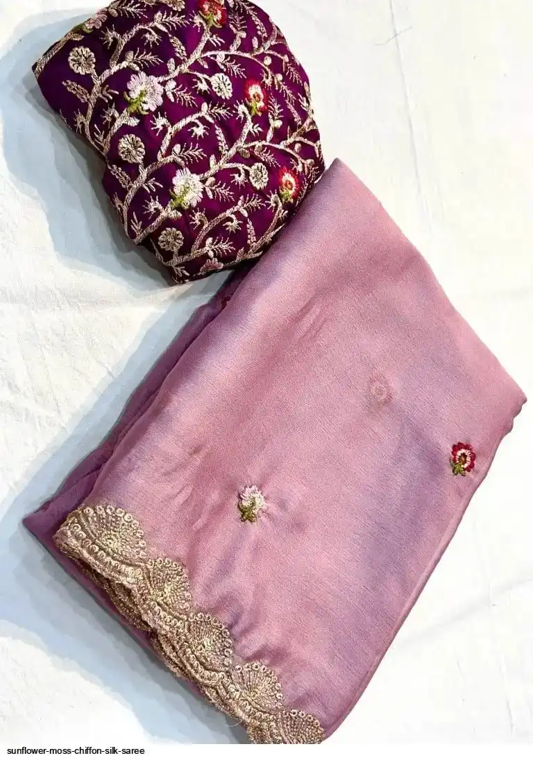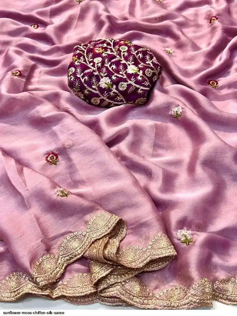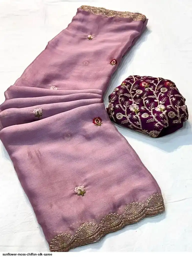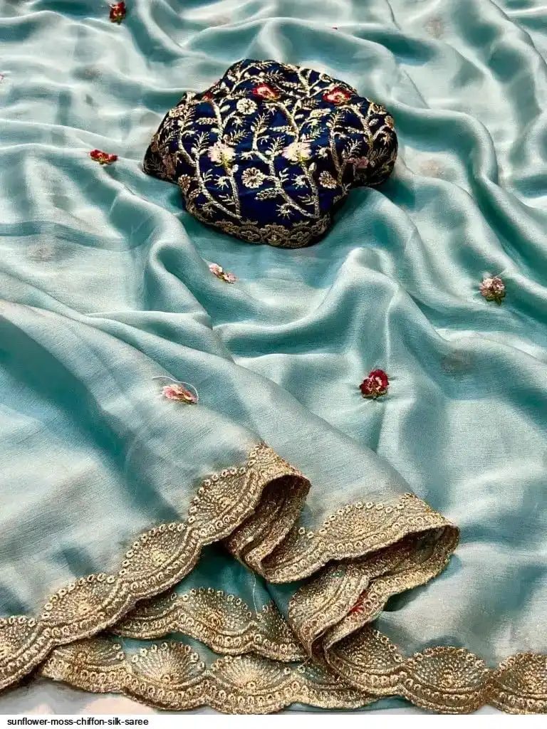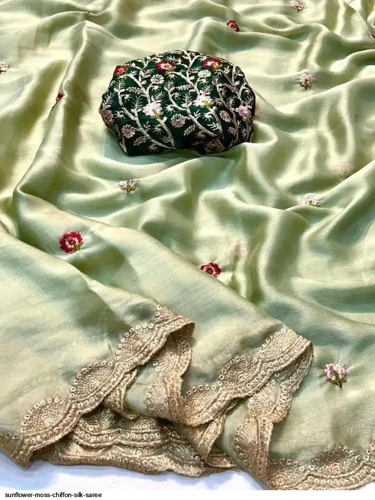 Moss Chiffon silk saree with Multi Emrodiry Work attached with embroidery Work & Rangoli Silk Blouse
