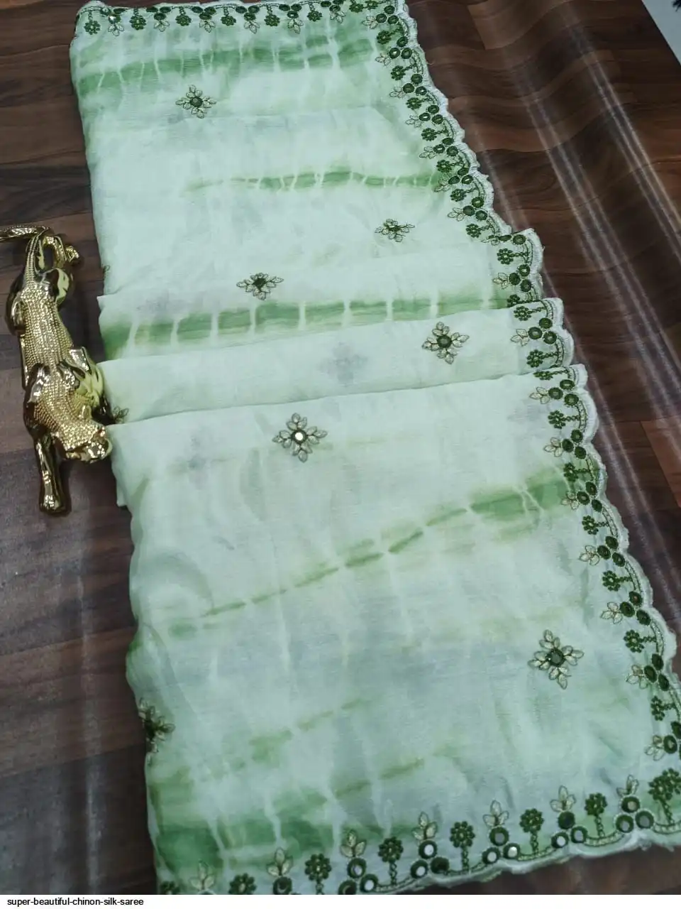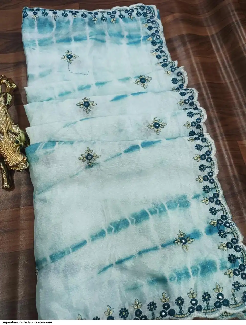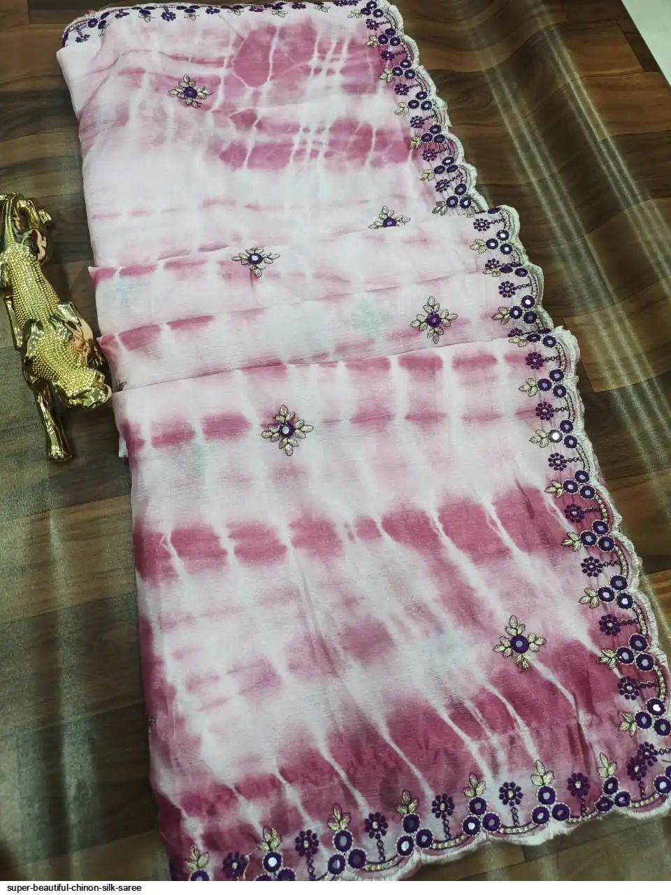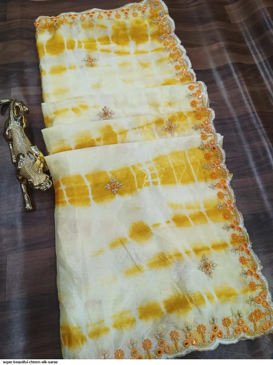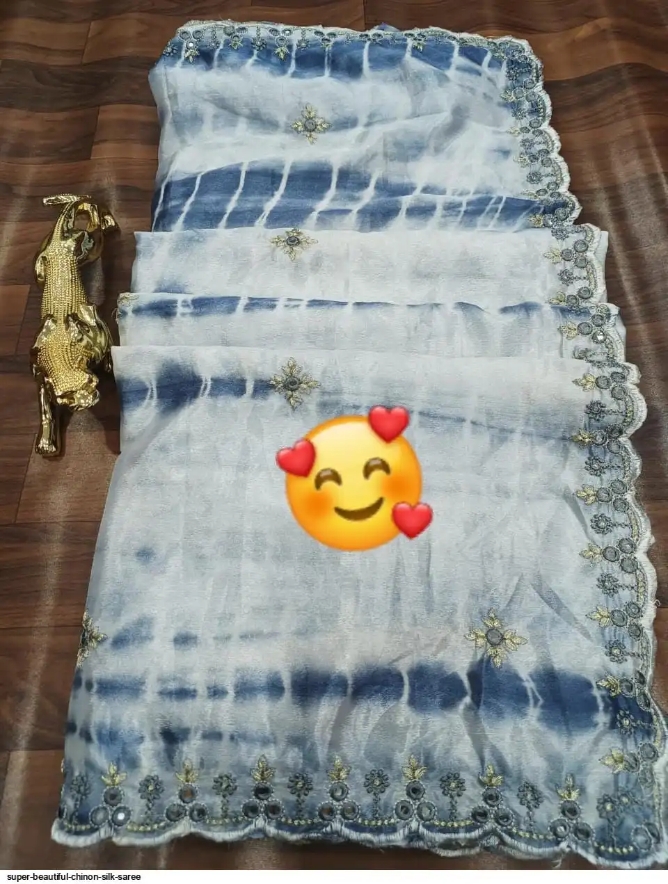 New super beautiful chinon silk saree fabric and beautiful gotta dhaga with shibori print and mirror penal work border in all over saree with beautiful zari weaving with siqqwance work in all over blouse
