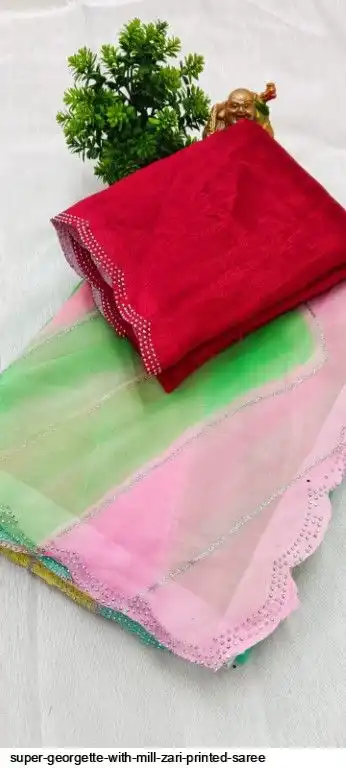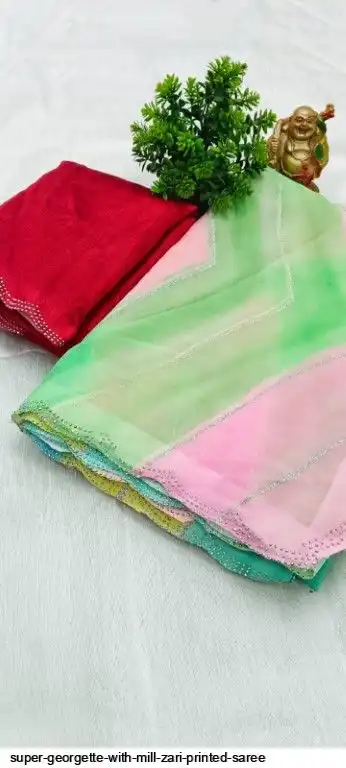Quality- Super Georgette with mill zari printed allover saree with diamond arco border.