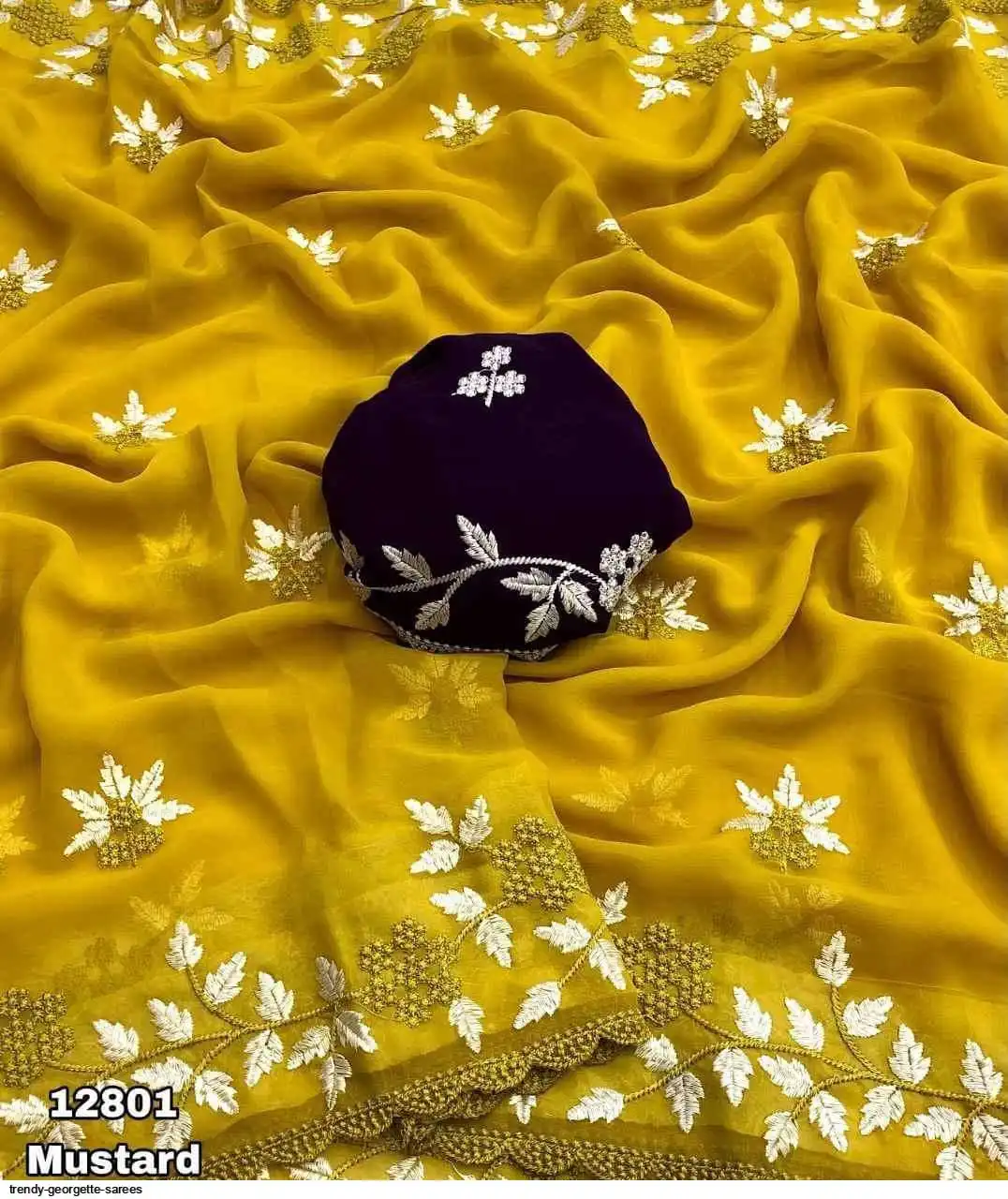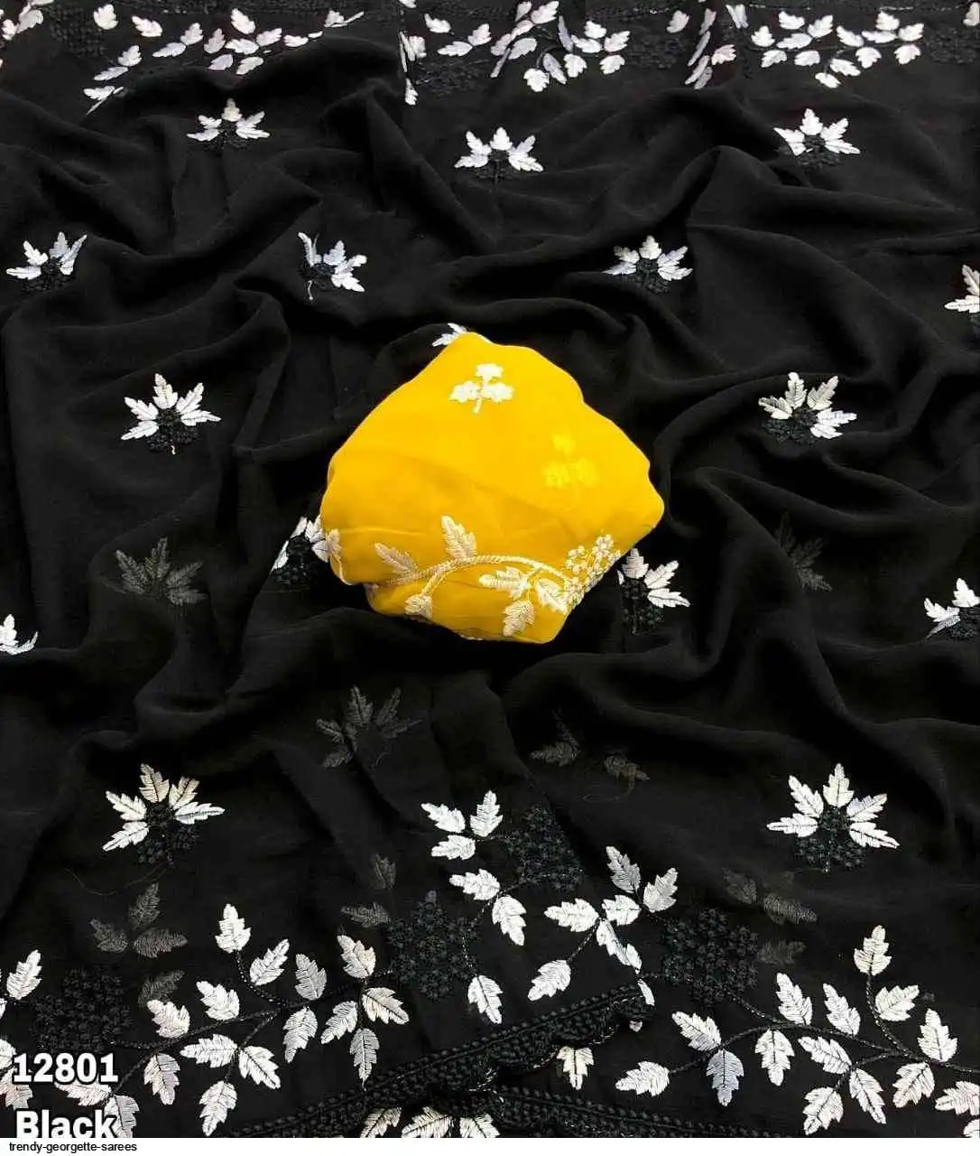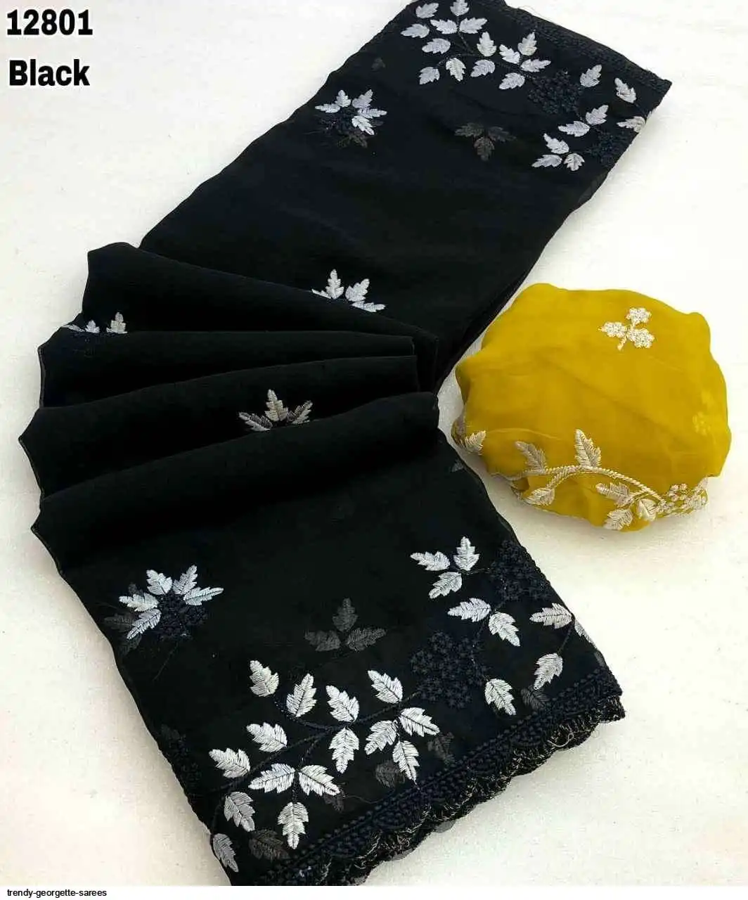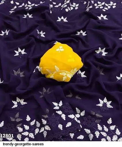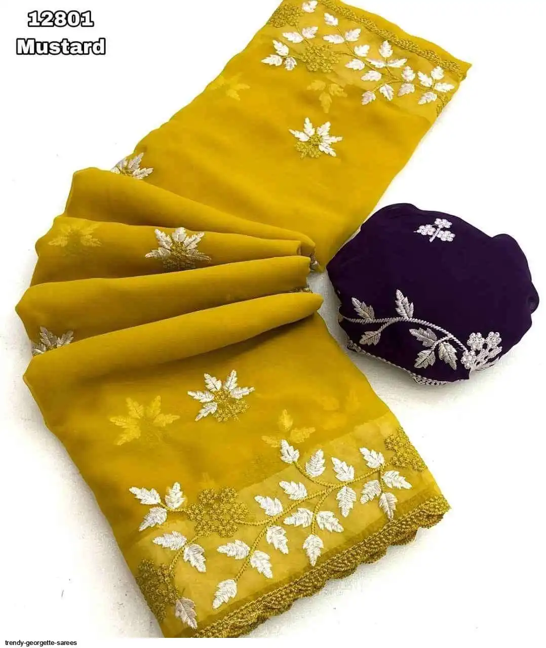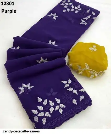 fabric : Georgette Saree With Georgette contrast Emrodiry Work Blouse.