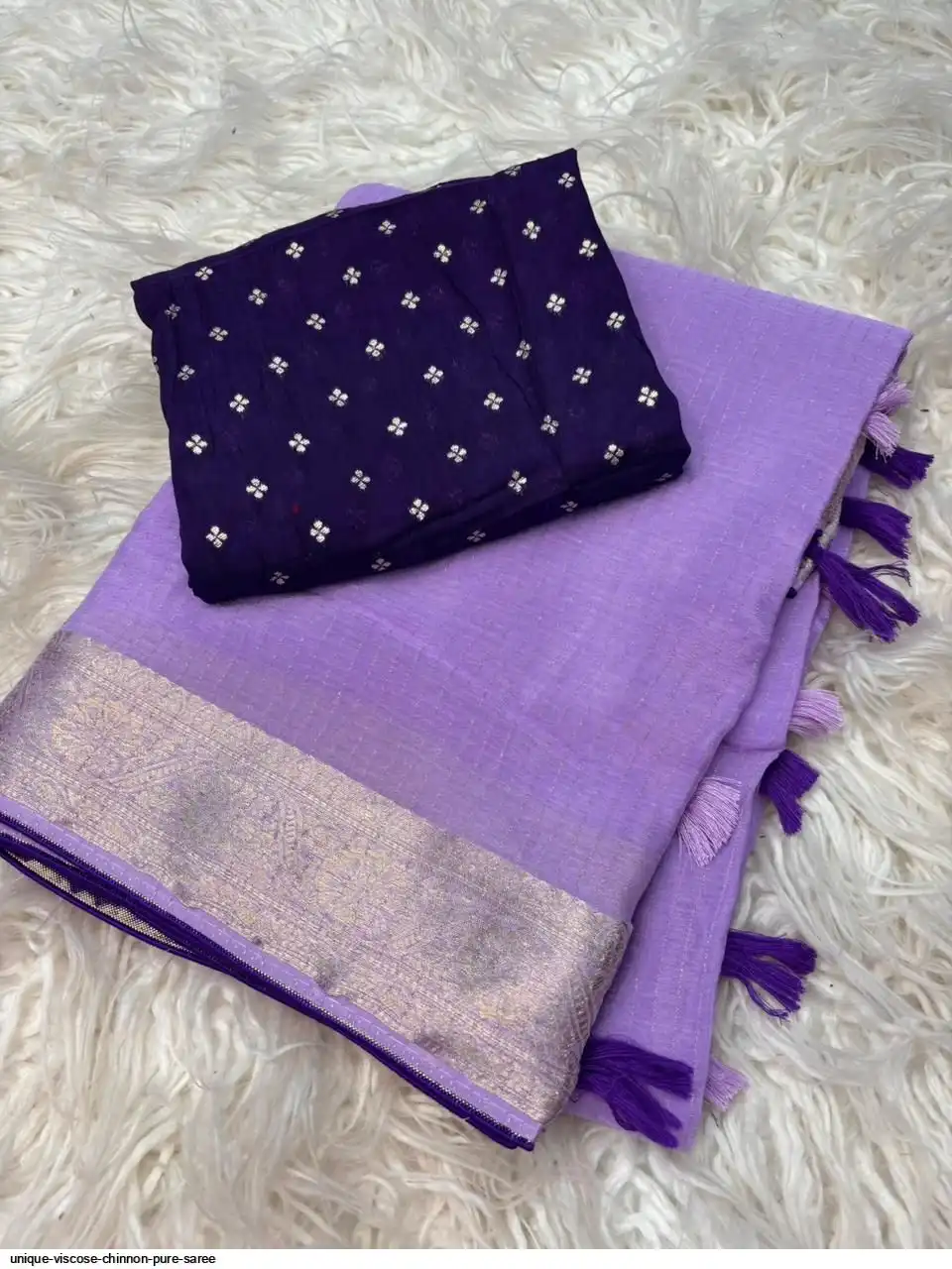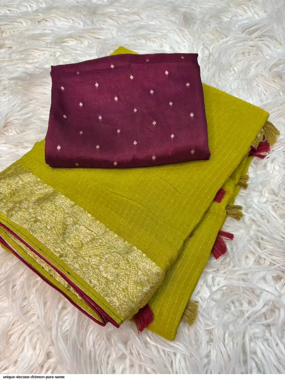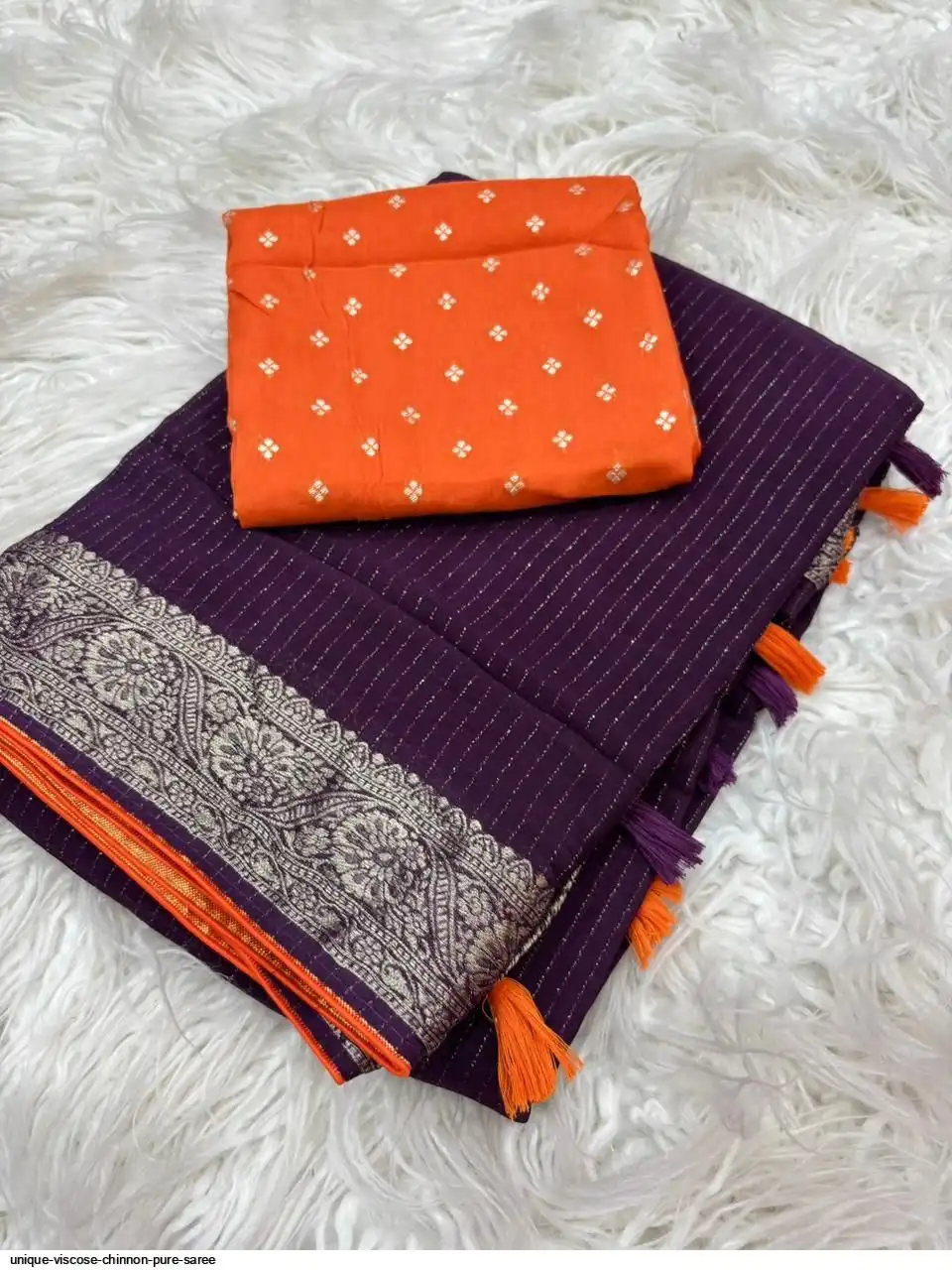 Pure viscose Chinnon saree with pipping finishing and jacquard border with contrast matching jacquard blouse