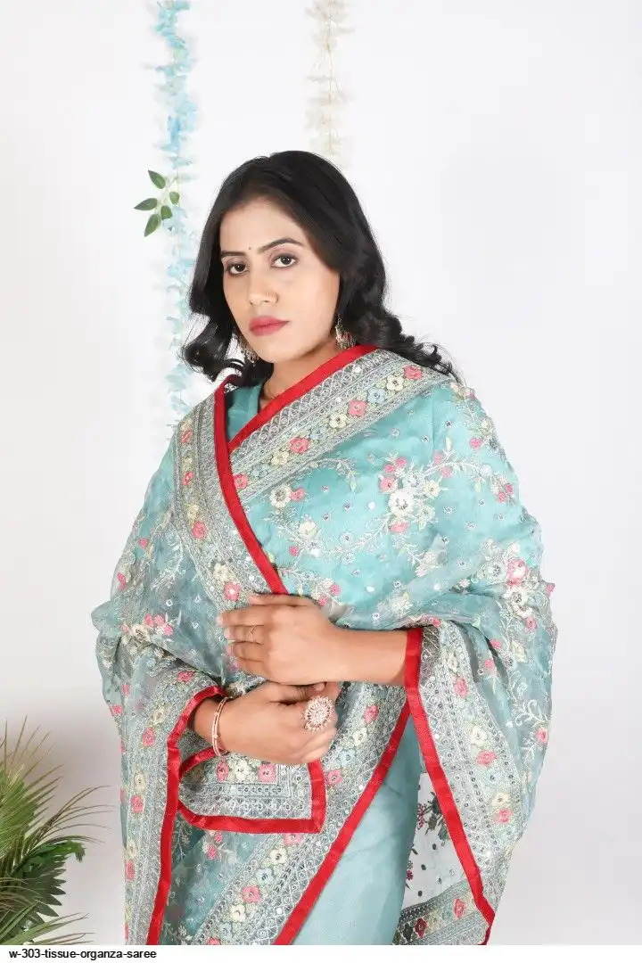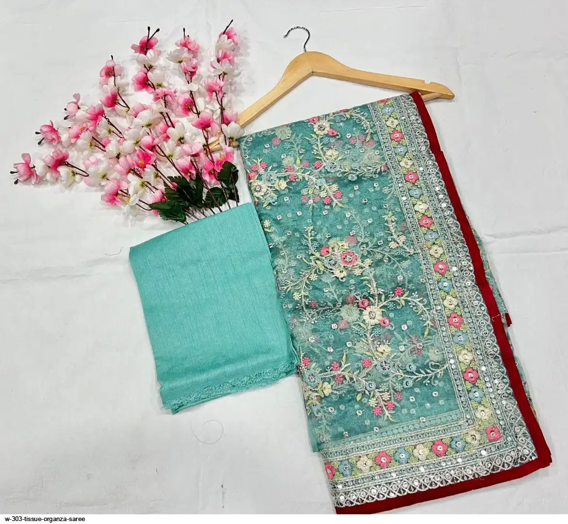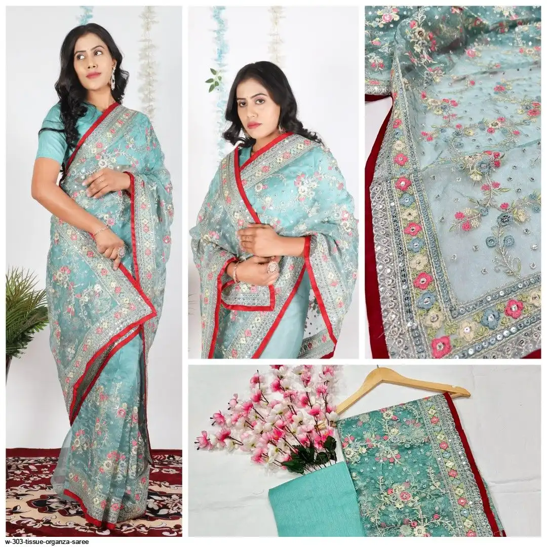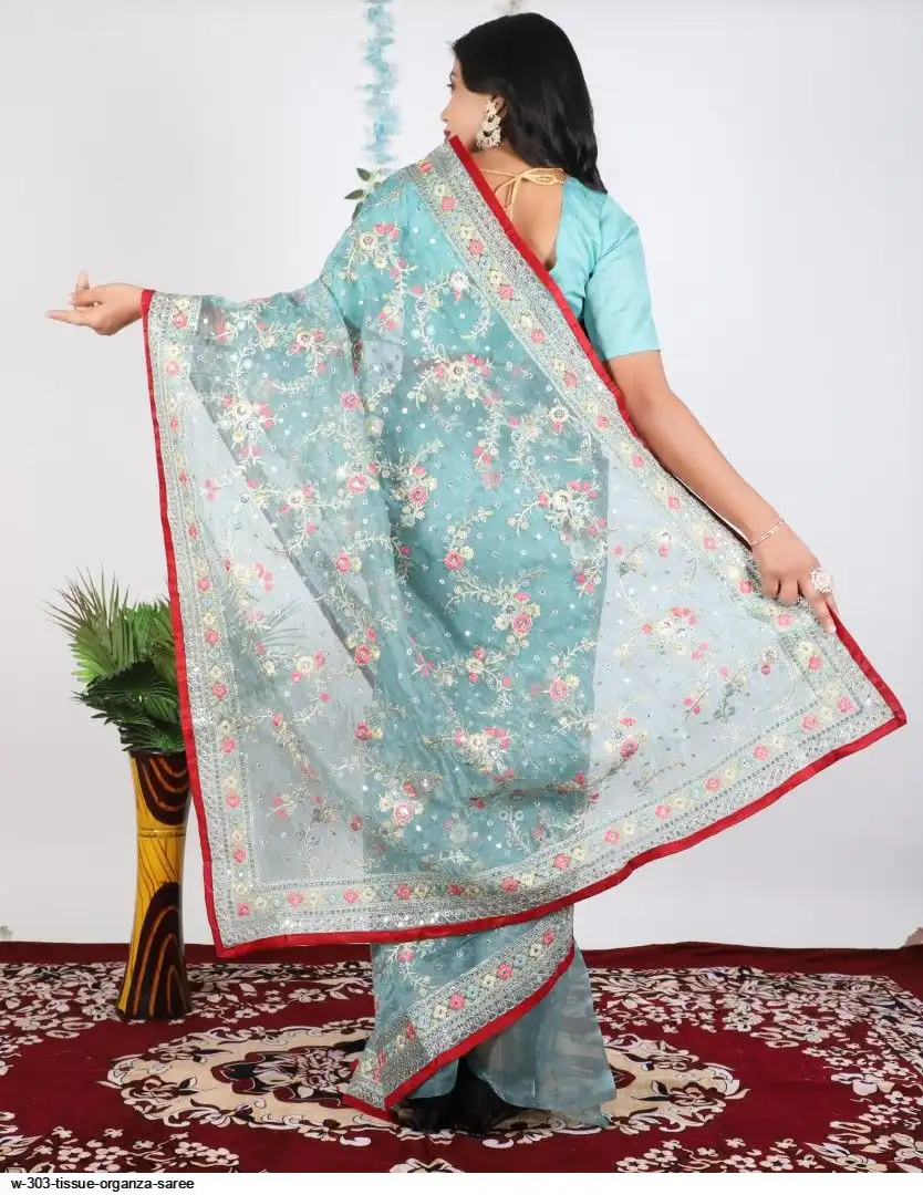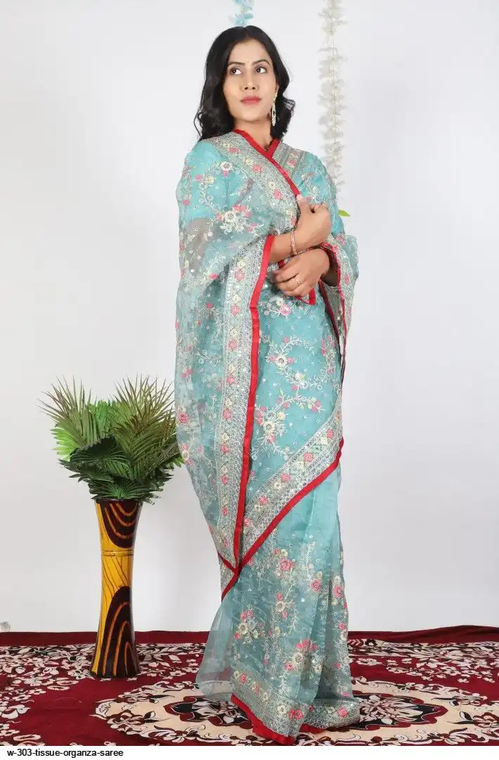 SAREE :- Tissue Organza With Beautiful Zari + Multi + 5 M.M Sequence Embroidery C-Pallu Work